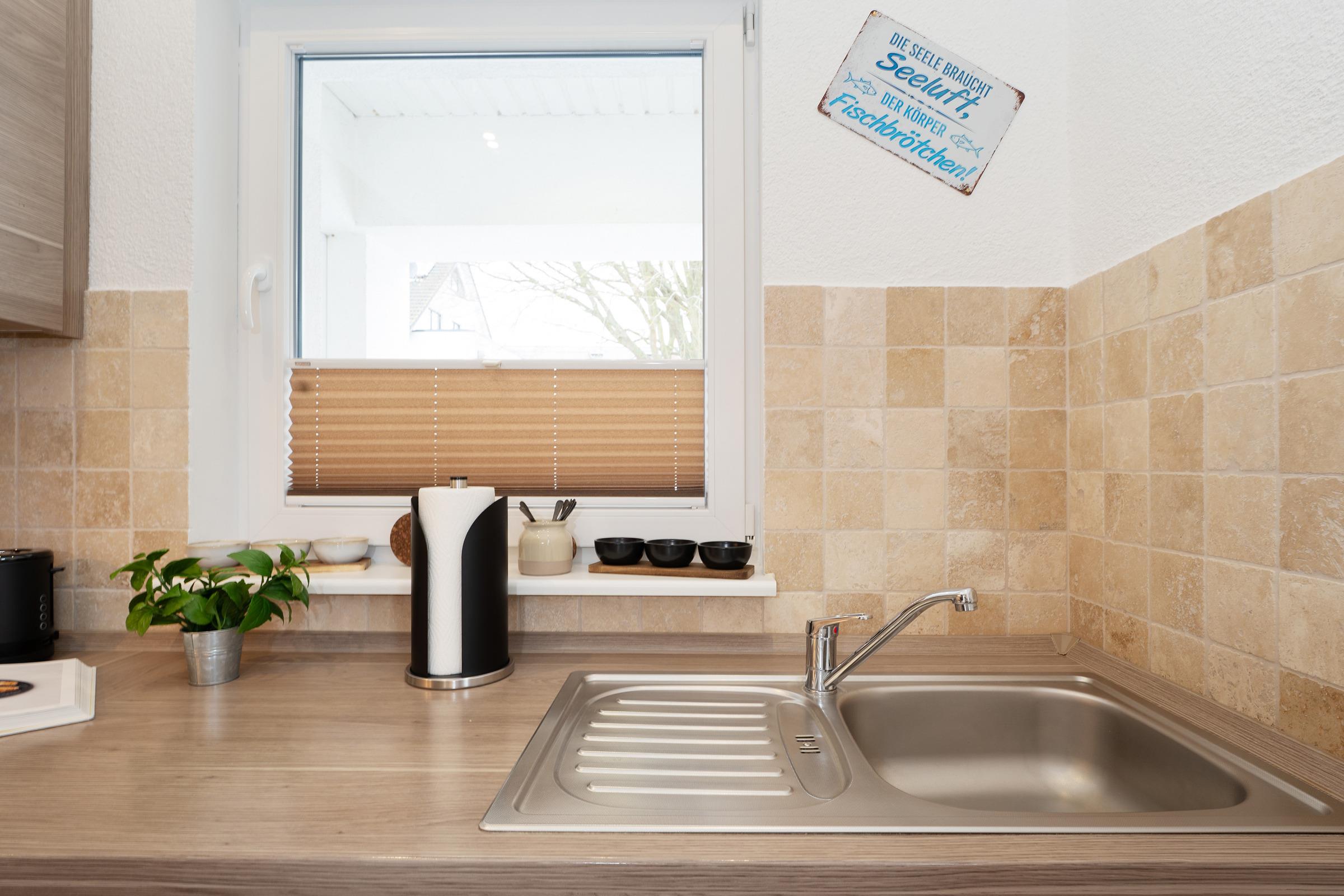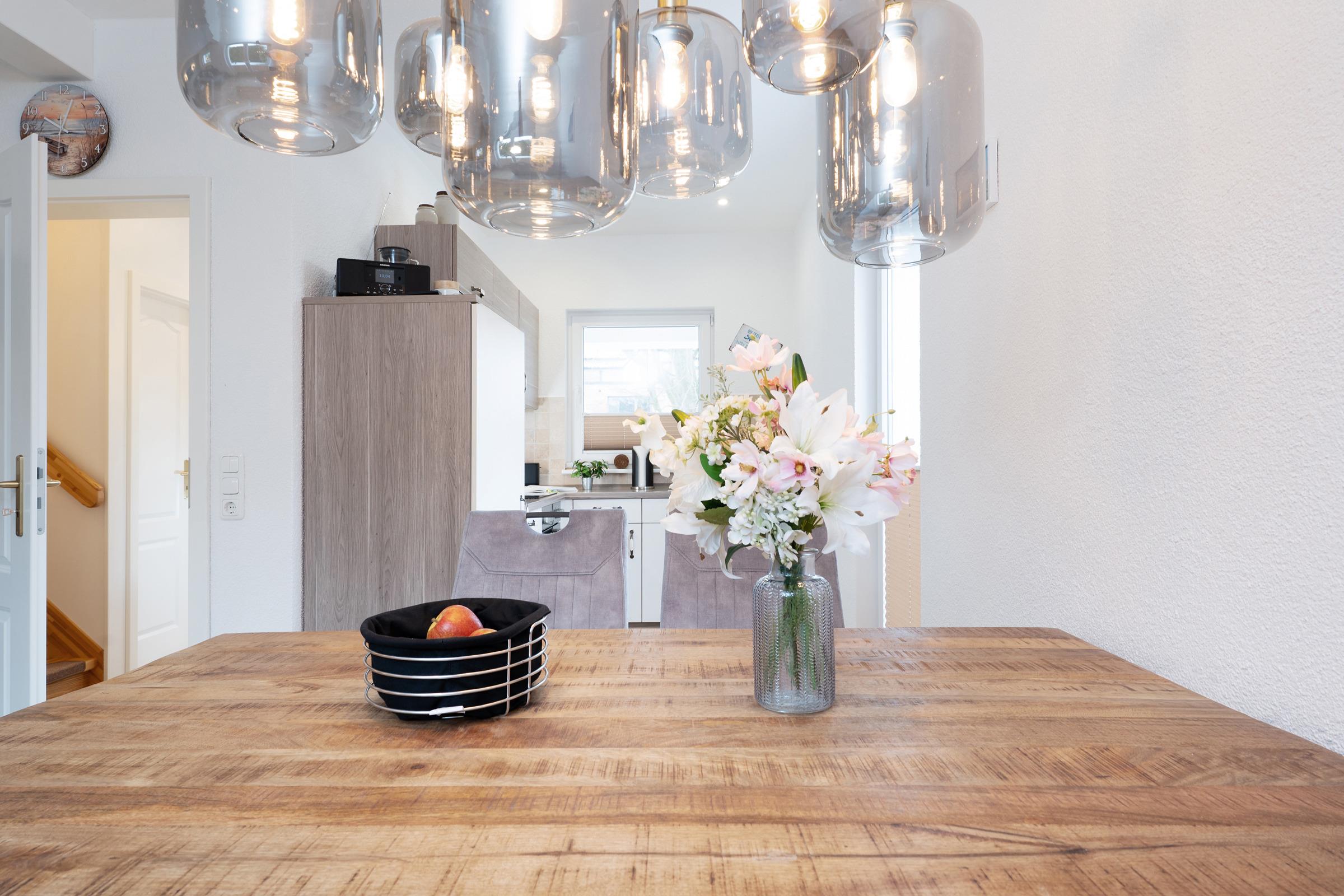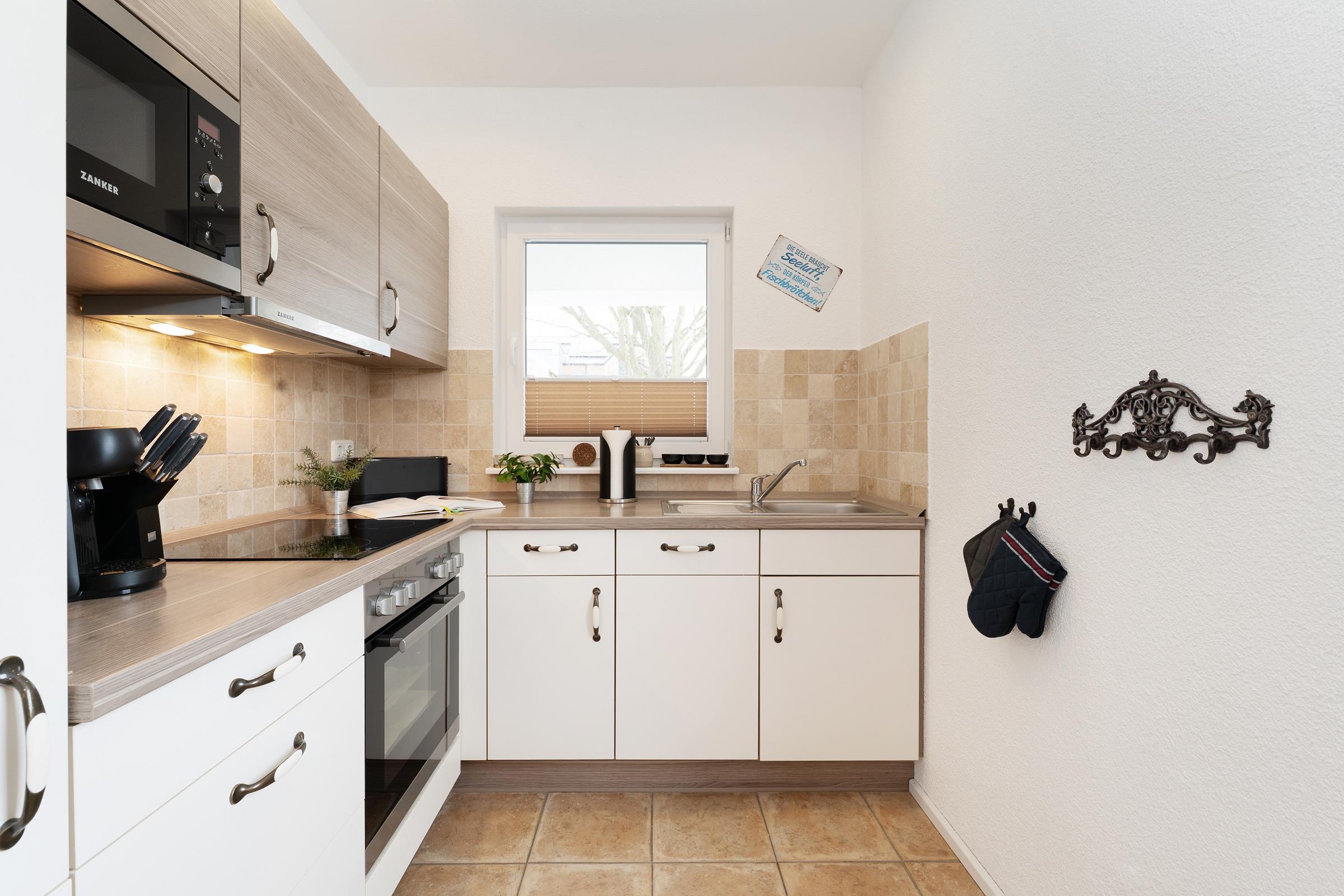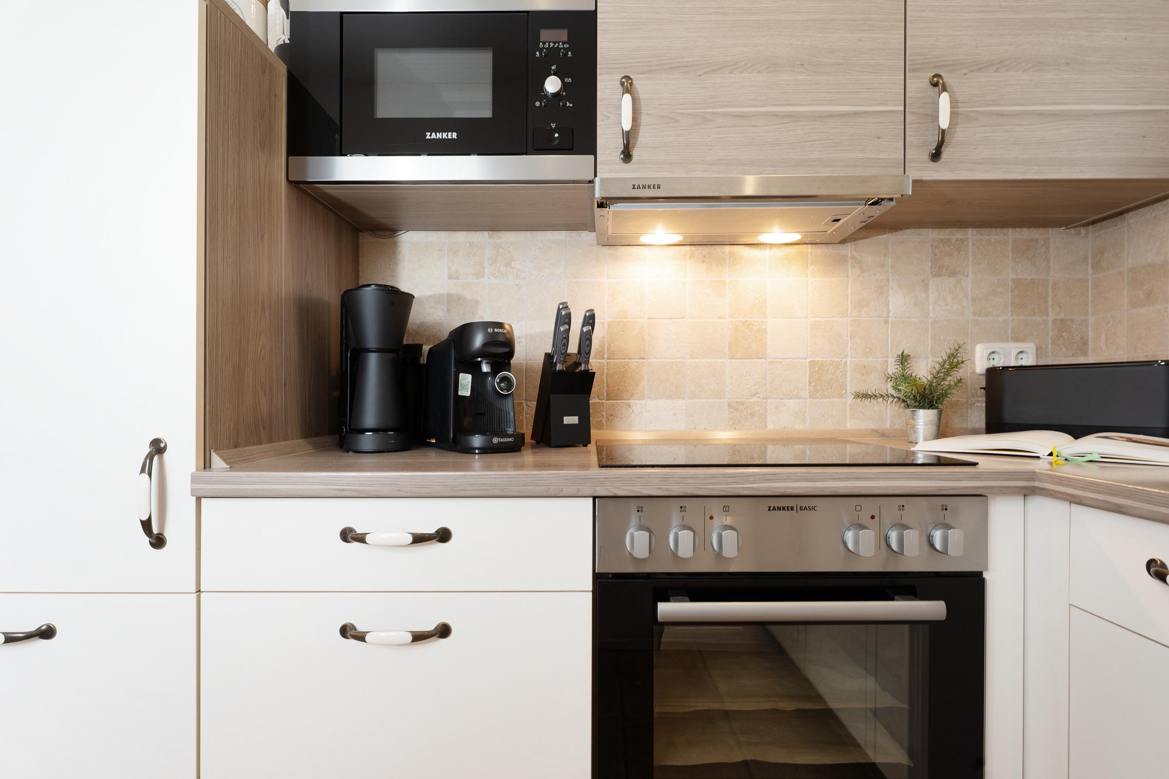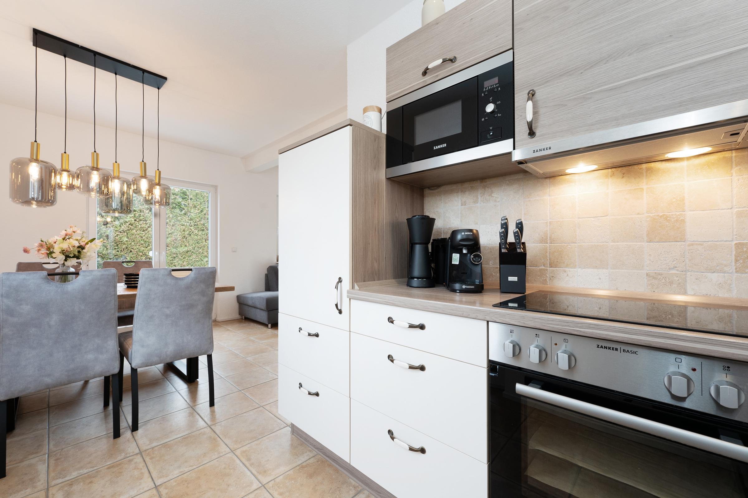 Die moderne, voll ausgestattete Küche lässt keine Wünsche offen: Cerankochfeld, Backofen, Geschirrspüler, Mikrowelle, Kühl-/Gefrierkombination, Kaffeemaschine sowie praktische Küchenhelfer stehen Ihnen zur Verfügung.