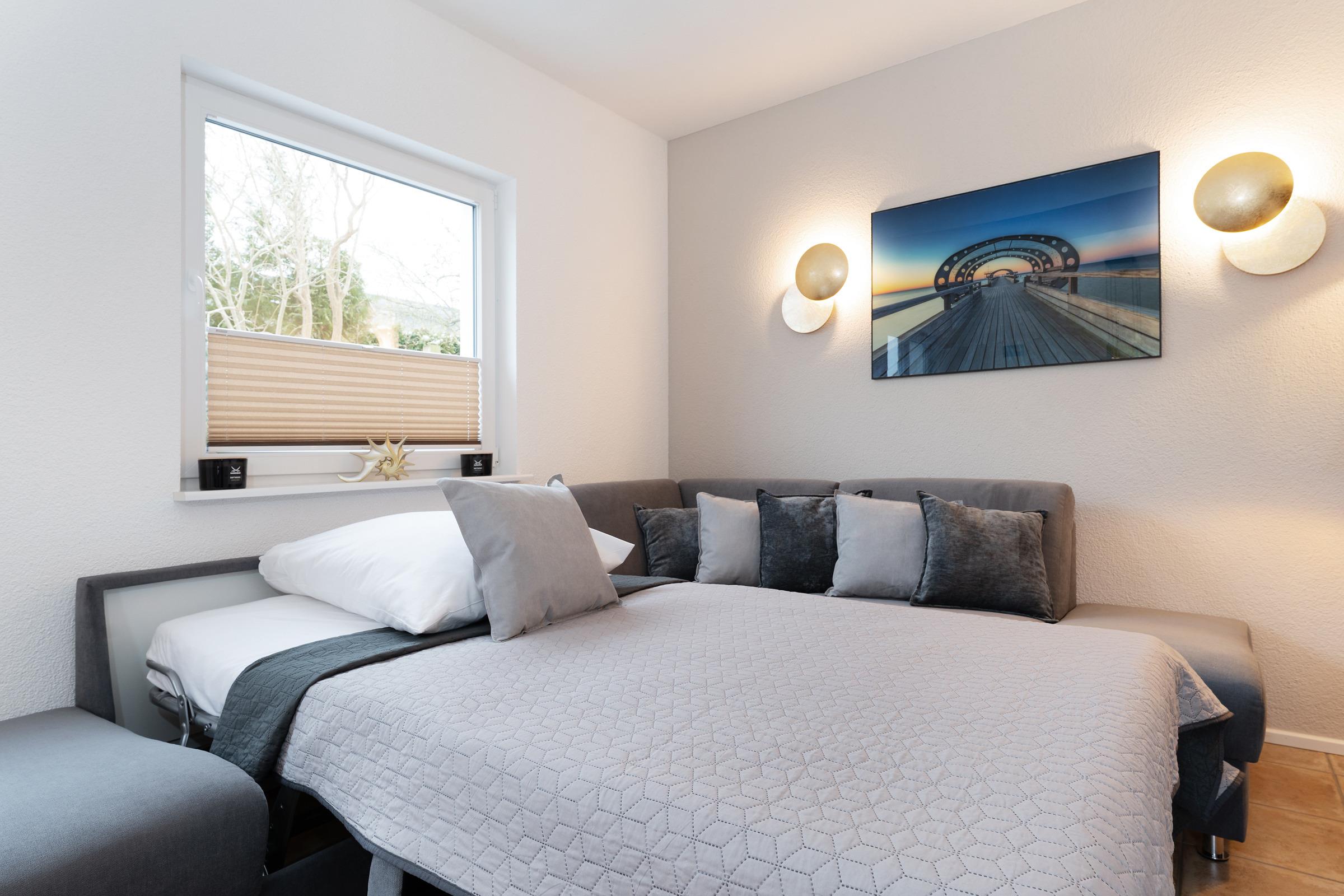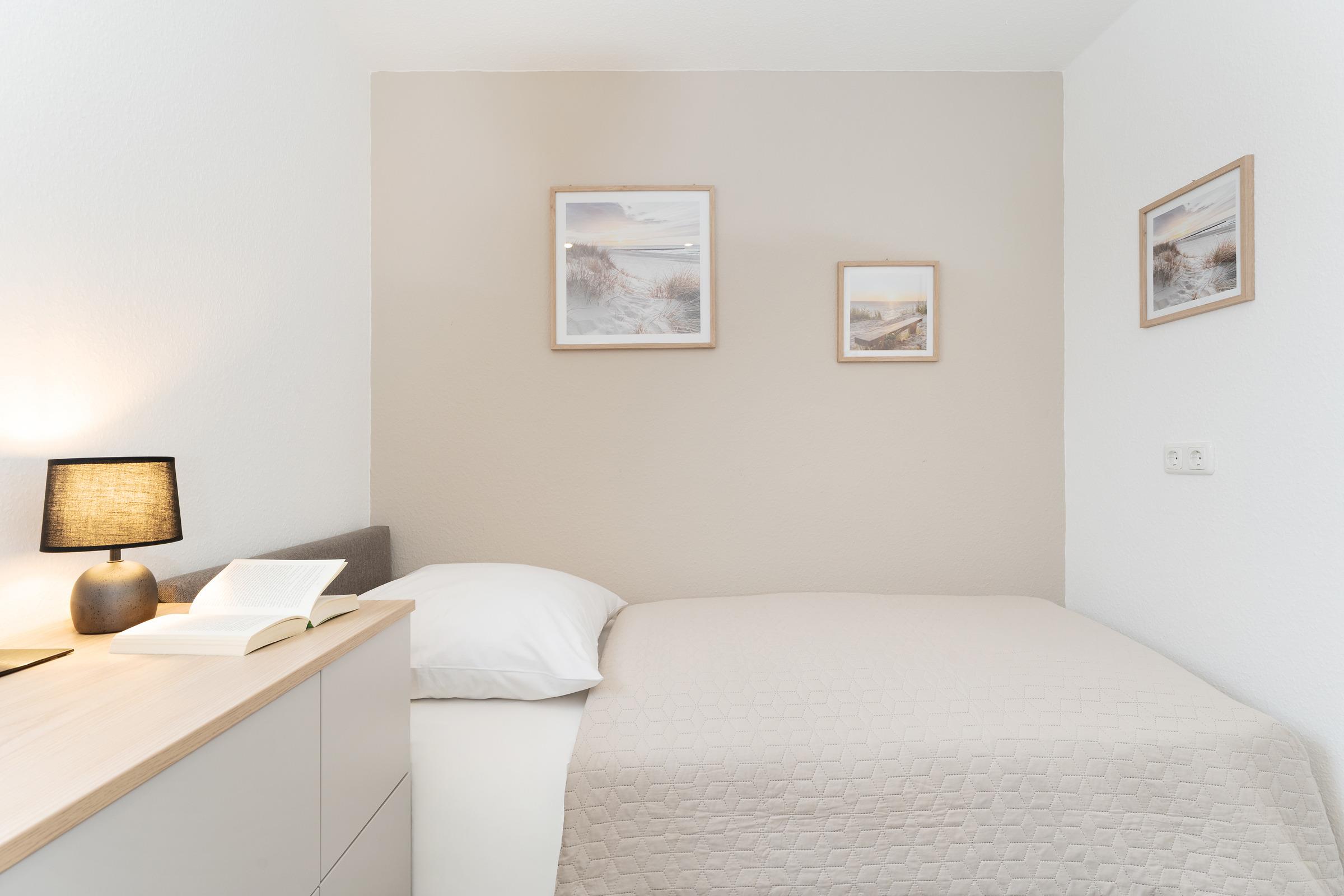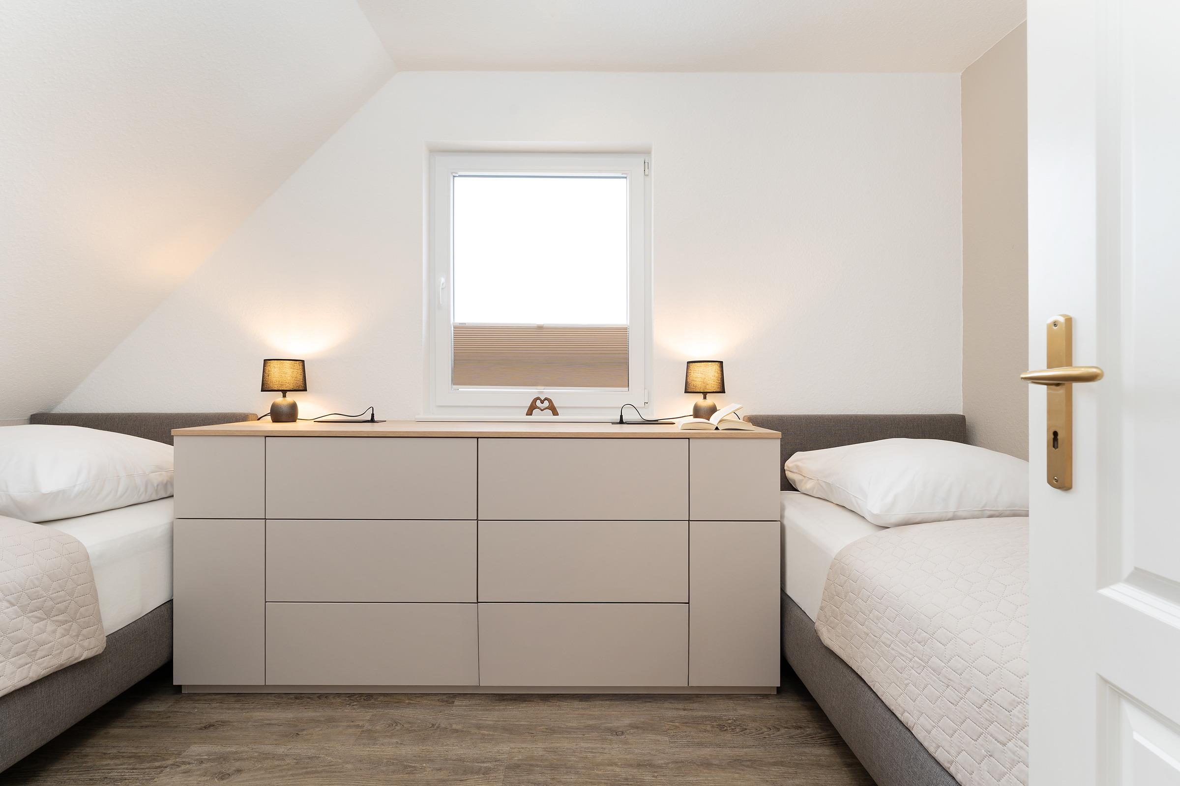 Zwei separate Schlafzimmer sorgen für erholsamen Schlaf. Schlafzimmer 1 bietet ein komfortables Boxspring-Doppelbett (2 × 90 × 200 cm), einen großen Kleiderschrank mit integrierter Kommode, TV sowie Platz für ein Babybett. Schlafzimmer 2 ist mit zwei Boxspring-Einzelbetten (je 90 × 200 cm) und einer großen Kommode ausgestattet. Im Wohnbereich steht zusätzlich eine hochwertiges Schlafsofa (120 × 200 cm) bereit.