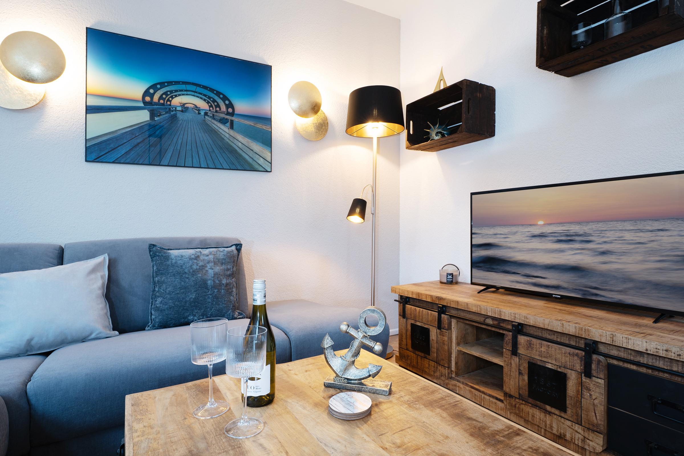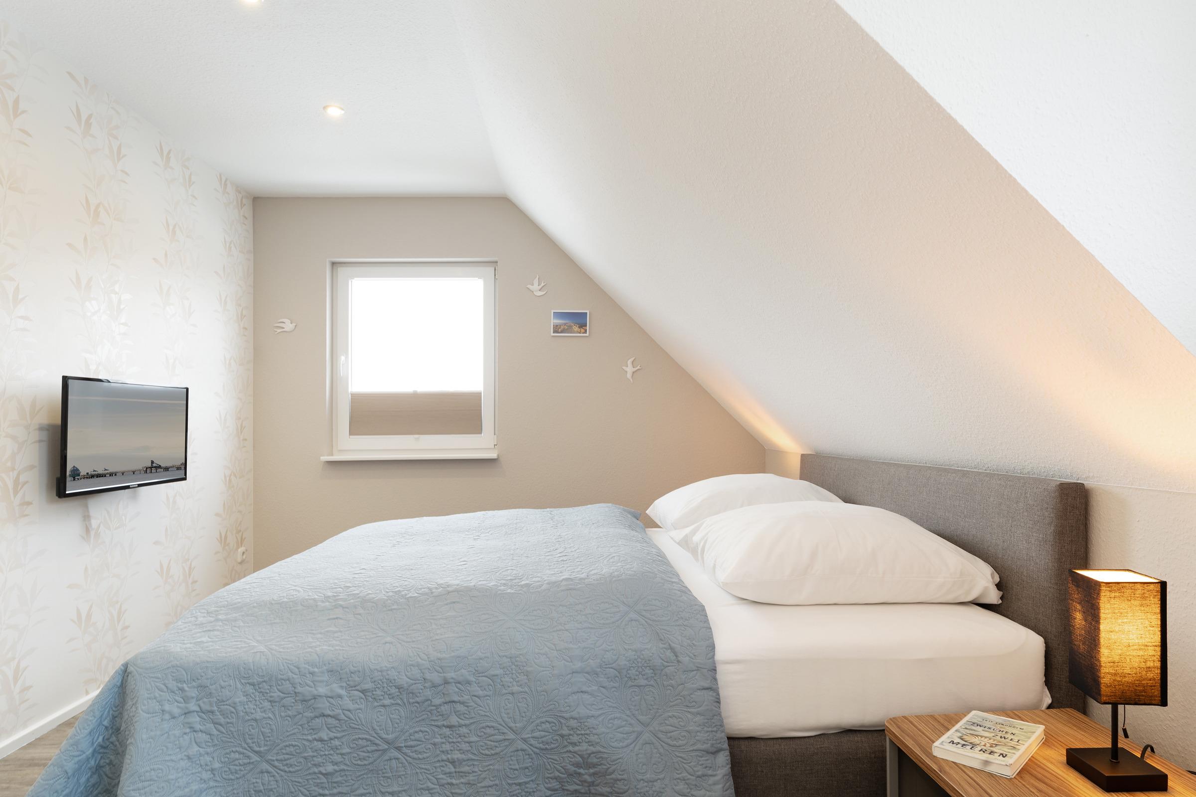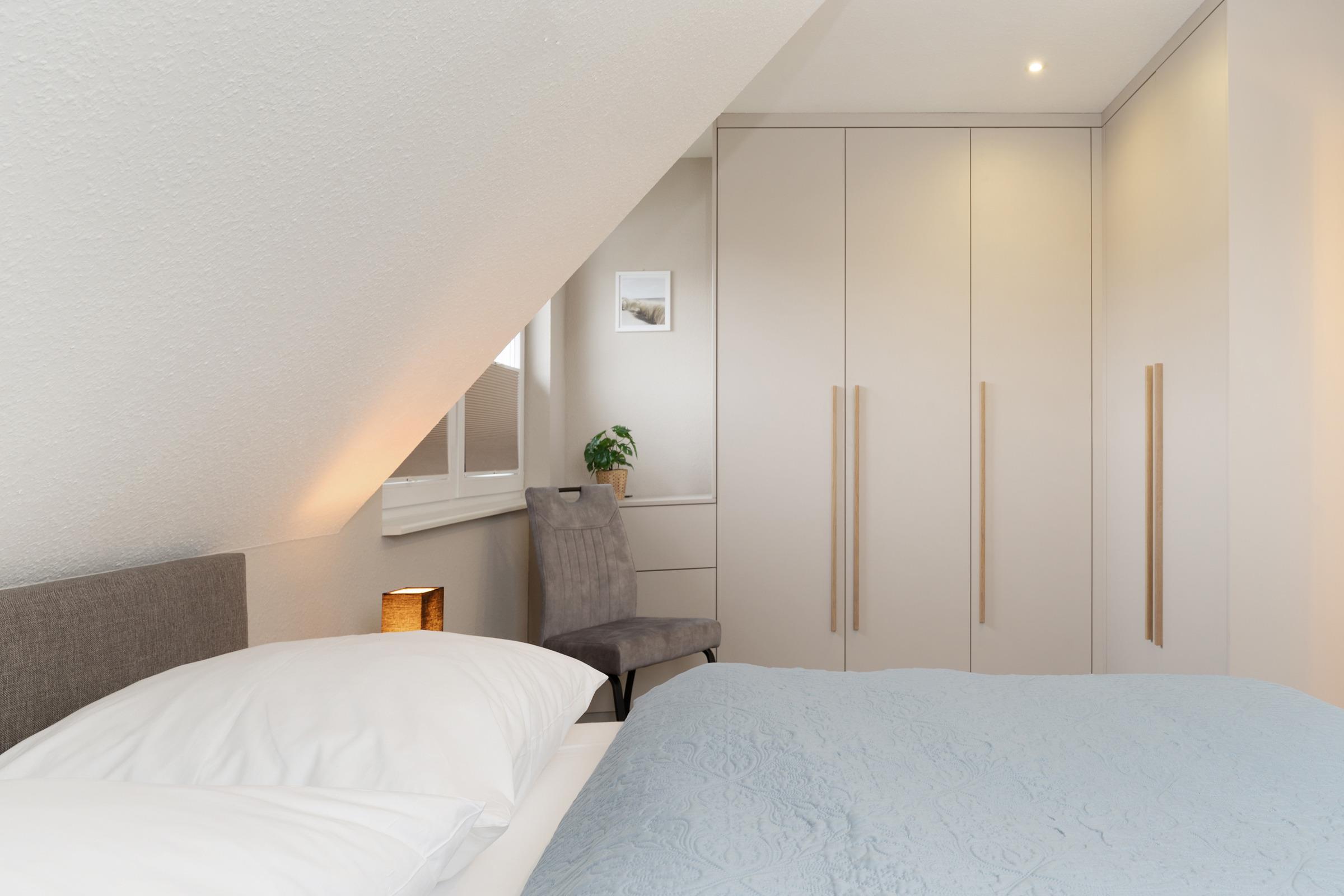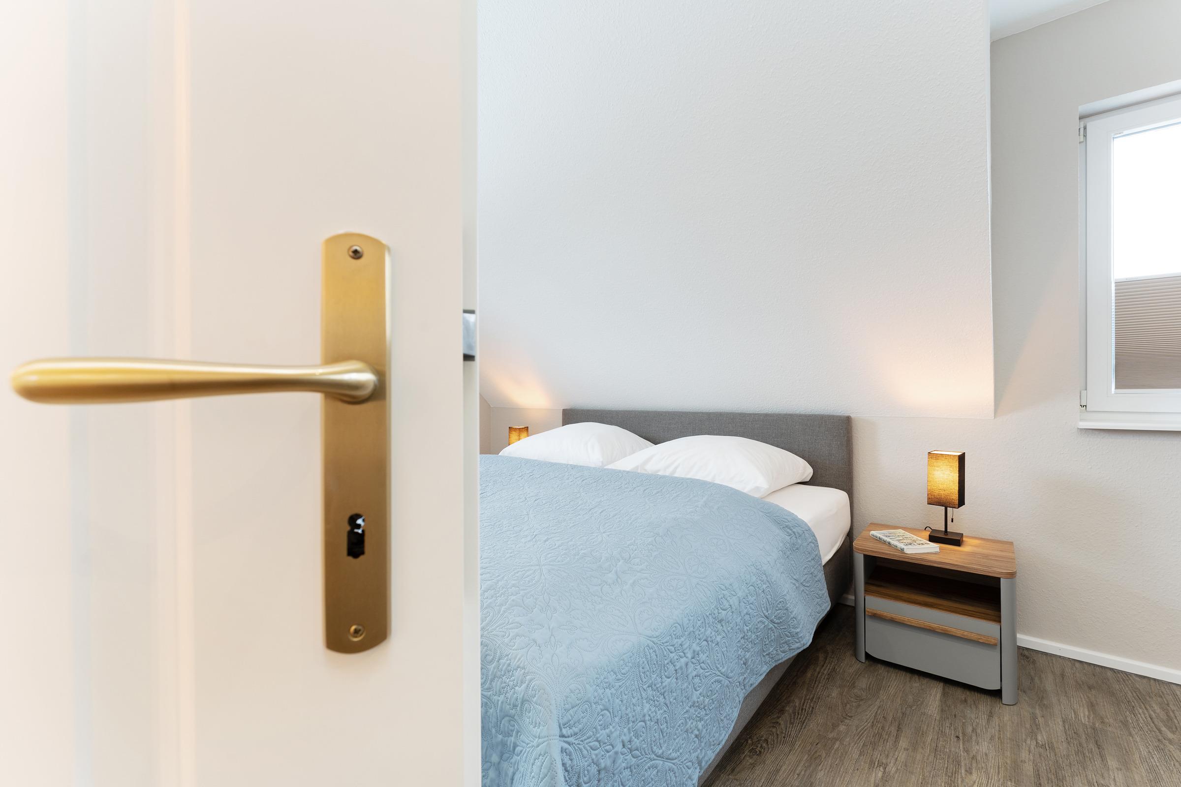 Zwei separate Schlafzimmer sorgen für erholsamen Schlaf. Schlafzimmer 1 bietet ein komfortables Boxspring-Doppelbett (2 × 90 × 200 cm), einen großen Kleiderschrank mit integrierter Kommode, TV sowie Platz für ein Babybett. Schlafzimmer 2 ist mit zwei Boxspring-Einzelbetten (je 90 × 200 cm) und einer großen Kommode ausgestattet. Im Wohnbereich steht zusätzlich eine hochwertiges Schlafsofa (120 × 200 cm) bereit.