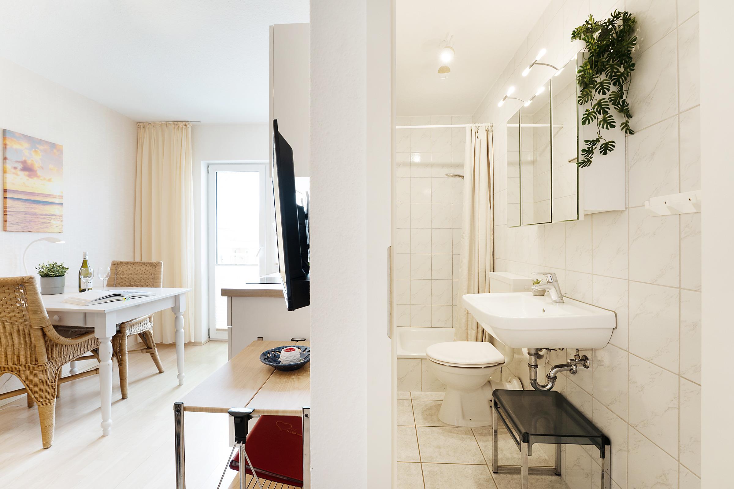 Die Ferienwohnung begrüßt Sie mit einem hellen und freundlich eingerichteten Wohnbereich, der mit gemütlicher Sitzecke und TV zum Entspannen einlädt. Von hier aus gelangen Sie auf den Balkon, auf dem Sie die frische Ostseeluft genießen können. Die integrierte Küche ist gut ausgestattet und bietet mit Ceranfeld, Backofen, Kühlschrank, Kaffeemaschine, Wasserkocher und weiteren Küchenutensilien alles, was Sie für Ihre Selbstverpflegung benötigen; der Essbereich fügt sich harmonisch in den Wohnraum ein. Das separate Schlafzimmer ist mit einem komfortablen Doppelbett und Kleiderschrank ausgestattet und sorgt für erholsame Nächte. Das Badezimmer verfügt über Dusche und WC und rundet den Wohnkomfort ab.