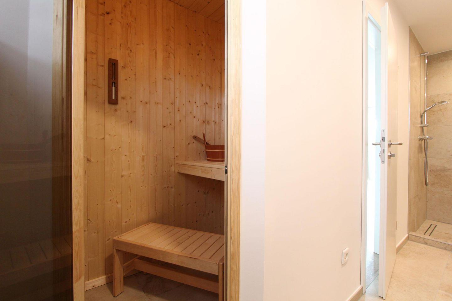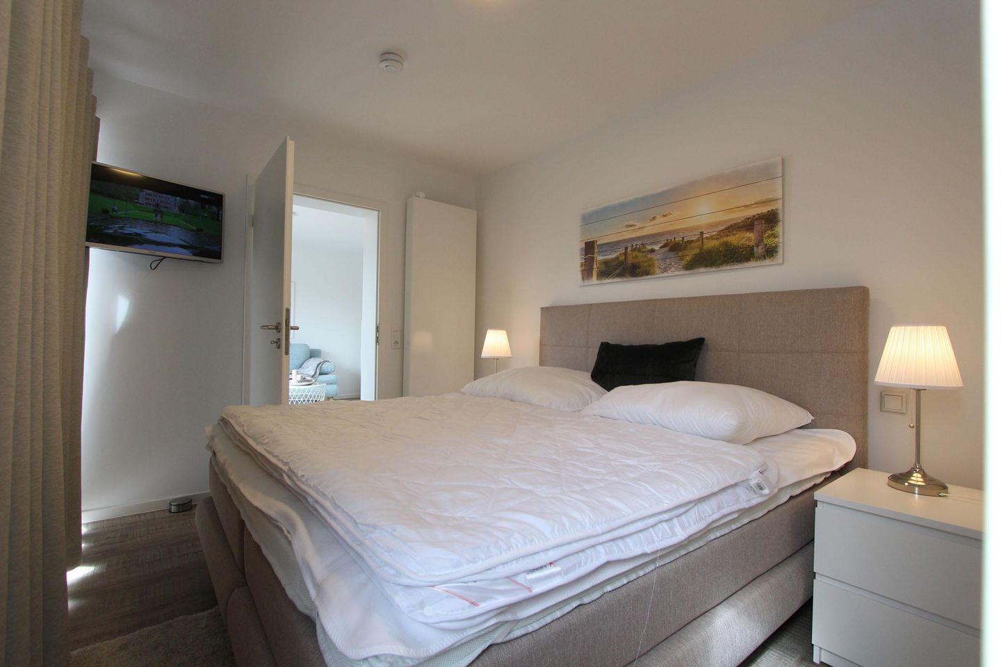 Herrlich ausschlafen: Ihr Schlafzimmer ist mit einem modernen Boxspringbett (Topper 1,80x2,00m) möbliert, damit Sie sich im Urlaub gut erholen können. Auch das Bad ist komfortabel ausgestattet: Neben der Dusche dürfen Sie gern auch in der eingebauten Sauna entspannen. Eine Waschmaschine steht für die Wäsche zwischendurch bereit.