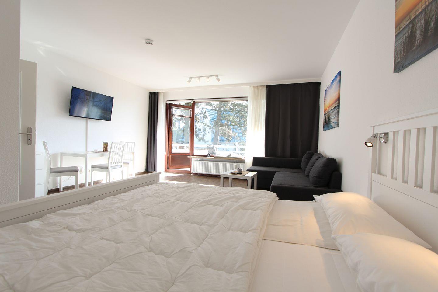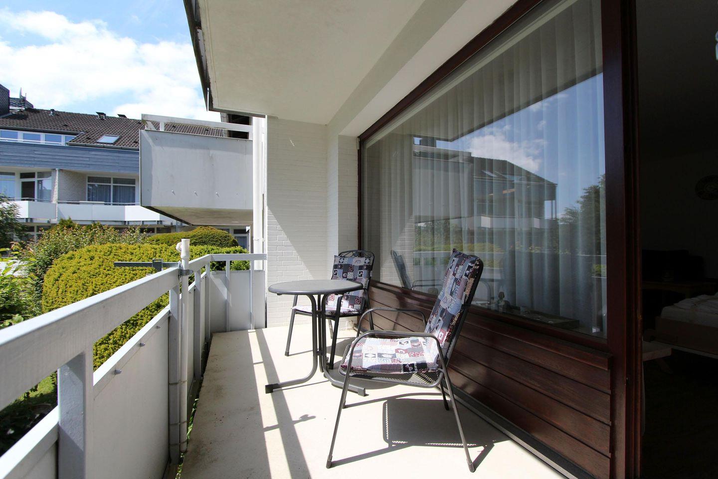 Dieses gemütliche und schicke Einraumappartement bietet ein schönes Wohn-/Schlafzimmer mit moderner, gemütlicher und stilvoller Einrichtung. Das Doppelbett (2 Matratzen á 0,80x2,00m) passt sich optisch gut in den Raum ein und die Küchenzeile bietet einen Backofen, einen Kühlschrank sowie ein Kochfeld. Das Duschbad ist zwar klein, aber vollkommen ausreichend. Im Wohnbereich ist ebenfalls ein Esstisch sowie der Zugang zum Balkon. Mit sonniger Süd-West-Lage können hier auch schöne Stunden verbracht werden. In der Wohnanlage sind mehrere Extras enthalten, zum Beispiel ein Billiard- oder auch ein Tischtennistisch. Der Kellenhusener Sandstrand ist ca. 6 Gehminuten entfernt. Sollte das Reisegepäck so gering wie möglich ausfallen, dann ist ein Wäschepaket für den Aufenthalt in Kellenhusen gegen Gebühr einfach buchbar. Sollten Sie Urlaub mit mehreren Familien oder älteren Kindern planen, dann bietet das Haus direkt nebenan die Wohnung "Kutter" ähnliche Ausstattung und wäre optimal als zusätzliche Wohnung.