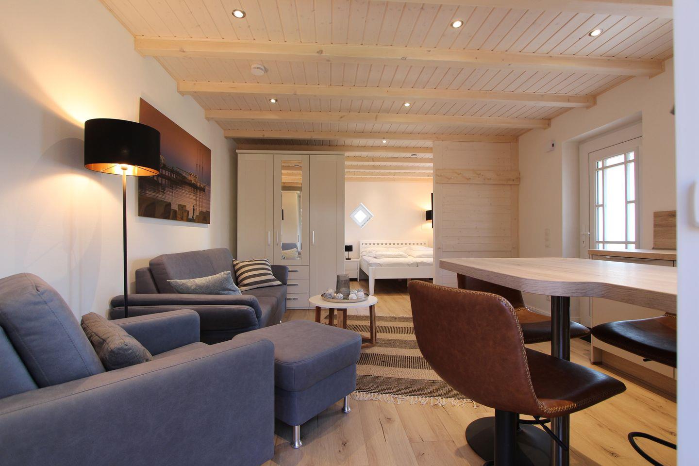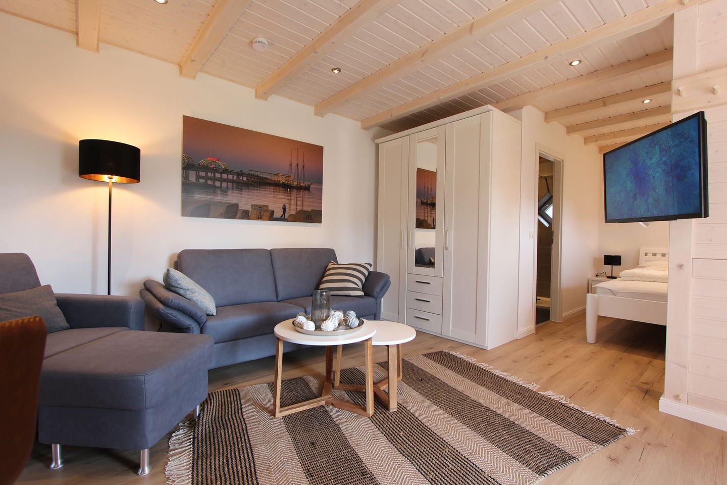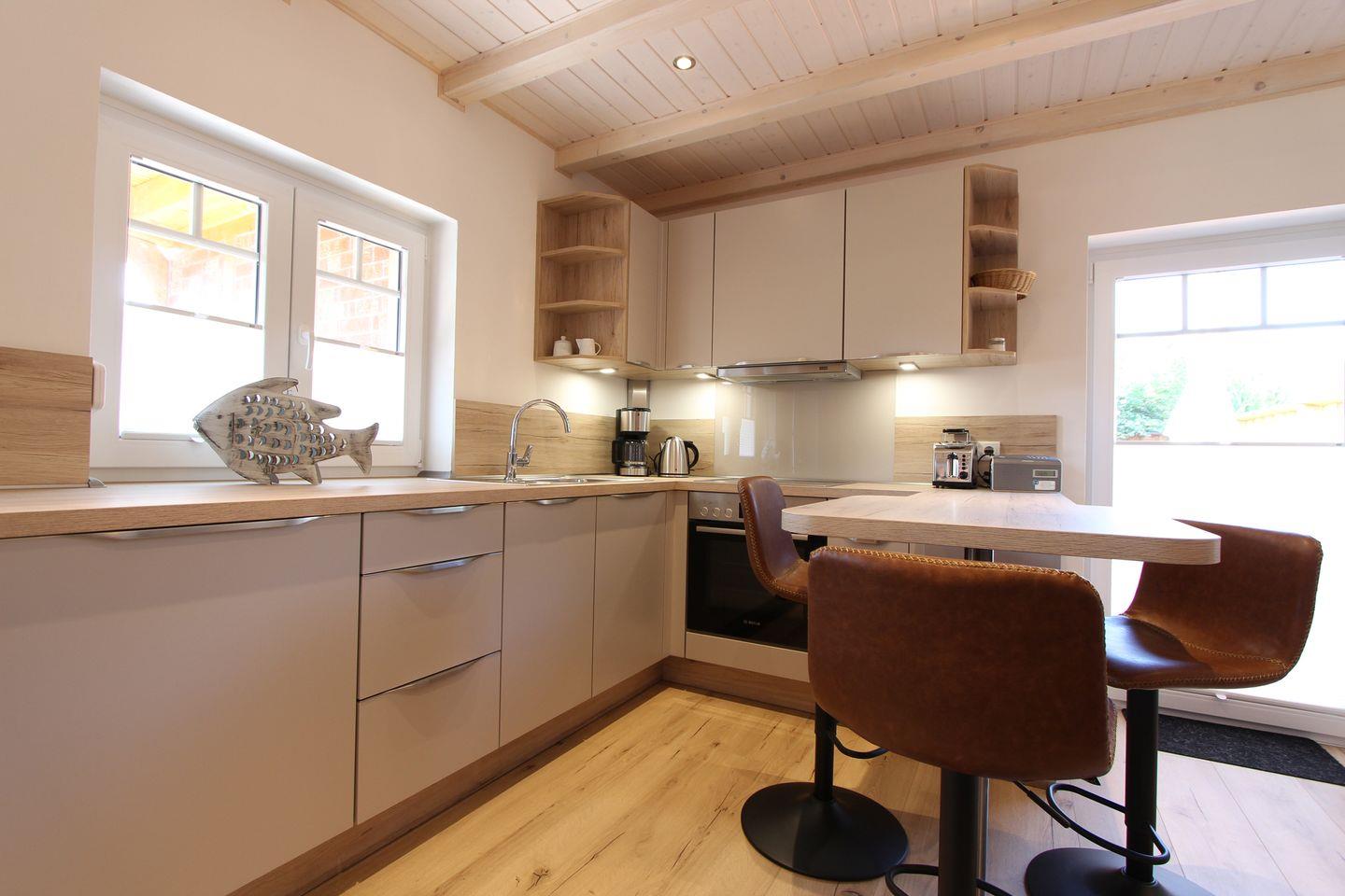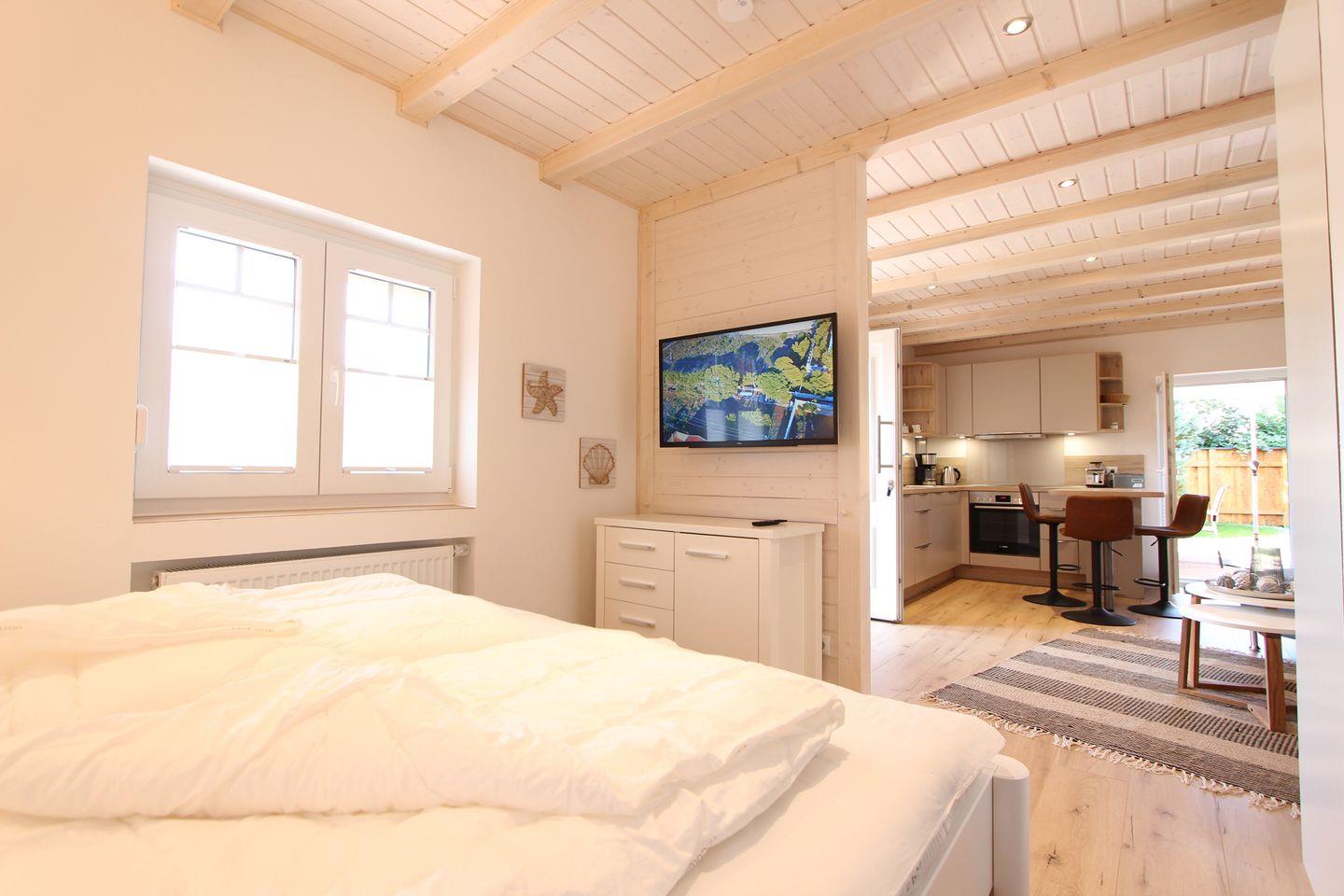 Das kleine, ca. 38 qm große Gartenhaus mit 2 Terrassen für max. 2 Personen, ist gemütlich eingerichtet und lädt ein, die Seele baumeln zu lassen. Der offene Wohnbereich ist individuell, geschmackvoll und modern eingerichtet und verfügt über alle notwendigen Dinge. Die sehr schicke und hochwertige Küche ist gemeinsam im Wohnbereich integriert. Das große Ceranfeld, der Geschirrspüler und der Backofen runden die schicke Küche ab. Im Wohn-Schlafbereich können Sie sich in einem hochwertigen Doppelbett (2 Matratzen á 0,80x2,00m) zur Nachtruhe begeben. Die Wohnung verfügt auch über ein modernes und schönes Duschbad. Der Garten steht allen Gästen des Hauses zur Verfügung. Mitgebrachte Fahrräder können ebenfalls im Garten abgestellt werden. Bis zum Kellenhusener Sandstrand sind es nur 6 Gehminuten. Auch dem Urlaub mit dem Haustier steht generell nichts im Wege, denn nach Rücksprache und gegen Aufpreis sind Haustiere gestattet. Sollte das Reisegepäck so gering wie möglich ausfallen, dann ist ein Wäschepaket für den Aufenthalt in Kellenhusen gegen Gebühr einfach buchbar und auch eine Waschmaschine und ein Trockner können gebührenpflichtig in dem Haus genutzt werden.