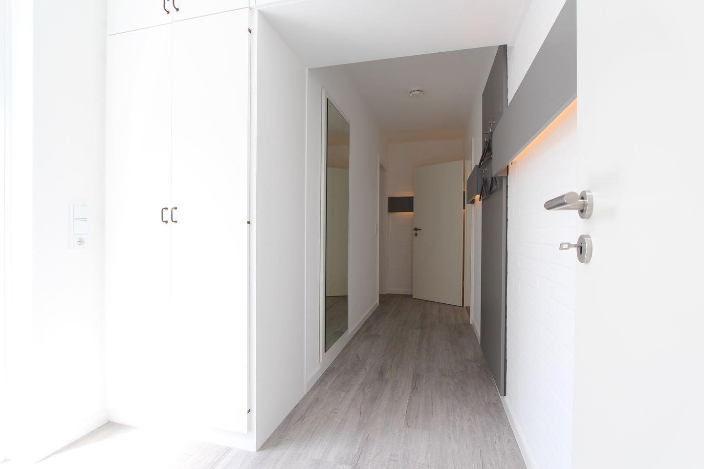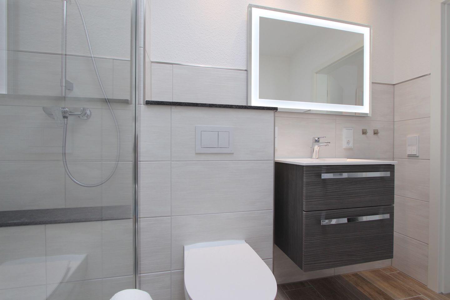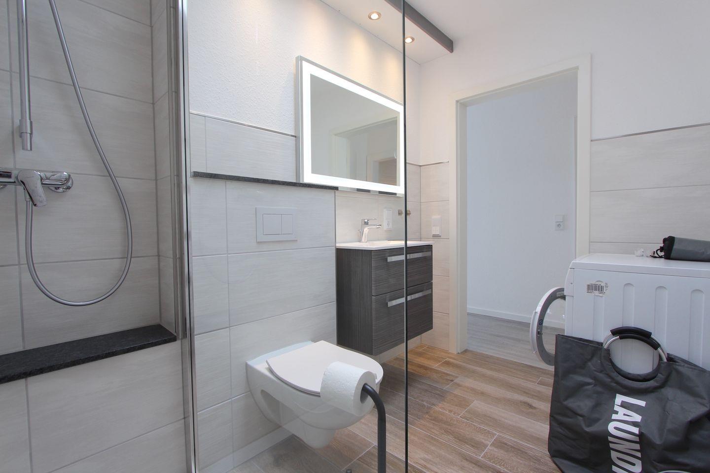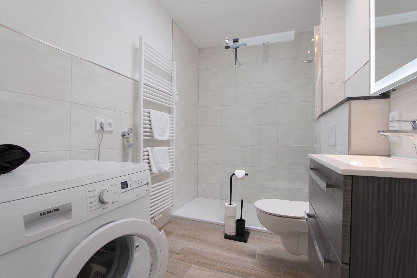 Das Badezimmer ist mit einer bodengleichen Dusche, Waschbecken, Fenster, großem Spiegel und WC komfortabel ausgestattet. Zur Grundausstattung gehören zudem eine Waschmaschine zur Eigennutzung, Wäscheständer, Staubsauger und eine Garderobe im Eingangsbereich.