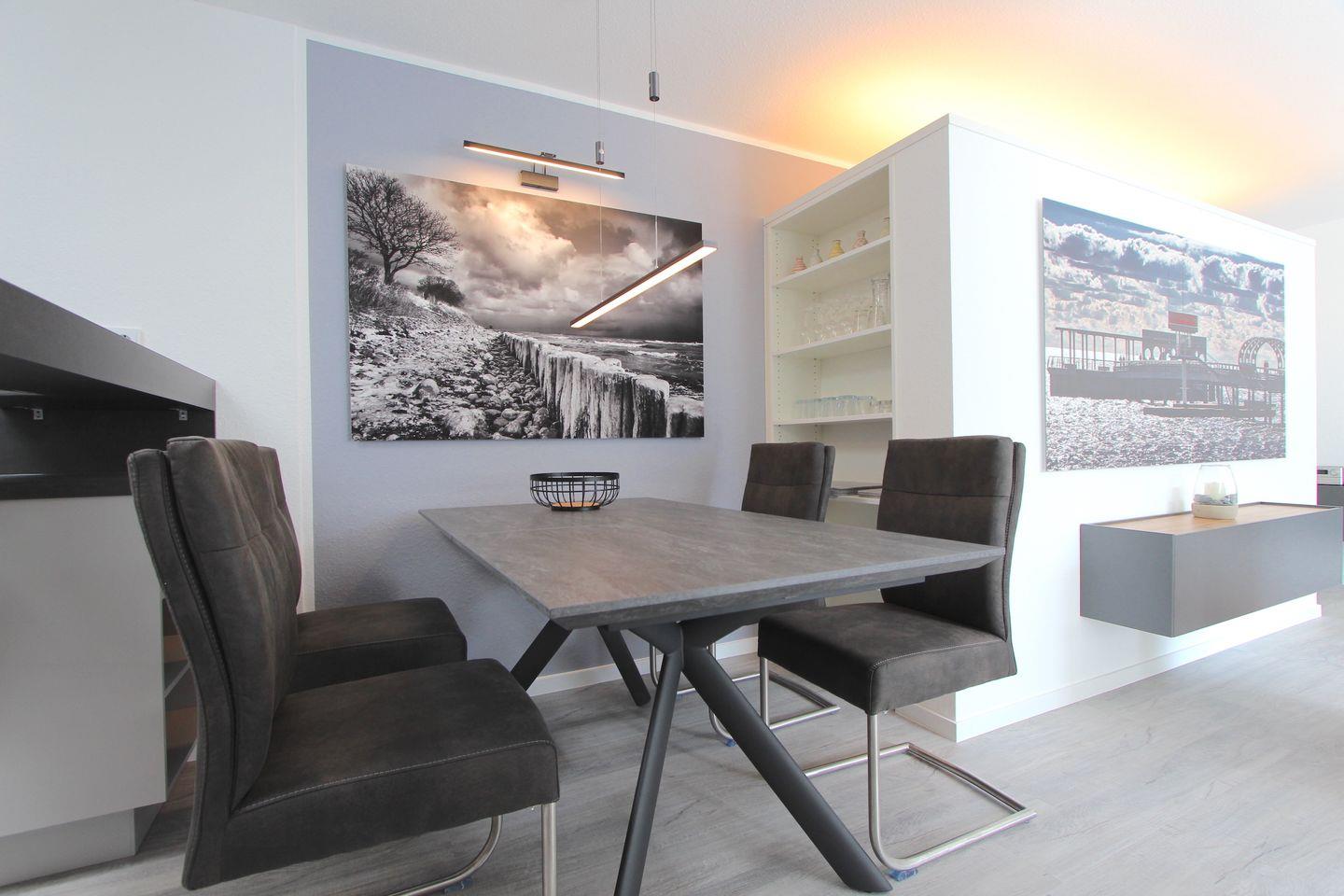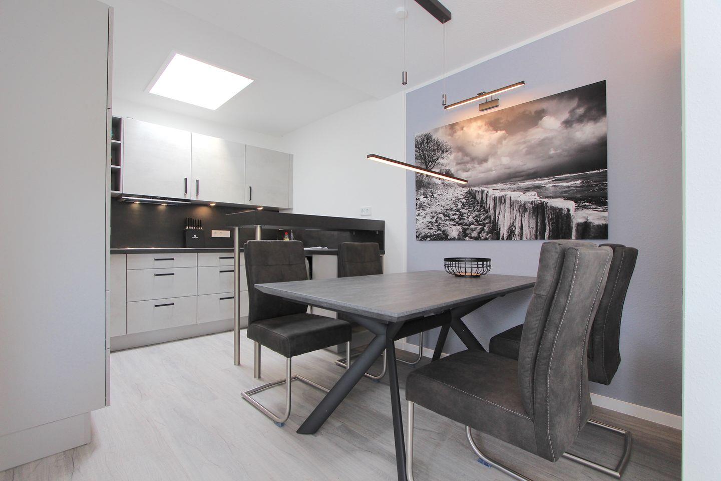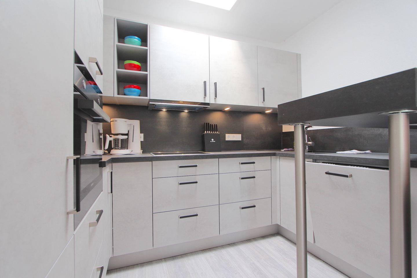 Die offene Küche ist zum Wohnzimmer hin ausgerichtet und überzeugt durch umfassende Ausstattung: Ceranherd, Backofen (elektrisch betrieben), Mikrowelle, Kaffeemaschine, Wasserkocher, Toaster, Kühlschrank mit Gefrierfach sowie eine Spülmaschine stehen Ihnen zur Verfügung. Küchenutensilien, Geschirr, Besteck und Geschirrhandtücher sind vorhanden, sodass Sie ganz nach Ihren Wünschen kochen können.