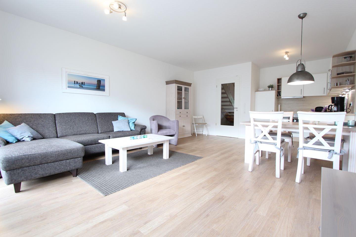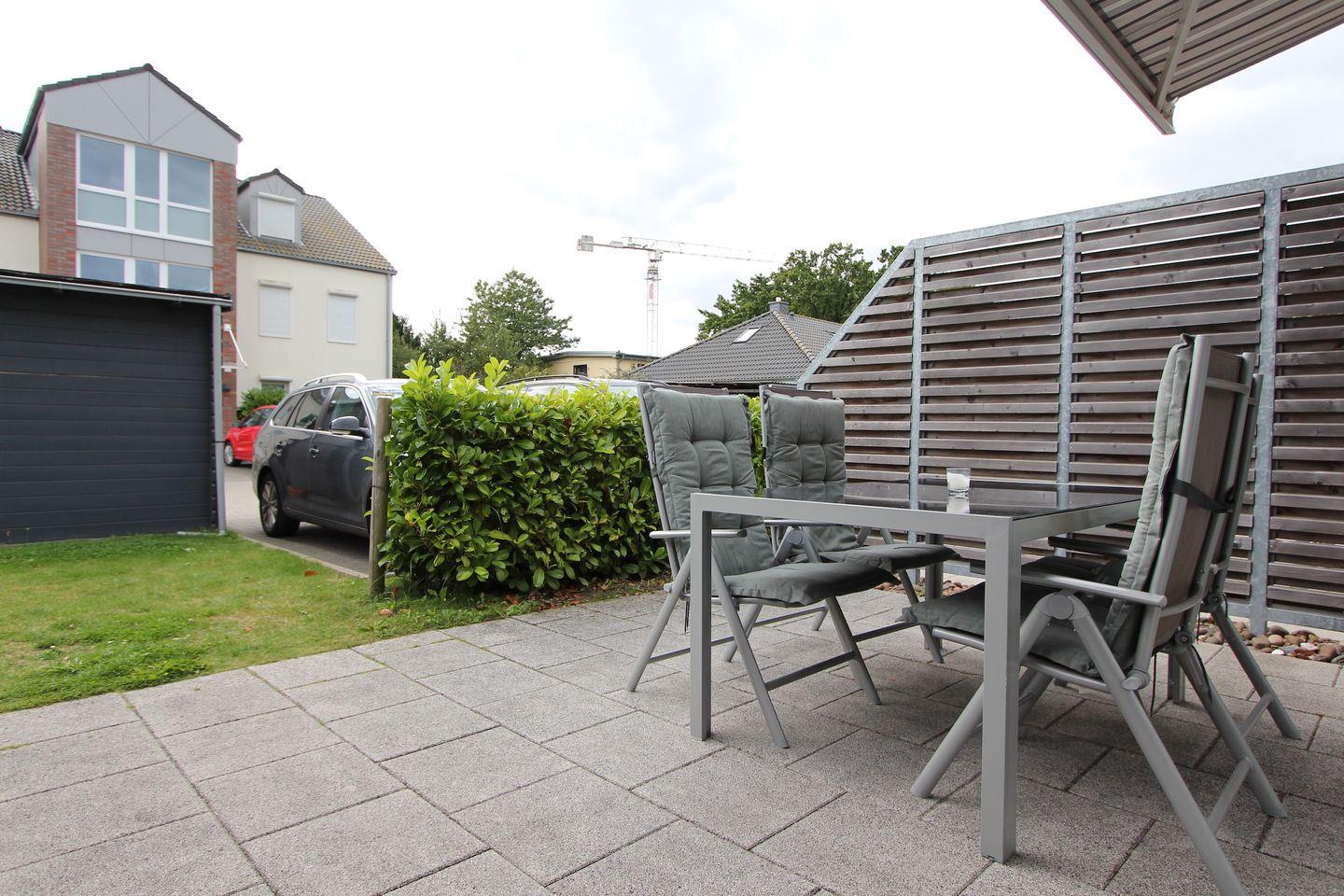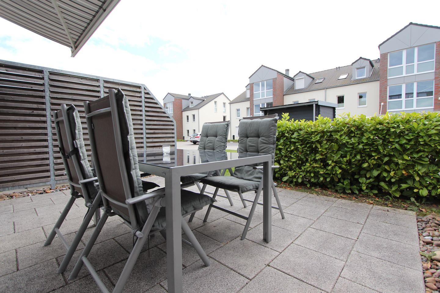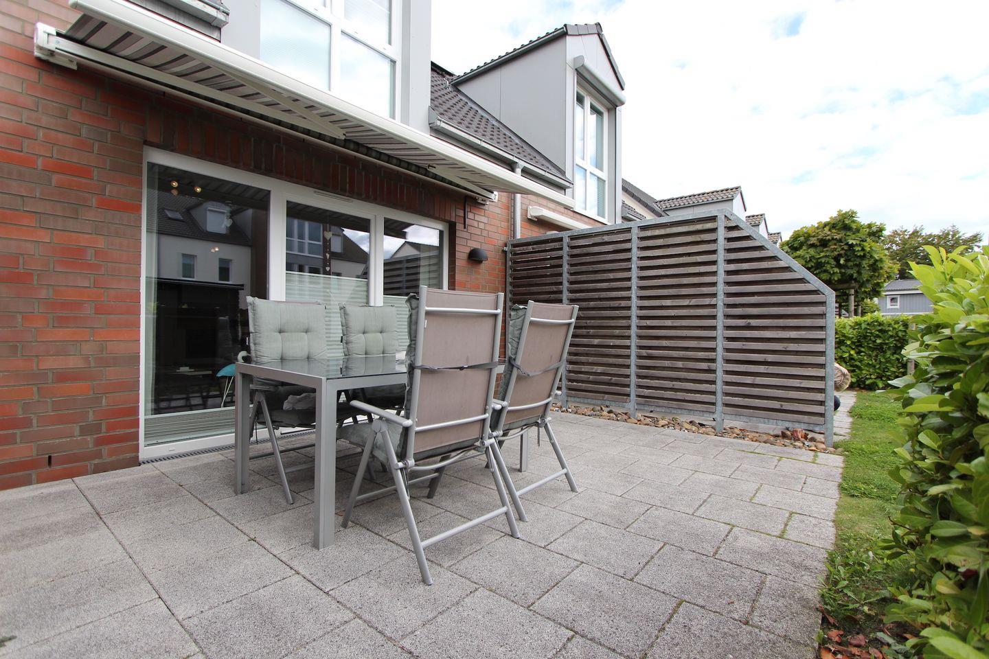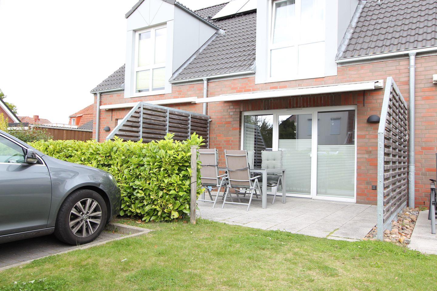 Reihenmittelhaus in zentraler Lage. Das Erdgeschoss bietet Ihnen einen modernen Wohn- und Essbereich mit integriertem Küchenbereich sowie Backofen, 4-Platten-Induktionsfeld, Mikrowelle, Geschirrspüler, Kühlschrank mit separatem Gefrierschrank (2 gr. Schubladen), Kaffeemaschine, Toaster, Wasserkocher etc. Zur weiteren Ausstattung gehören ein Flachbild-TV, DVD-Player und Stereoanlage. WLAN steht Ihnen kostenfrei zur Verfügung. Die Terrasse und der Garten sind nach Süd-Westen ausgerichtet und bieten nach einem Strandtag noch sonnige Stunden bis in den Abend. Sollten Sie einmal Schutz vor der Sonne suchen, steht Ihnen eine elektrische Markise zur Verfügung. Ein geräumiger Flur mit Garderobe, ein Gäste-WC sowie ein Abstellraum mit Waschmaschine stehen zur Verfügung. Im Obergeschoss sind die 2 Schlafzimmer und ein Duschbad angeordnet. Das größere Schlafzimmer ist mit einen Doppelbett (2 Matratzen 0.90 x 2.00 m) und einem TV ausgestattet. Das kleinere Schlafzimmer ist mit 2 getrennt stehenden Betten (0.90 x 2.00 m) eingerichtet. Ausreichend Schrankfläche ist in beiden Schlafzimmern vorhanden. Bei Bedarf können Sie Wäschepakete für Ihren Aufenthalt gegen Gebühr buchen.