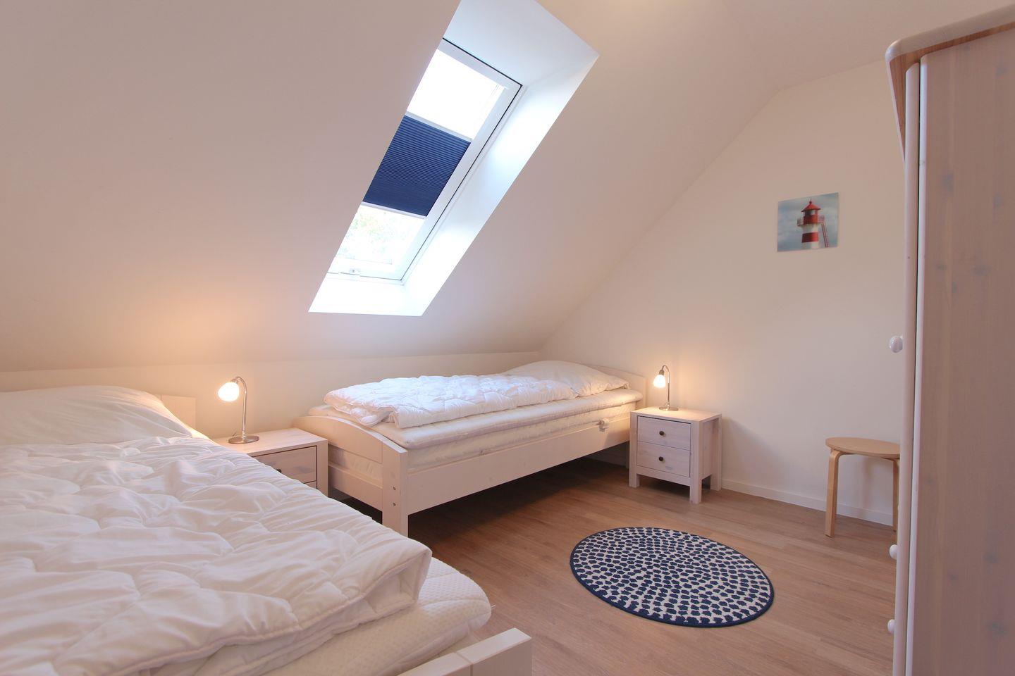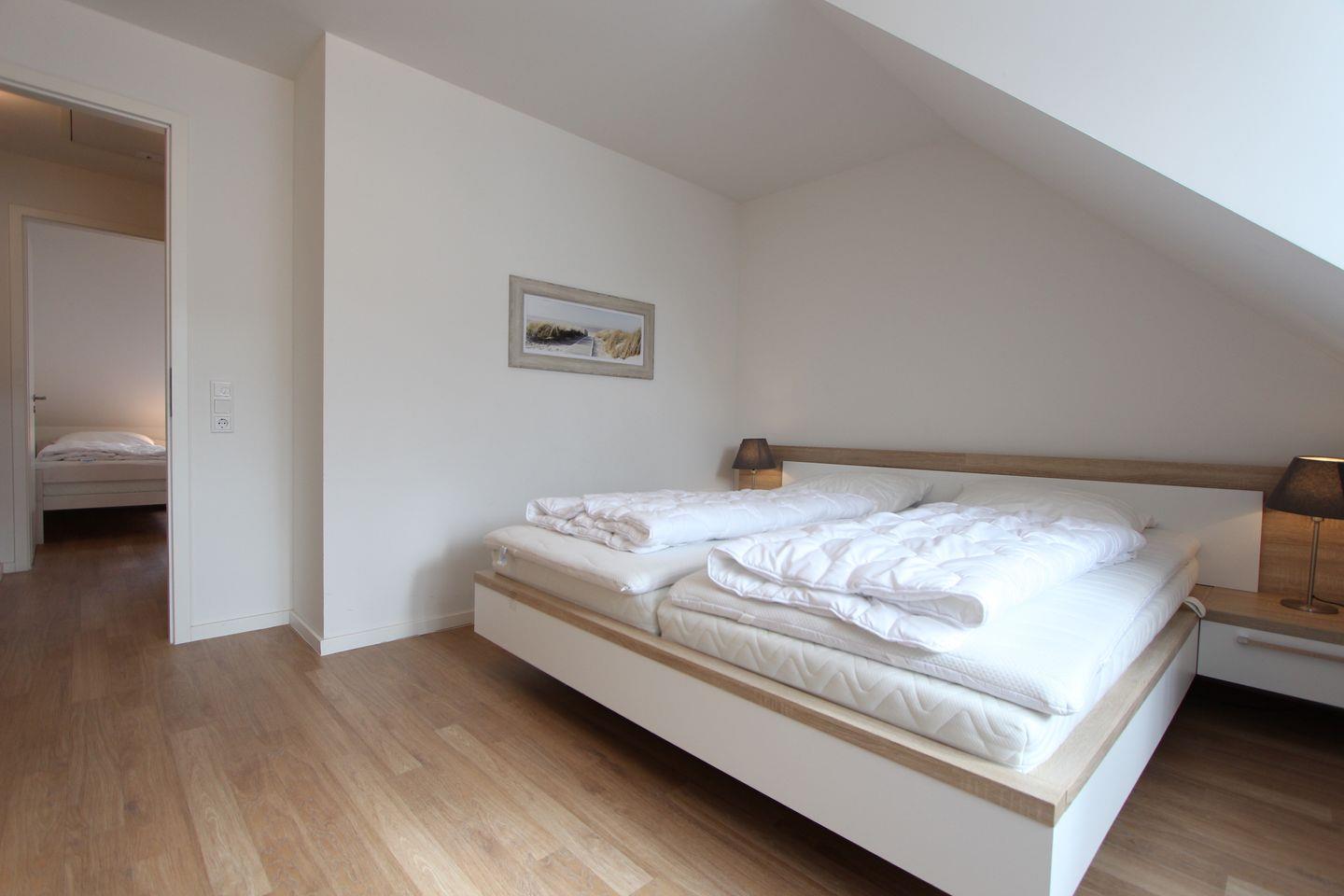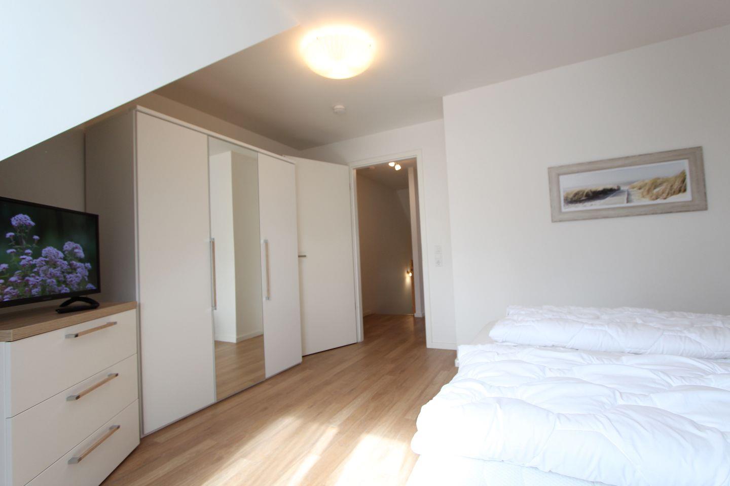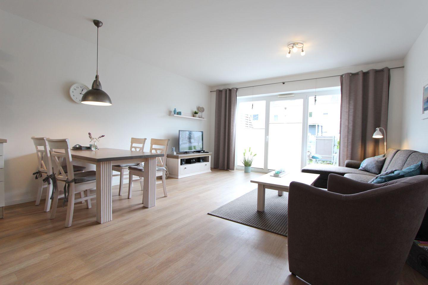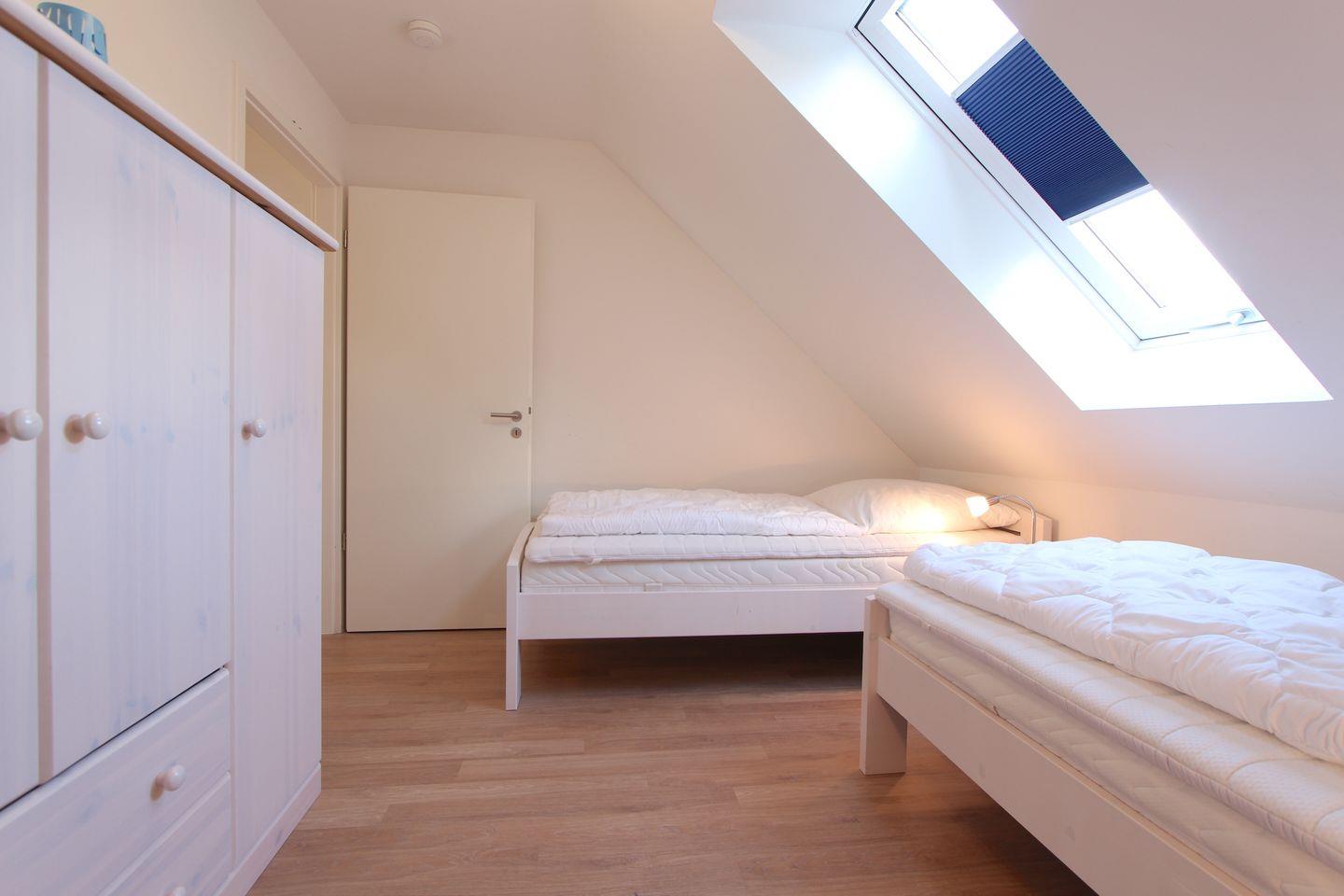 Reihenmittelhaus in zentraler Lage. Das Erdgeschoss bietet Ihnen einen modernen Wohn- und Essbereich mit integriertem Küchenbereich sowie Backofen, 4-Platten-Induktionsfeld, Mikrowelle, Geschirrspüler, Kühlschrank mit separatem Gefrierschrank (2 gr. Schubladen), Kaffeemaschine, Toaster, Wasserkocher etc. Zur weiteren Ausstattung gehören ein Flachbild-TV, DVD-Player und Stereoanlage. WLAN steht Ihnen kostenfrei zur Verfügung. Die Terrasse und der Garten sind nach Süd-Westen ausgerichtet und bieten nach einem Strandtag noch sonnige Stunden bis in den Abend. Sollten Sie einmal Schutz vor der Sonne suchen, steht Ihnen eine elektrische Markise zur Verfügung. Ein geräumiger Flur mit Garderobe, ein Gäste-WC sowie ein Abstellraum mit Waschmaschine stehen zur Verfügung. Im Obergeschoss sind die 2 Schlafzimmer und ein Duschbad angeordnet. Das größere Schlafzimmer ist mit einen Doppelbett (2 Matratzen 0.90 x 2.00 m) und einem TV ausgestattet. Das kleinere Schlafzimmer ist mit 2 getrennt stehenden Betten (0.90 x 2.00 m) eingerichtet. Ausreichend Schrankfläche ist in beiden Schlafzimmern vorhanden. Bei Bedarf können Sie Wäschepakete für Ihren Aufenthalt gegen Gebühr buchen.