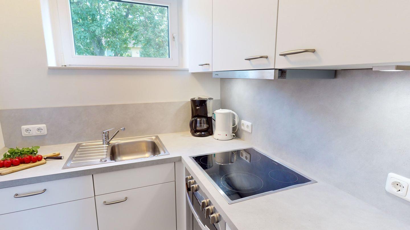 Die Wohnung ist über wenige Stufen zu erreichen und besteht aus einem Wohn-/Esszimmer, 2 Schlafzimmern (eins mit Doppelbett, eins mit zwei Einzelbetten), einer Küche und einem Duschbad. In der Wohnung gibt es eine Fußbodenheizung.