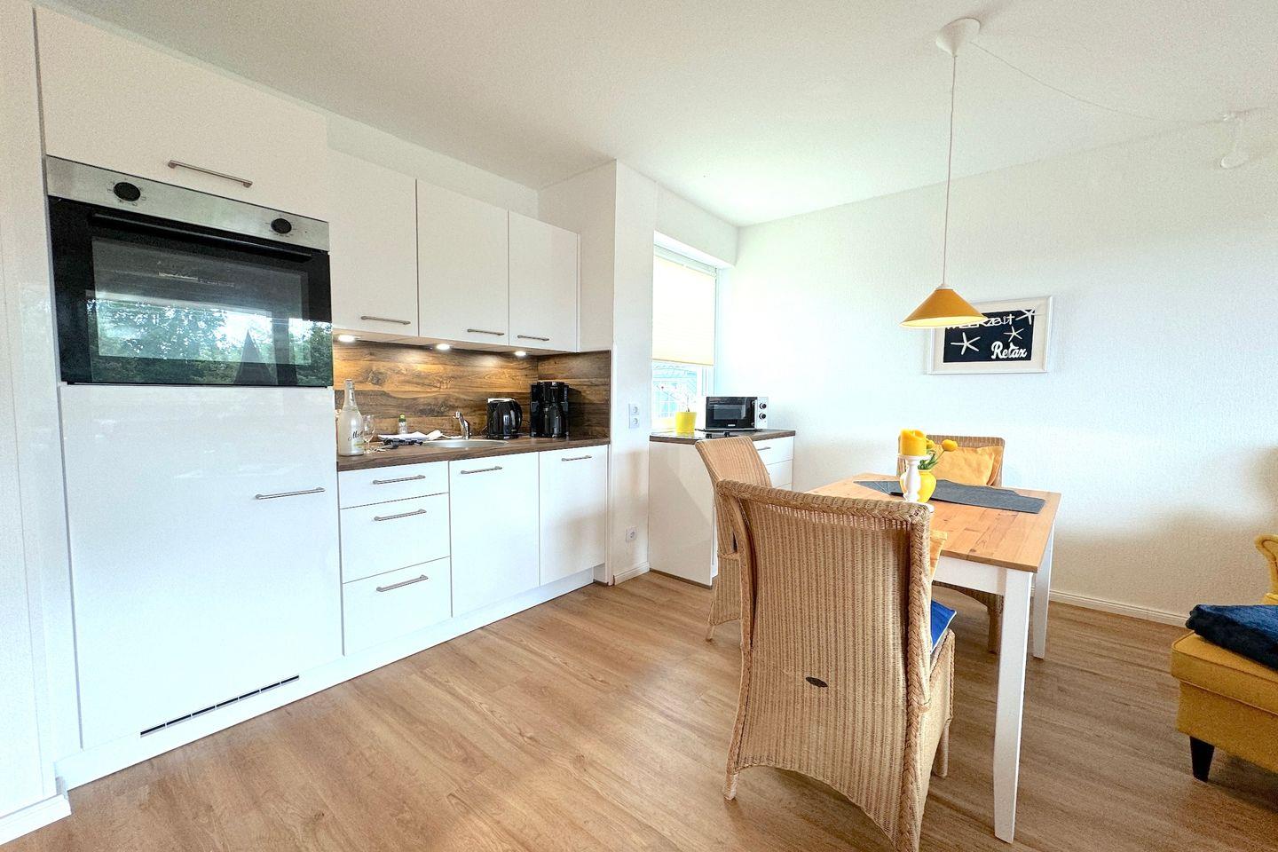 Diese moderne 50 qm große Ferienwohnung im 1. Stock bietet idealen Komfort für 2 Personen und lädt zu einem entspannten Urlaub an der Küste ein. Die Unterkunft verfügt über ein gemütliches Schlafzimmer, ein helles Wohnzimmer mit einer modernen Küchenzeile sowie einen Balkon, auf dem Sie die frische Seeluft genießen können.