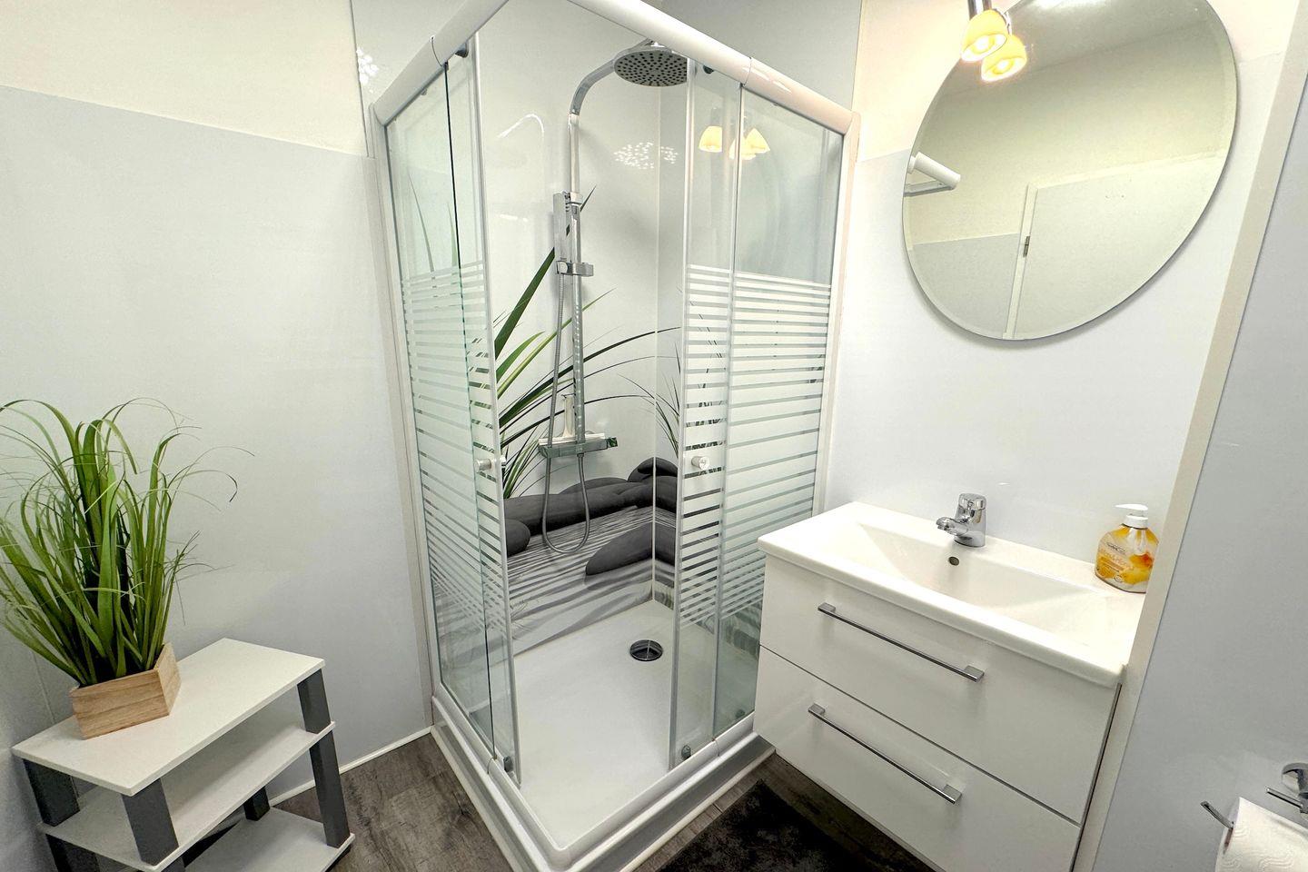 In der Küchenzeile finden Sie alle wichtigen Geräte wie Mikrowelle, Backofen, Kühlschrank, Spülmaschine, Kaffeemaschine und Toaster, um sich bequem selbst zu versorgen. Das Badezimmer ist mit einer Dusche ausgestattet und sorgt für einen frischen Start in den Tag.