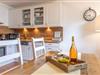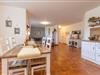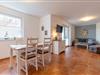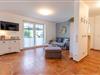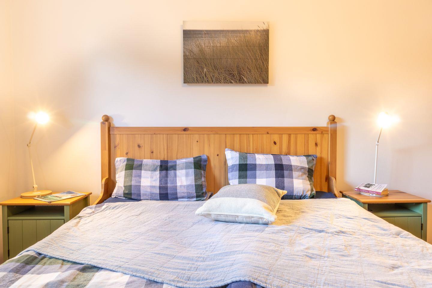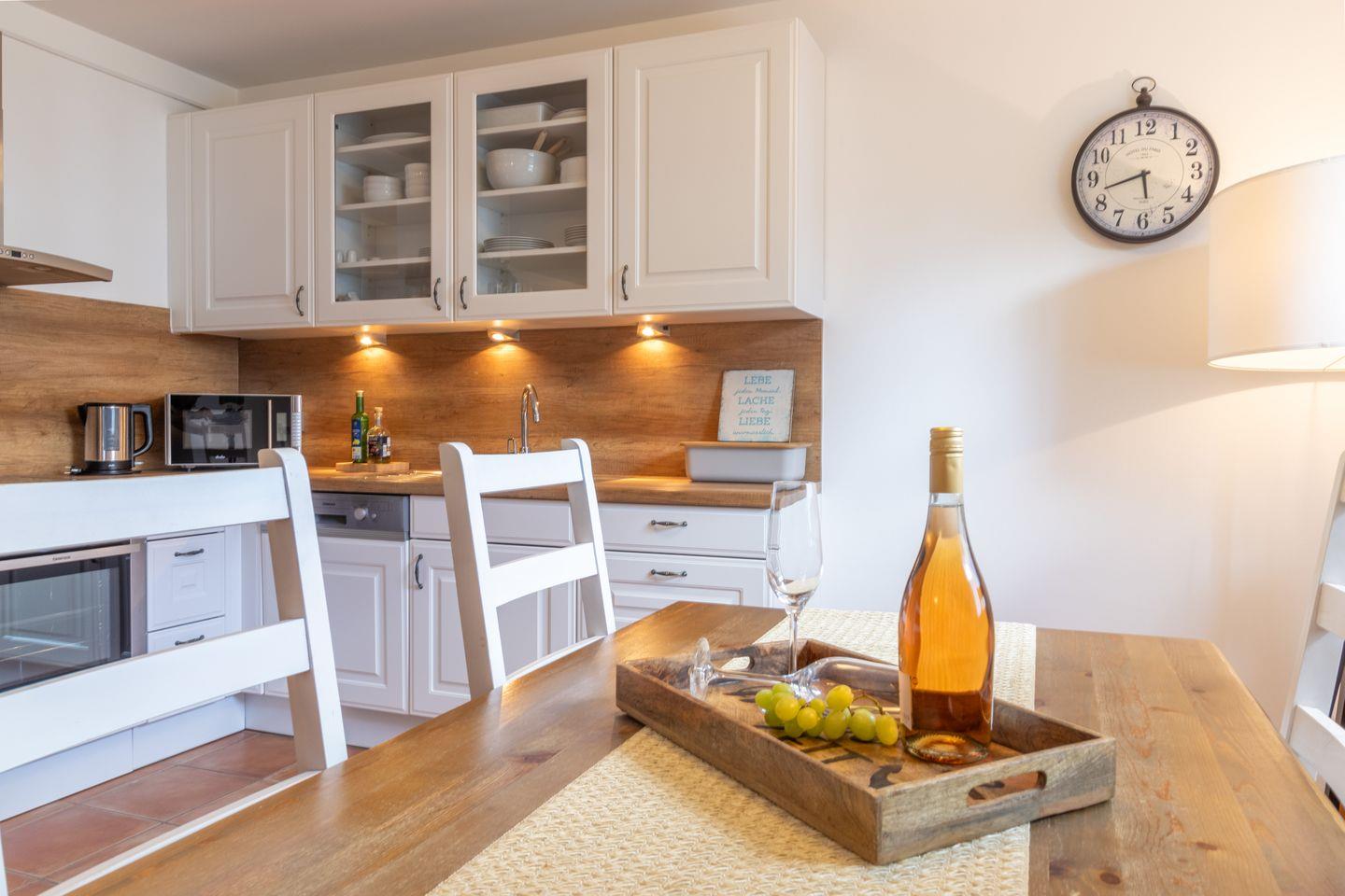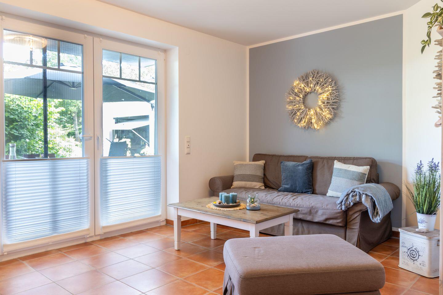 Der helle Wohnbereich überzeugt mit nordischem Stil, klaren Linien und gemütlicher Wohnlandschaft, die auch als Schlafcouch nutzbar ist. Die offene Küche ist vollständig ausgestattet und lädt zu gemeinsamen Kochmomenten ein. Am Esstisch kannst du mit Familie oder Freunden gesellige Stunden verbringen. Von hier gelangst du direkt auf die Terrasse mit angrenzendem Garten – ein ruhiger Platz für sonnige Stunden. Auch Fahrräder finden dort bequem Platz.
