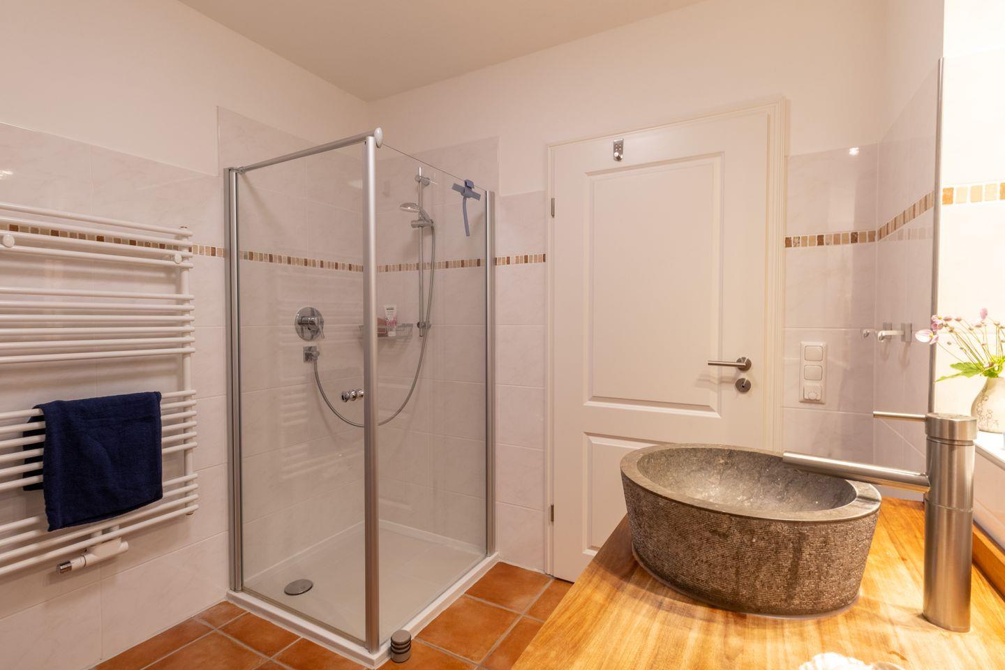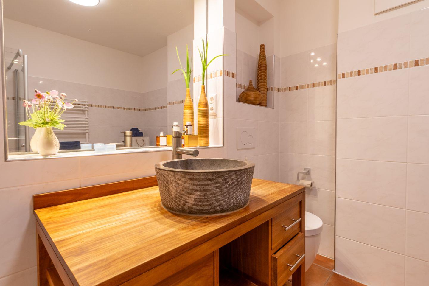 Im modernen Bad mit bodengleicher Dusche genießt du Komfort und Design zugleich. Ein Waschtrockner steht dir ebenfalls zur Verfügung – praktisch für längere Aufenthalte.