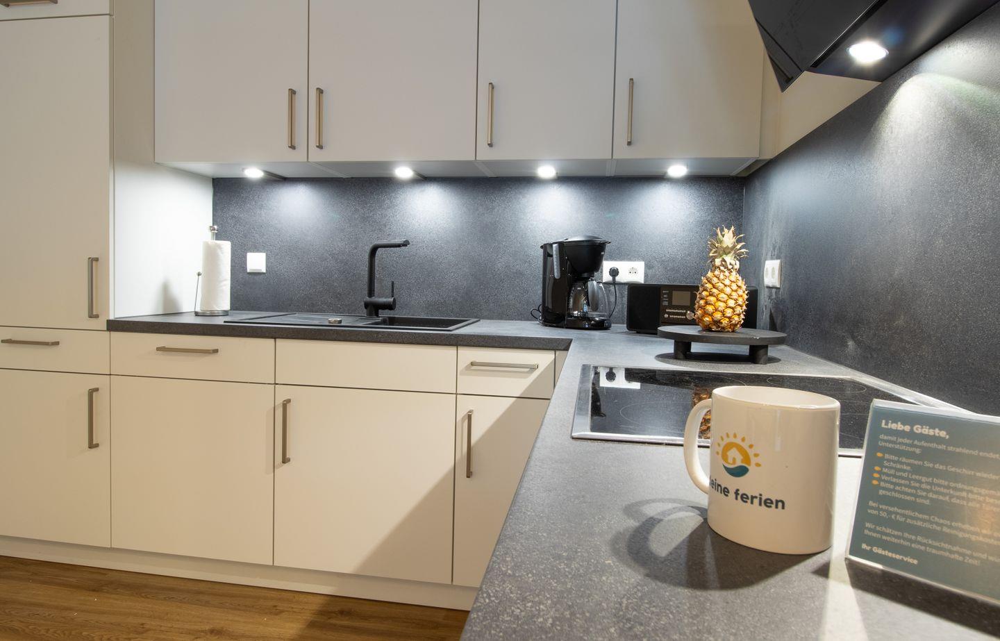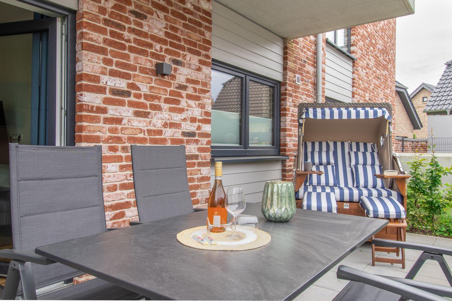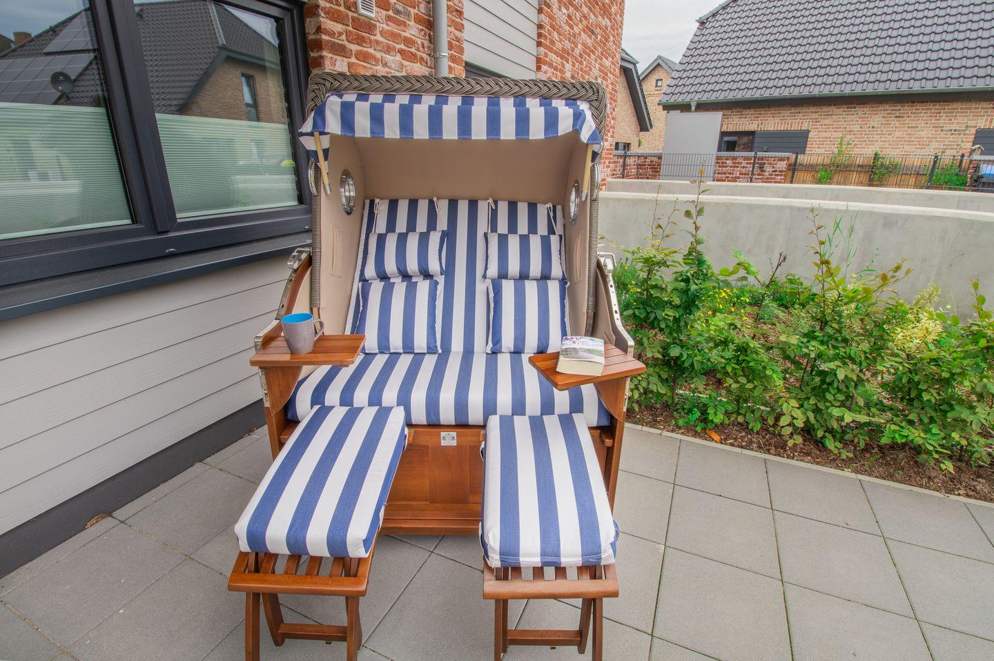 Der offene, lichtdurchflutete Wohnbereich ist geschmackvoll eingerichtet und bietet mit Schlafsofa, TV und großen Fenstern ein gemütliches Ambiente zum Entspannen. Die moderne Küche ist voll ausgestattet – vom Geschirrspüler über den Backofen bis hin zum Essbereich für gemeinsame Mahlzeiten. Die angrenzende Terrasse mit Gartenanteil ist ideal, um die frische Ostseeluft zu genießen. Ein Strandkorb rundet das Outdoor-Erlebnis ab.