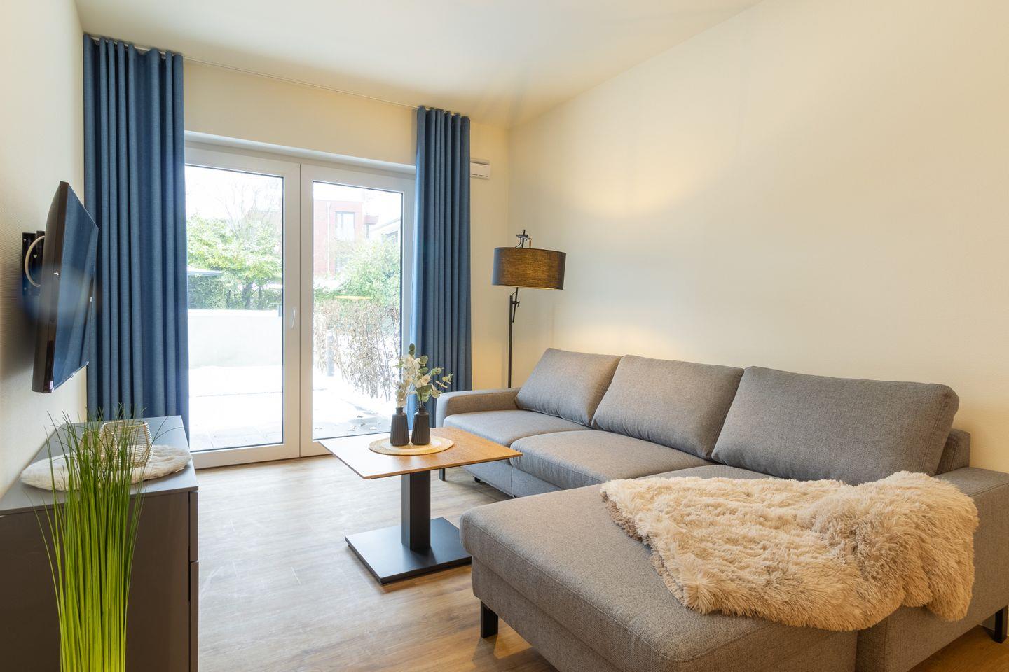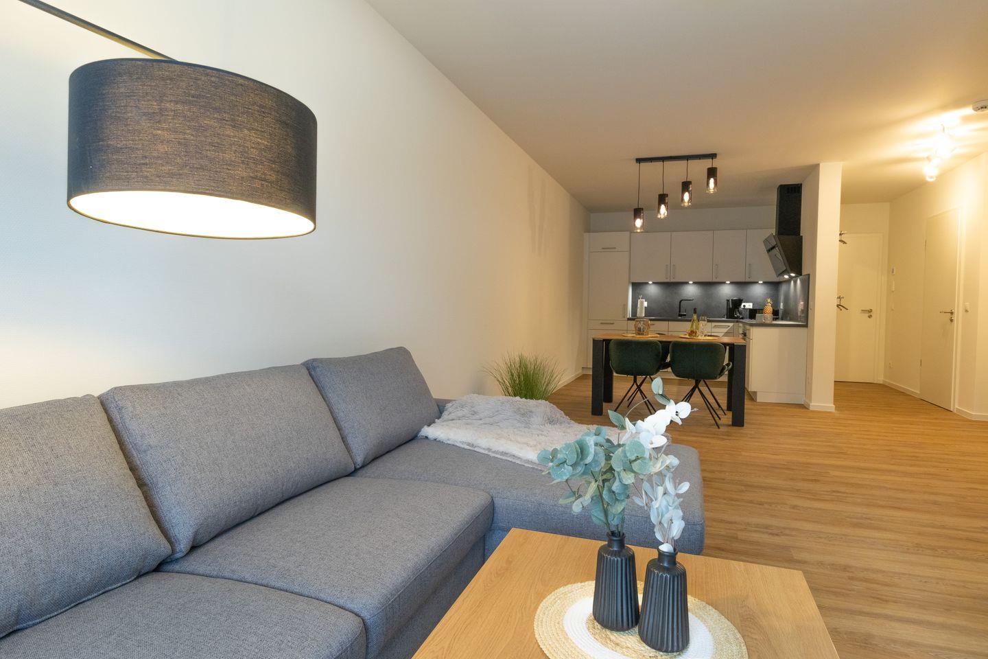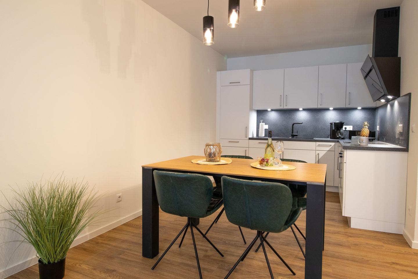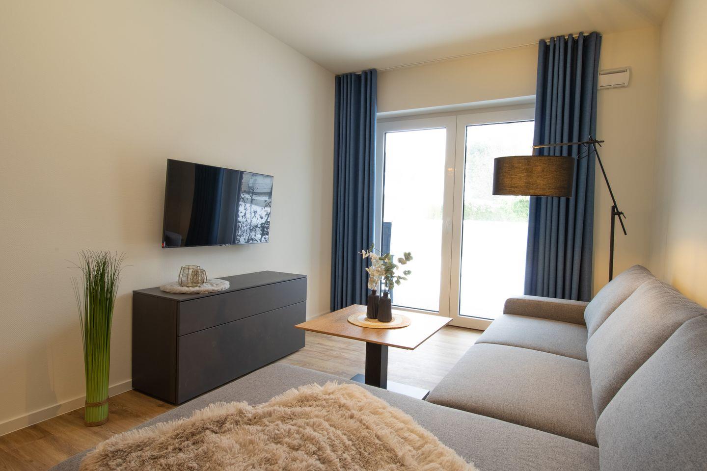 Der offene, lichtdurchflutete Wohnbereich ist geschmackvoll eingerichtet und bietet mit Schlafsofa, TV und großen Fenstern ein gemütliches Ambiente zum Entspannen. Die moderne Küche ist voll ausgestattet – vom Geschirrspüler über den Backofen bis hin zum Essbereich für gemeinsame Mahlzeiten. Die angrenzende Terrasse mit Gartenanteil ist ideal, um die frische Ostseeluft zu genießen. Ein Strandkorb rundet das Outdoor-Erlebnis ab.