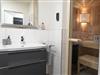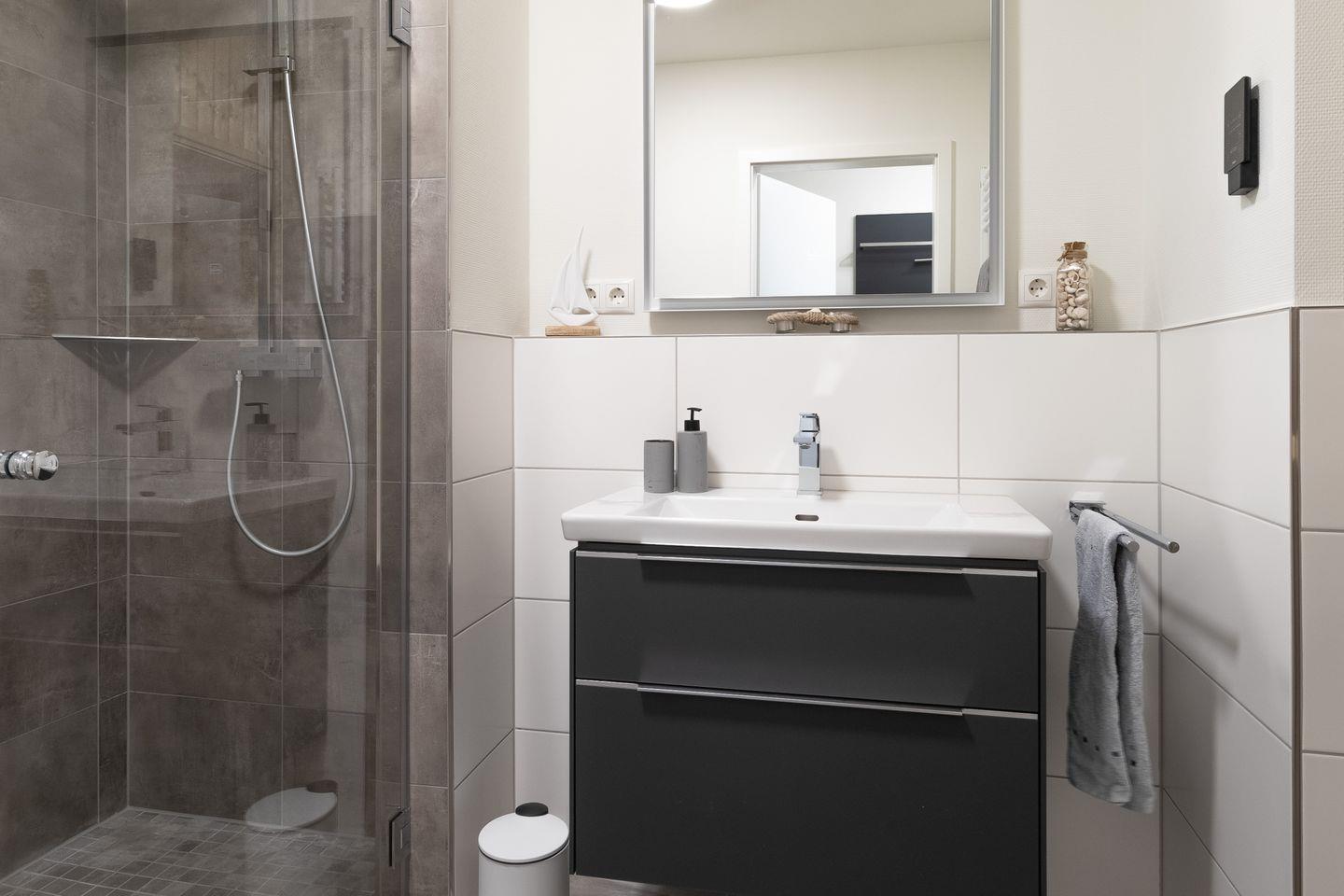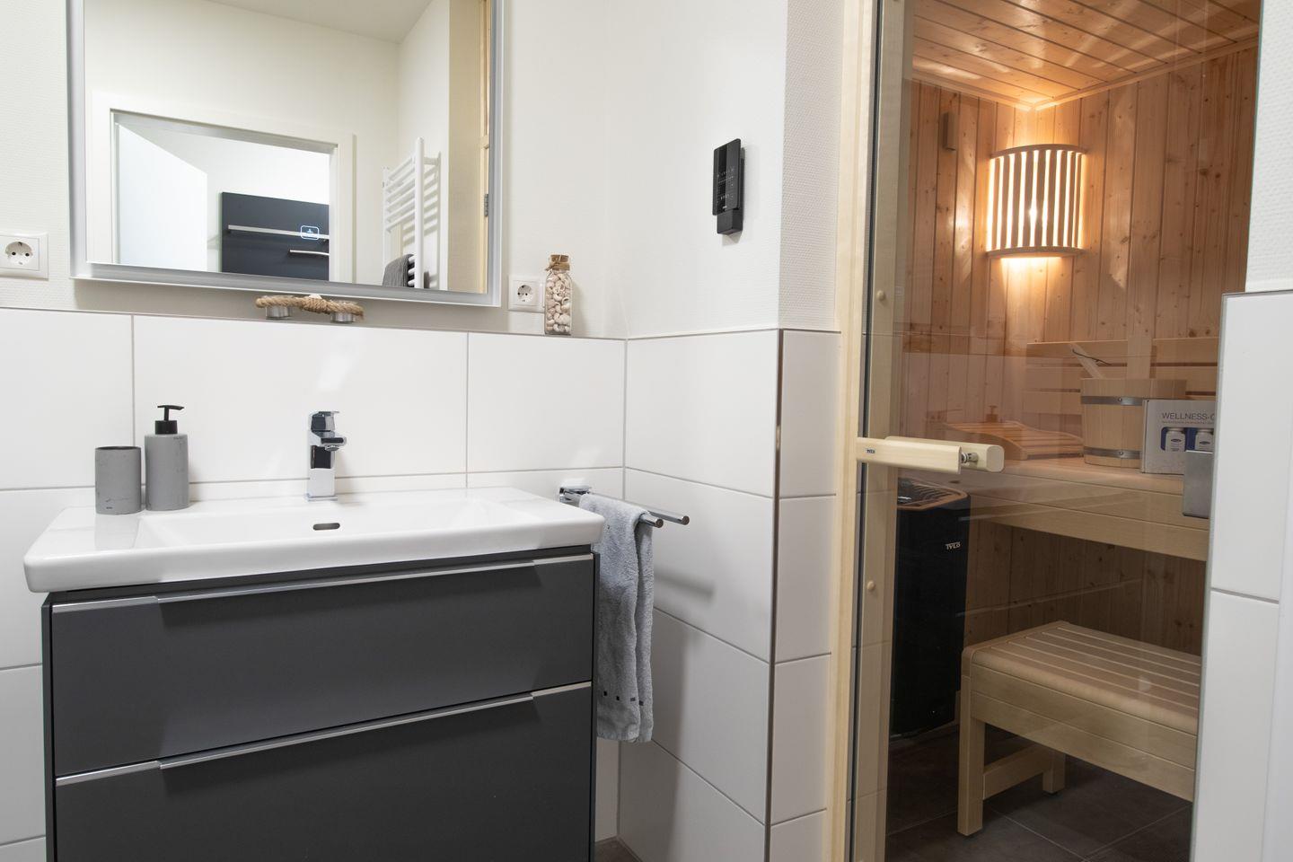 Das geschmackvoll eingerichtete Bad mit bodentiefer Dusche und privater Sauna lädt zum Abschalten ein. Starte erfrischt in den Tag oder gönn dir deine persönliche Auszeit nach einem langen Strandspaziergang – Entspannung garantiert.