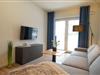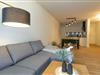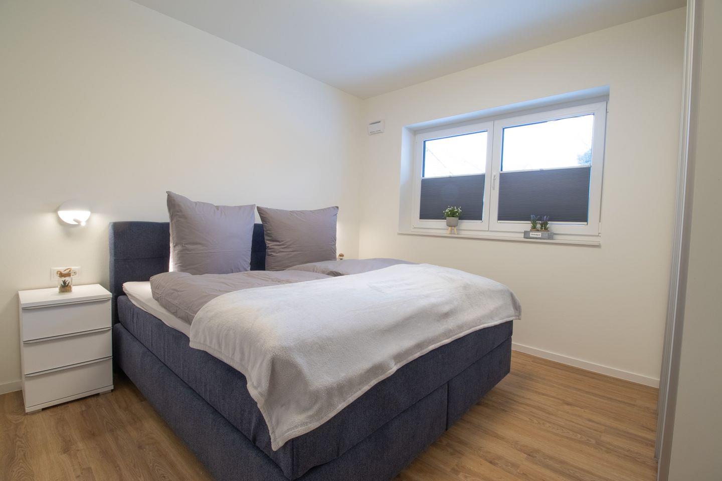 Das Schlafzimmer ist mit einem komfortablen Boxspringbett ausgestattet und bietet dank Plissees ideale Verdunkelungsmöglichkeiten für erholsame Nächte. Auch ein TV ist vorhanden – perfekt für entspannte Abendstunden. Zwei weitere Gäste finden auf dem Schlafsofa im Wohnbereich Platz.