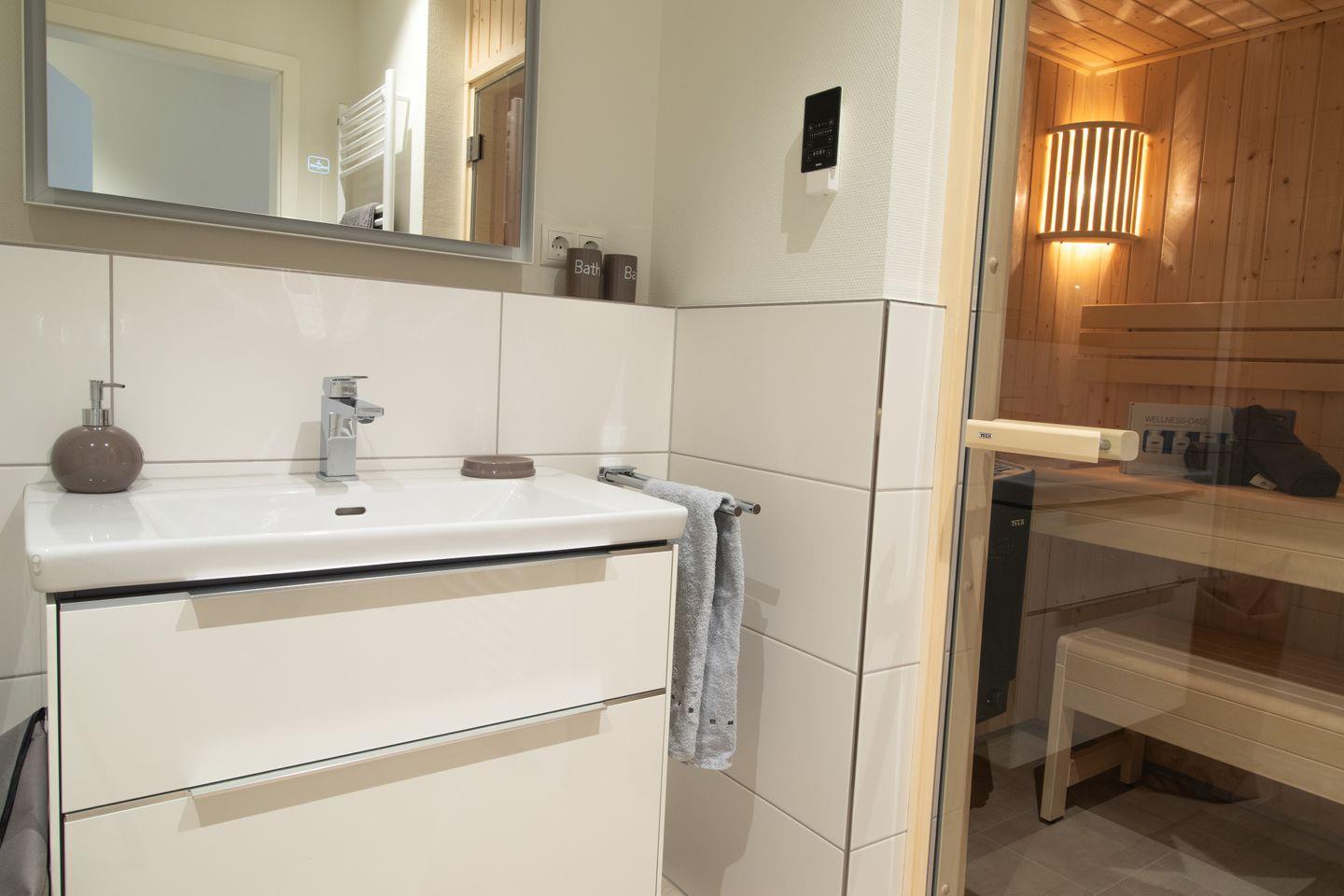 Das moderne Badezimmer mit großer, bodentiefer Dusche und privater Sauna wird zu deinem ganz persönlichen Spa. Gönn dir entspannte Momente nach einem Tag am Meer – oder einfach so.