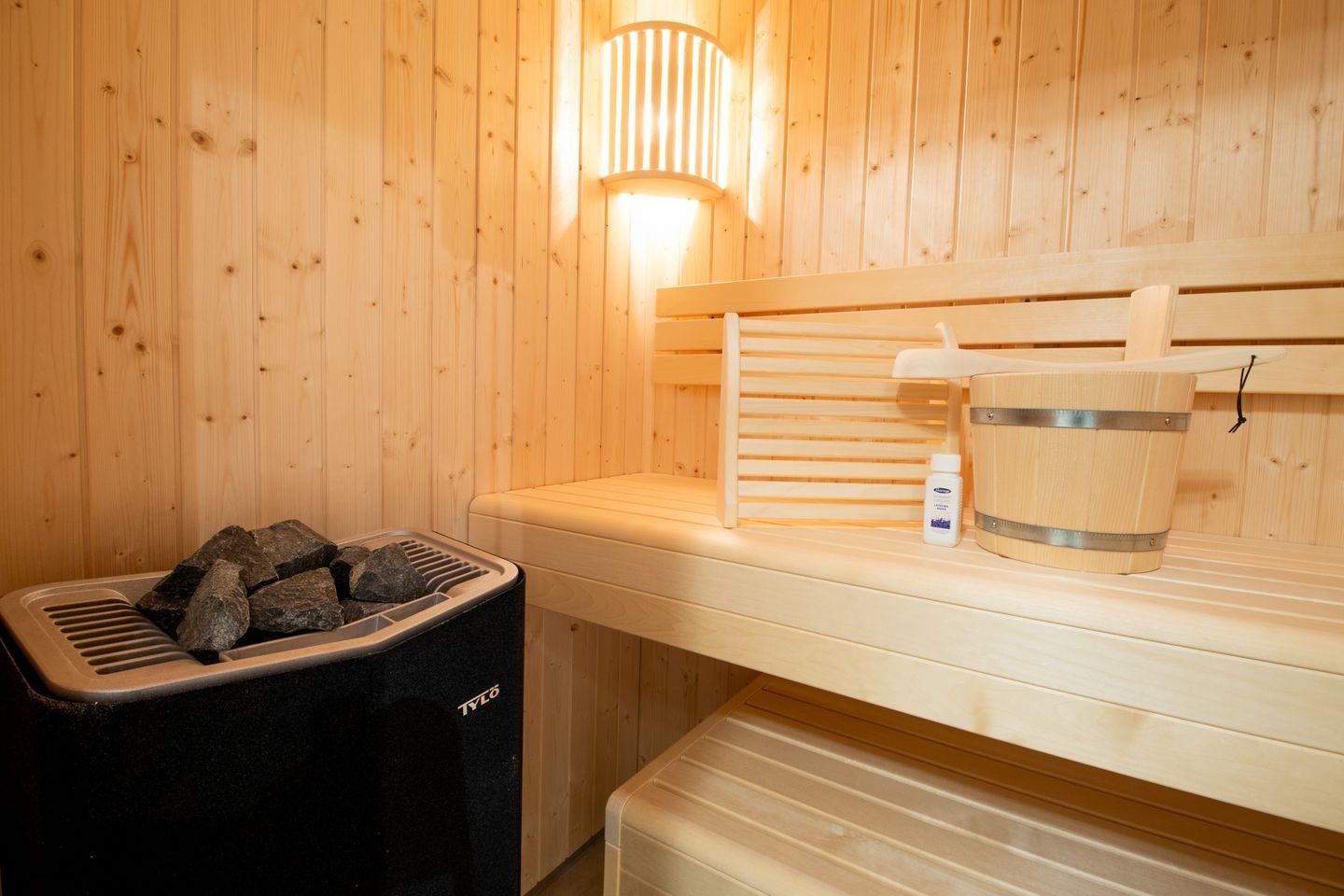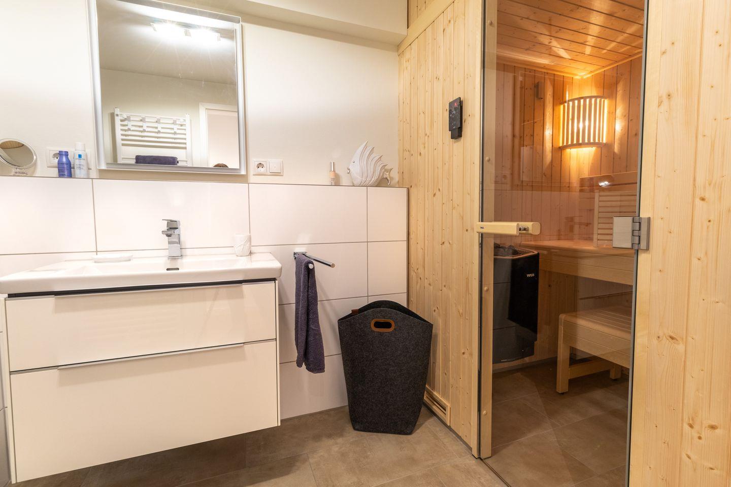 Das moderne Bad ist hochwertig ausgestattet. Du nutzt eine bodengleiche Dusche und eine private Sauna. Hier entspannst du nach einem Strand- oder Ausflugstag. Der klare Stil schafft eine ruhige Atmosphäre.
