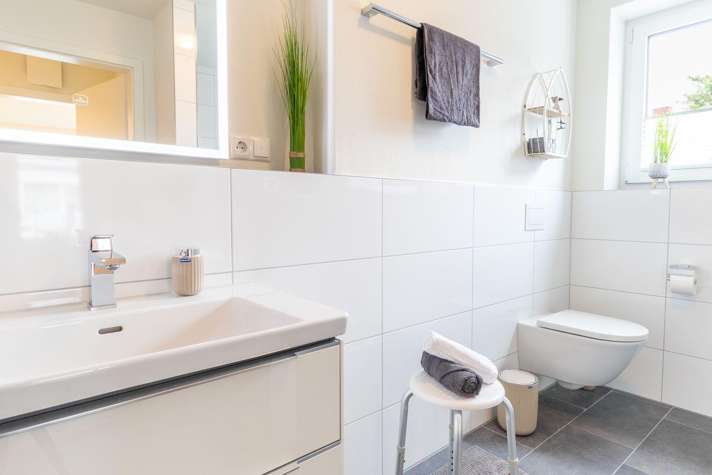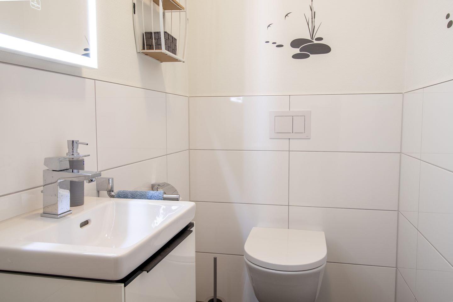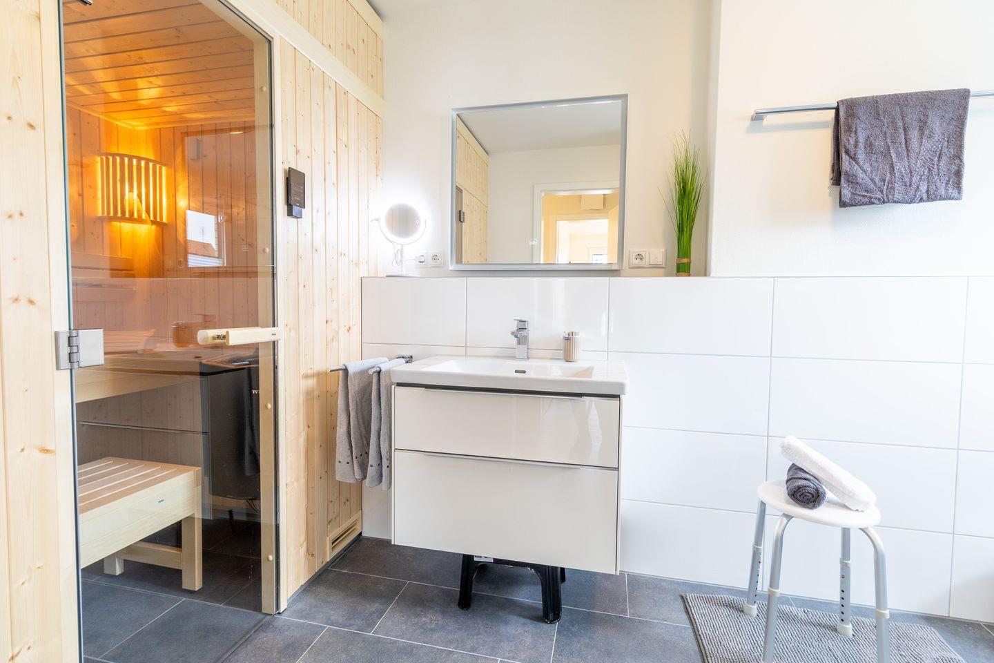 Deine private Sauna lädt zum Entspannen ein – ob nach einem Strandspaziergang oder an kühleren Tagen. Das Badezimmer ist mit bodengleicher Dusche und WC ausgestattet. Ein zusätzliches Gäste-WC erhöht den Komfort bei voller Belegung.