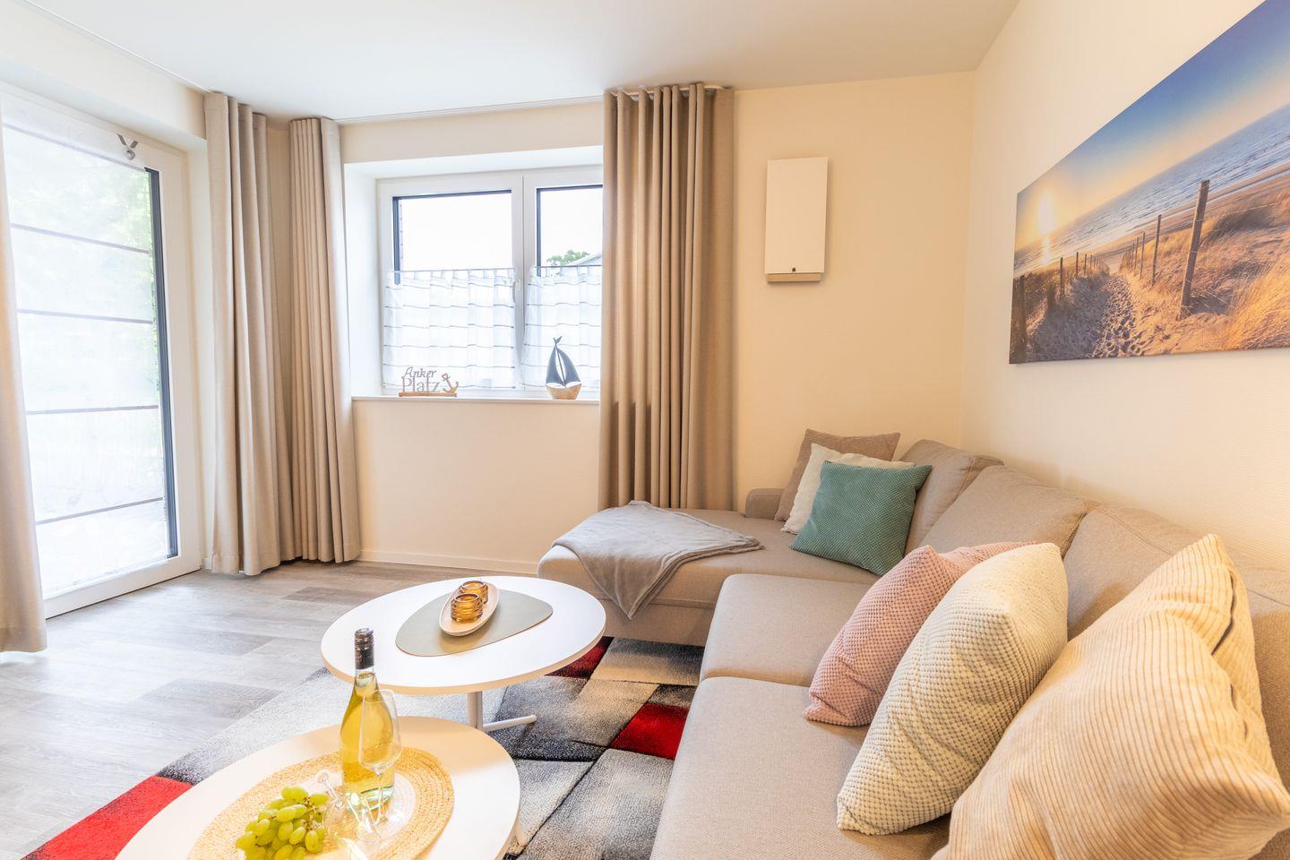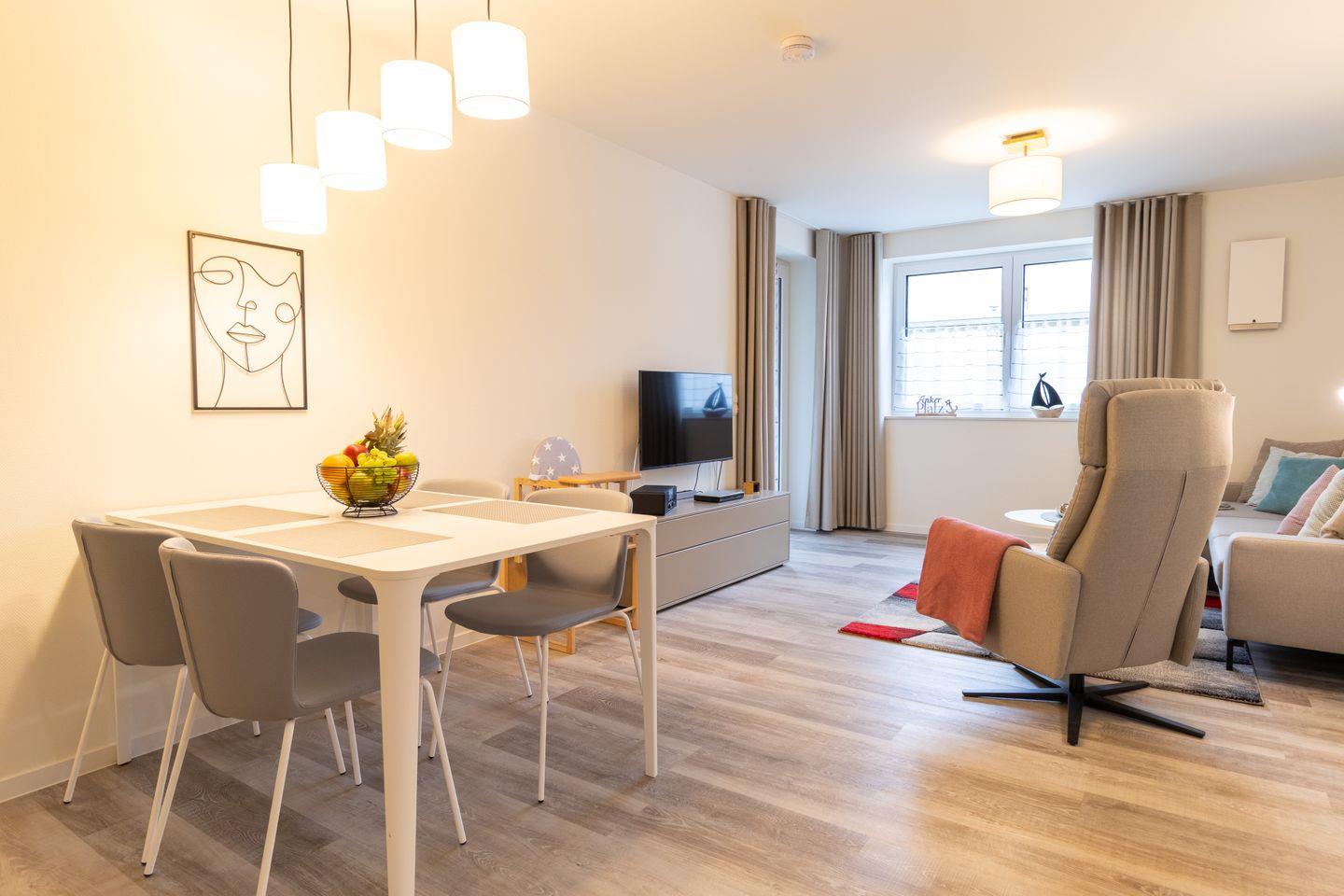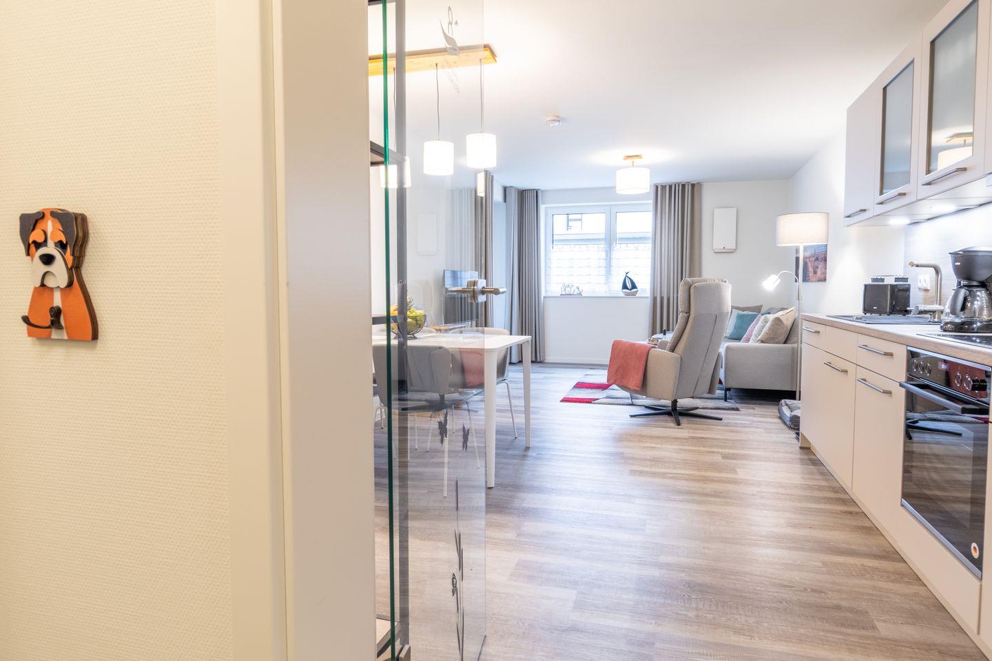 Nur 100?m vom Strand entfernt liegt diese moderne Erdgeschosswohnung mit großer Terrasse, privater Sauna, zwei Schlafzimmern, Fußbodenheizung und barrierearmer Ausstattung. Perfekt für Paare, Familien oder Gäste mit Hund – komfortabel, ruhig und hochwertig.