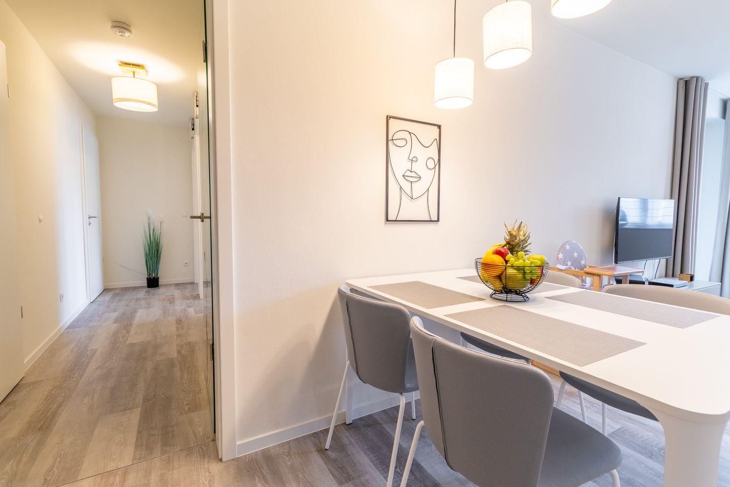 Ein moderner Tiefgaragenstellplatz (Durchfahrtshöhe 2,15 m) ist im Preis inklusive. Vor dem Haus findest du eine E-Ladestation für dein Elektroauto. Für Fahrräder steht ein abschließbarer Fahrradraum zur Verfügung. Der kontaktlose Check-in über Schlüsseltresor sorgt für eine flexible und bequeme Anreise. Und das Beste ist – euer Hund darf euch gerne begleiten.