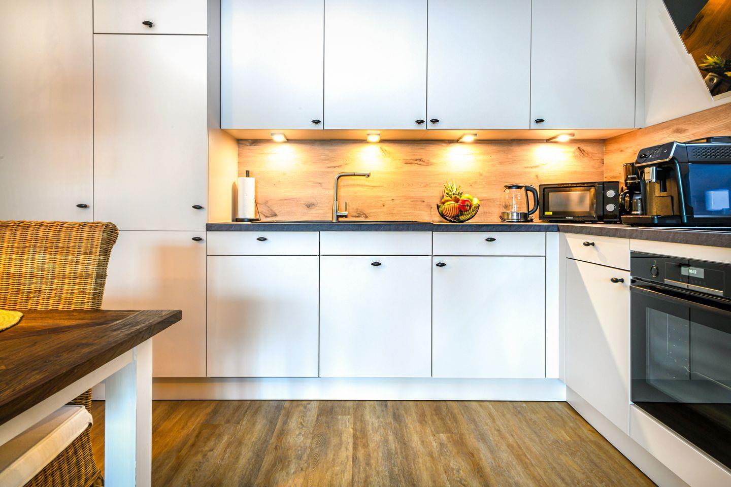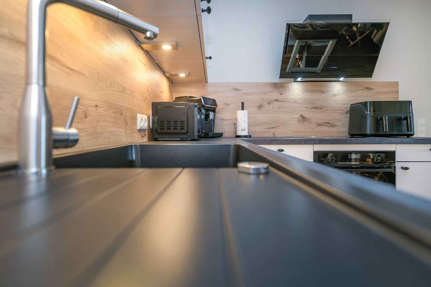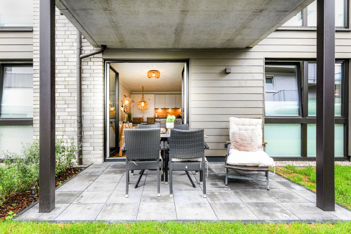 Der offene Wohn- und Essbereich ist hell und einladend gestaltet. Bodentiefe Fenster schaffen eine freundliche Atmosphäre mit Blick in den eigenen Garten. Die offene Küche ist voll ausgestattet – inklusive Airfryer – und lädt zum gemeinsamen Kochen ein. Genieße die Süd-West-Terrasse mit direktem Zugang ins Grüne. Eine Fußbodenheizung sorgt für angenehme Wärme im ganzen Wohnbereich.