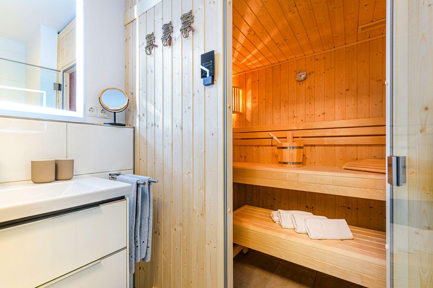 Die private Sauna in der Wohnung macht deinen Aufenthalt zu einem echten Wohlfühlerlebnis – ideal nach einem langen Strandspaziergang oder an kühleren Tagen.