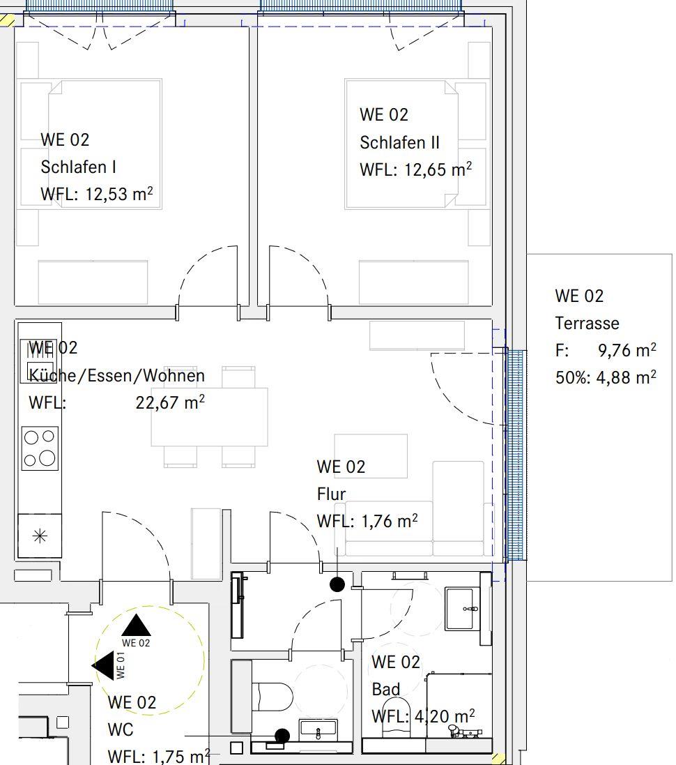 Zwei gemütliche Schlafzimmer sorgen für erholsamen Schlaf, das moderne Bad mit Dusche sowie ein separates WC bieten angenehmen Komfort – ideal auch für Familien. Im offenen Wohn-Essbereich erwartet Sie eine stilvolle Esstafel für gemeinsame Mahlzeiten, eine bequeme Sofa-Ecke mit TV für entspannte Abende – und der direkte Zugang zur möblierten Terrasse lädt zum Frühstück in der Morgensonne oder zum Tagesausklang mit einem Glas Wein ein.