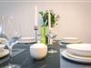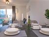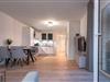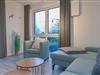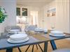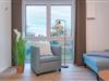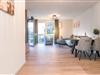 Der offen gestaltete Wohnbereich bietet viel Platz für gemeinsame Urlaubszeit. Die gemütliche Sofalandschaft mit Sessel lädt zum Entspannen ein, während der Smart-TV für Unterhaltung am Abend sorgt. Große Fenster lassen viel Tageslicht in den Raum und führen direkt auf den Balkon. Die moderne Küche ist offen in den Wohnraum integriert und komplett ausgestattet. Der Essbereich bietet einen schönen Platz für gemeinsame Mahlzeiten und gesellige Stunden.