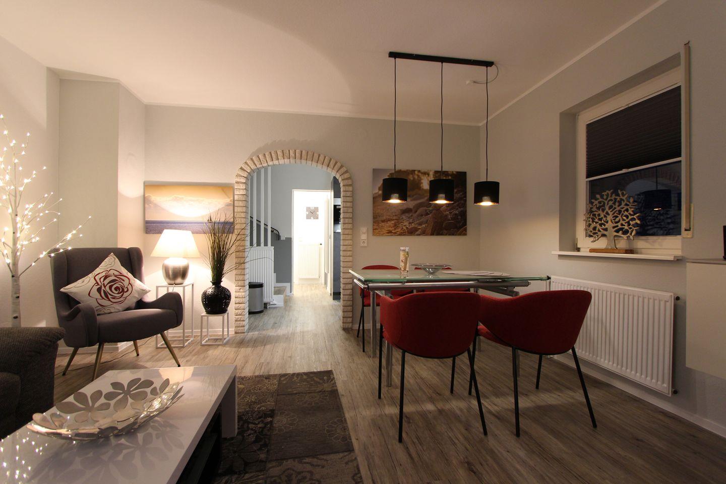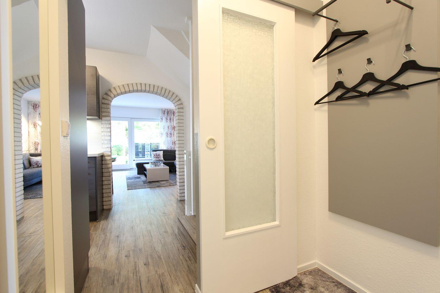 Urlaub mit idyllischem Garten, Strandnähe, auf zwei Ebenen für max. 4 Personen in einer Doppelhaushälfte. Im Erdgeschoss befindet sich ein großes Wohnzimmer mit Sofaecke und Essbereich. Durch die große Fensterfront zum Garten ist der Wohnbereich sehr hell und einladend. Die Küche des Hauses liegt vor dem Wohnbereich und ist durch einen großen Rundbogen zu erreichen. Ausgestattet mit Gefrierfach im Kühlschrank, Backofen und einer Geschirrspülmaschine ist hier alles gegeben, was man für die Zubereitung einer leckeren Mahlzeiten braucht. Außerdem befindet sich im Erdgeschoss noch ein helles Duschbad mit Fenster. Die Schlafräume sind im Obergeschoss angelegt. Eines ist mit einem Doppelbett (2 Matratzen á 0,90x2,00m), einem Schrank und einem Fernseher ausgestattet, das zweite hat zwei zusammengeschobene Einzelbetten (2 Matratzen á 0,90x2,00m), einen Schrank und ebenso ein TV. Außerdem ist auch oben ein Duschbadezimmer vorhanden. Die Terrasse mit Ost-Lage erreicht man durch das Wohnzimmer. Eine 2. Terrasse befindet sich unten im Garten und bietet zusätzlich nachmittags bis in die Abendstunden sonnige Momente. Der Garten und die Terrasse sind mit der anliegenden Doppelhaushälfte eingezäunt und ein Mährobotor übernimmt die Pflege des Rasens. Die Garage ist nicht im Mietumfang enthalten, aber der rechte Carportbereich vor der Garage darf gerne genutzt werden, ebenso die Ladestation für E-PKW (gegen Gebühr). Ein schöner Spaziergang von ca. 6 Minuten führt direkt an den Kellenhusener Strand. Auch dem Urlaub mit dem Haustier steht generell nichts im Wege, denn nach Rücksprache und gegen Aufpreis darf auch Ihr Hund mit anreisen. Wir möchten darauf hinweisen, dass im Nebenhaus auch ein Hund wohnt. Zur Anreise sollte daher ein Kennenlernen der Hunde möglich sein. Bei diesem Objekt ist die Erstausstattung an Handtüchern und Bettwäsche inklusive, außerdem ist eine Waschmaschine vorhanden.