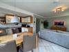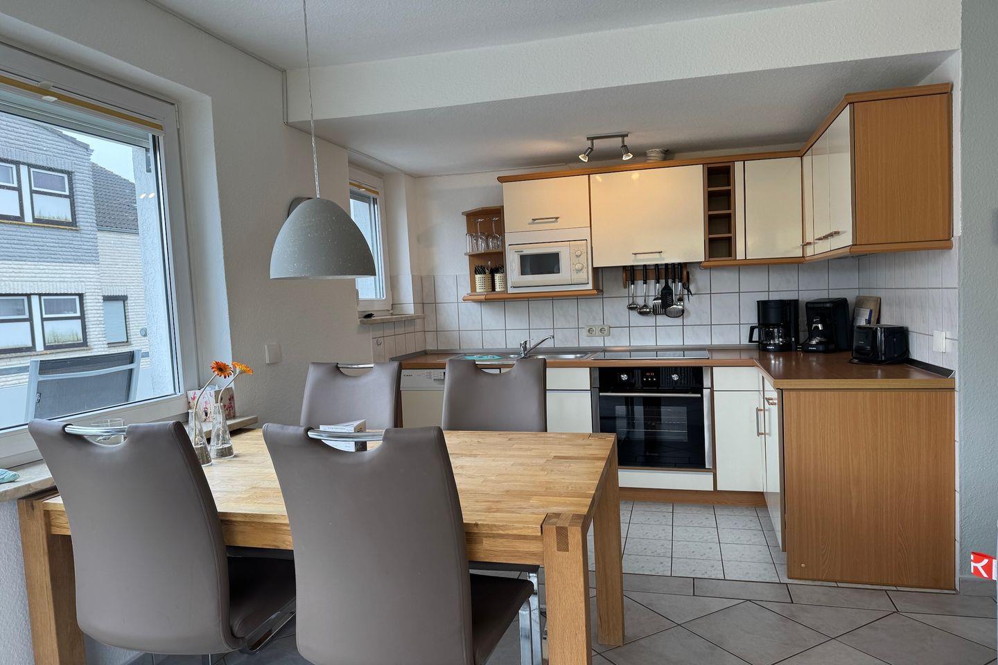 Im hellen, offenen Wohnbereich befindet sich eine gemütliche Sitzecke, der Essbereich sowie eine moderne Küchenzeile mit Induktionskochfeld, Backofen, Mikrowelle, Kaffeemaschine und Geschirrspüler.