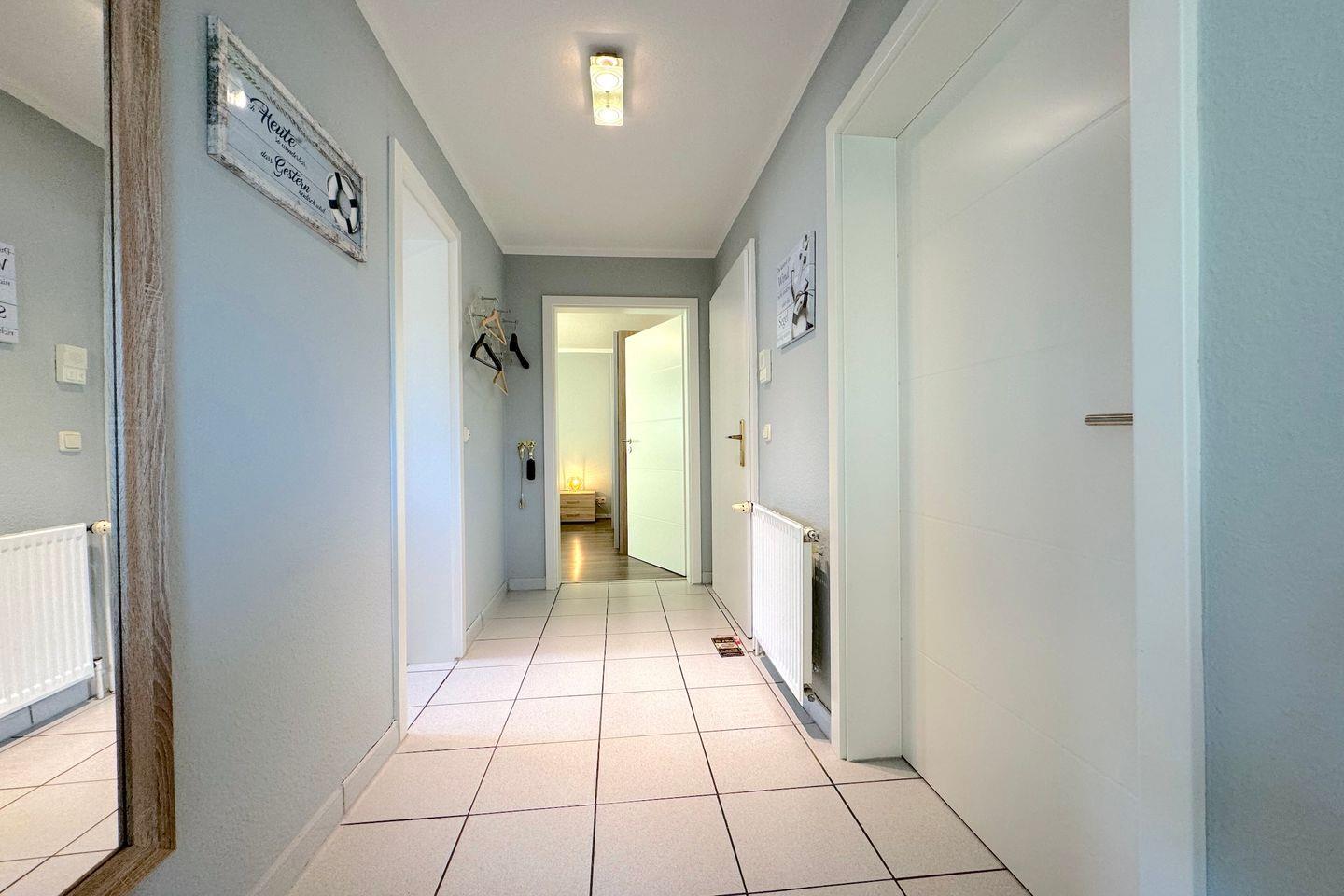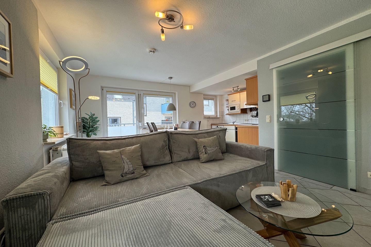 Gemütliche 2-Personen-Ferienwohnung direkt am Deich – nur 1 Gehminute zum Strand! Die 48 m² große Nichtraucherwohnung bietet ein helles Wohnzimmer mit Küche und Südwest-Balkon, ein separates Schlafzimmer und einen Fahrradraum. Hunde sind auf Anfrage willkommen. Waschmaschine, Trockner und Wäschepaket zubuchbar.
