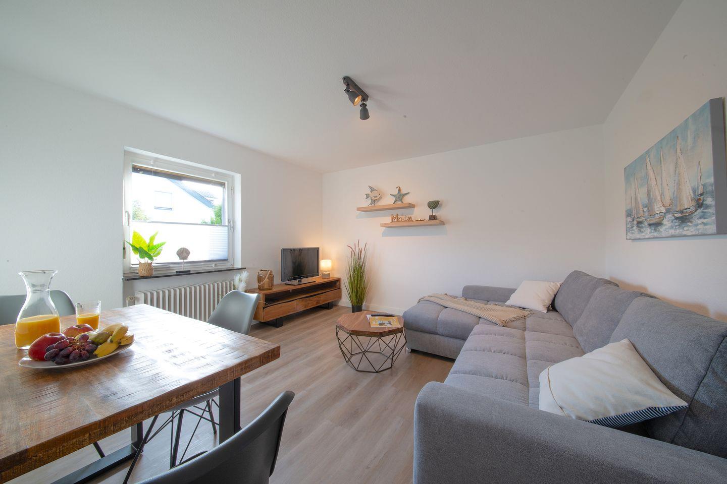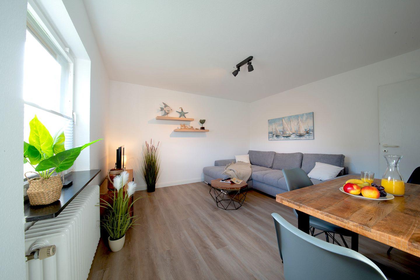 Die rund 50?m² große Erdgeschosswohnung bietet ausreichend Platz für einen erholsamen Aufenthalt an der Ostsee. Der offene Wohnbereich ist mit einem bequemen Schlafsofa, einem Esstisch sowie einer gut ausgestatteten Küchenzeile funktional und einladend gestaltet.
