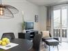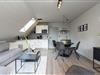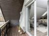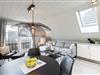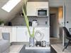 Die Wohnung 6 liegt im Obergeschoss und ist ca. 40 qm groß. Der Wohnbereich ist offen und hell gestaltet durch eine schöne Fensterfront zum Balkon. Integriert im Wohnbereich sind der Essbereich und die Küchenzeile mit Geschirrspülmaschine und Mikrowelle.