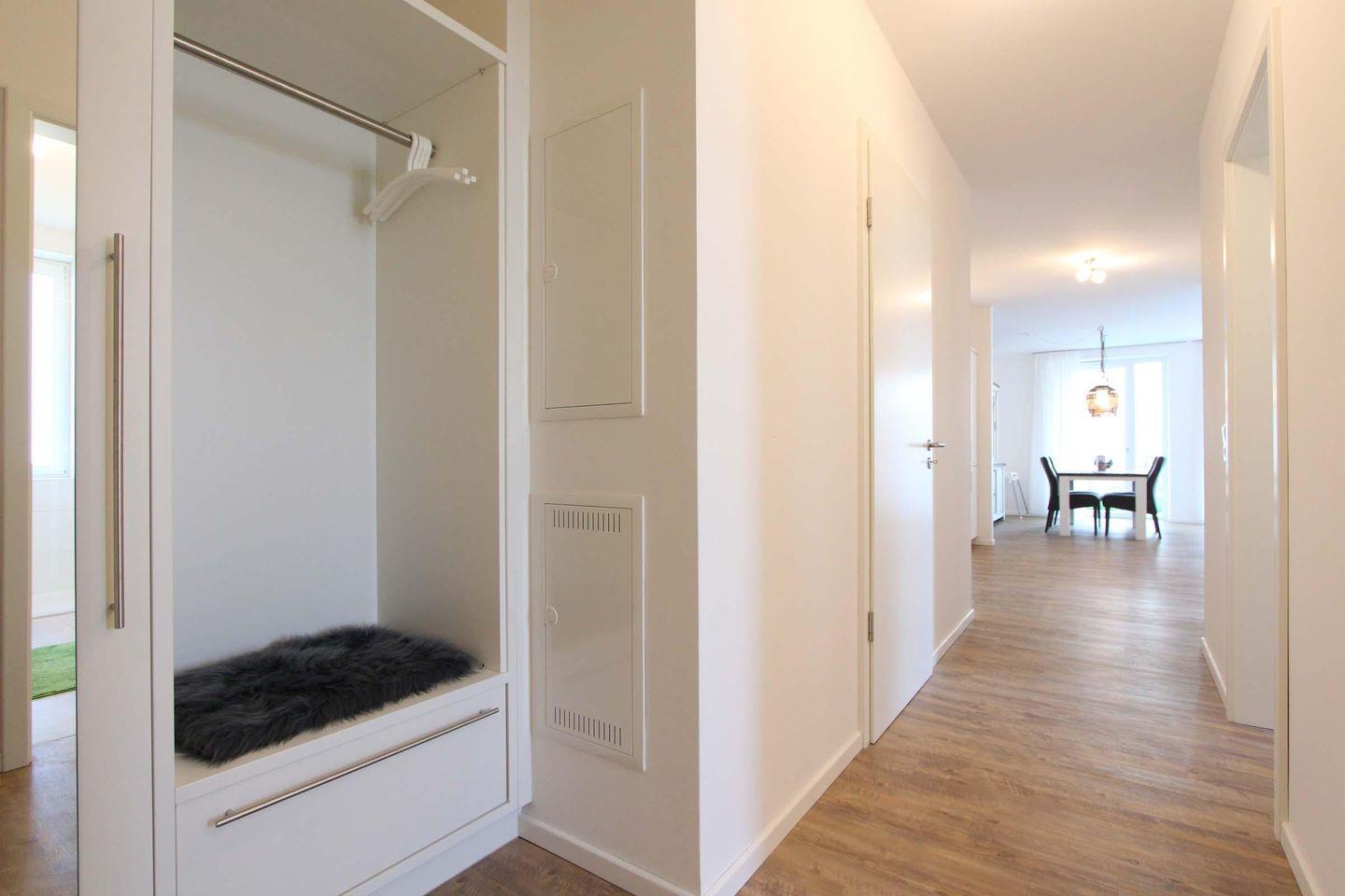 Eine sehr schöne und stilvolle Nichtraucherwohnung mit ca. 73 qm liegt im Erdgeschoss des "KellenHus". Geeignet ist die Wohnung bestens für 4 Personen. Das Wohnbereich ist sehr schick, rustikal und maritim eingerichtet. Mit Sofaecke, Essbereich und der offener Küche ist der Wohnraum sehr stimmig gestaltet und lädt zum erholen und entspannen ein. Die Küchenzeile verfügt über einen Geschirrspüler und einen Backofen und ist generell sehr hochwertig und modern. Zwei separate Schlafzimmer sind vorhanden, eines mit einem Doppelbett (2 Matratzen á 0,90x2,00m) und eines mit einem Etagenbett (0,90x2,00m). Für die ganz kleinen Gäste gibt es ein Kinder-Reisebett und einen Hochstuhl. Das Badezimmer ist schick und schlicht gehalten und bietet eine ebenerdige Dusche und ein Fenster. Die Terrasse ist Richtung Süd-Westen gelegen und bietet die Möglichkeit dort schöne sonnige Stunden zu verbringen. Der schöne Sandstrand von Kellenhusen ist in 5 Gehminuten erreicht. Auch dem Urlaub mit dem Haustier steht generell nichts im Wege, denn nach Rücksprache und gegen Aufpreis sind Haustiere gestattet. Sollte das Reisegepäck so gering wie möglich ausfallen, dann ist ein Wäschepaket für den Aufenthalt in Kellenhusen gegen Gebühr einfach buchbar und auch eine Waschmaschine und ein Trockner stehen in der Wohnung zur Verfügung.
