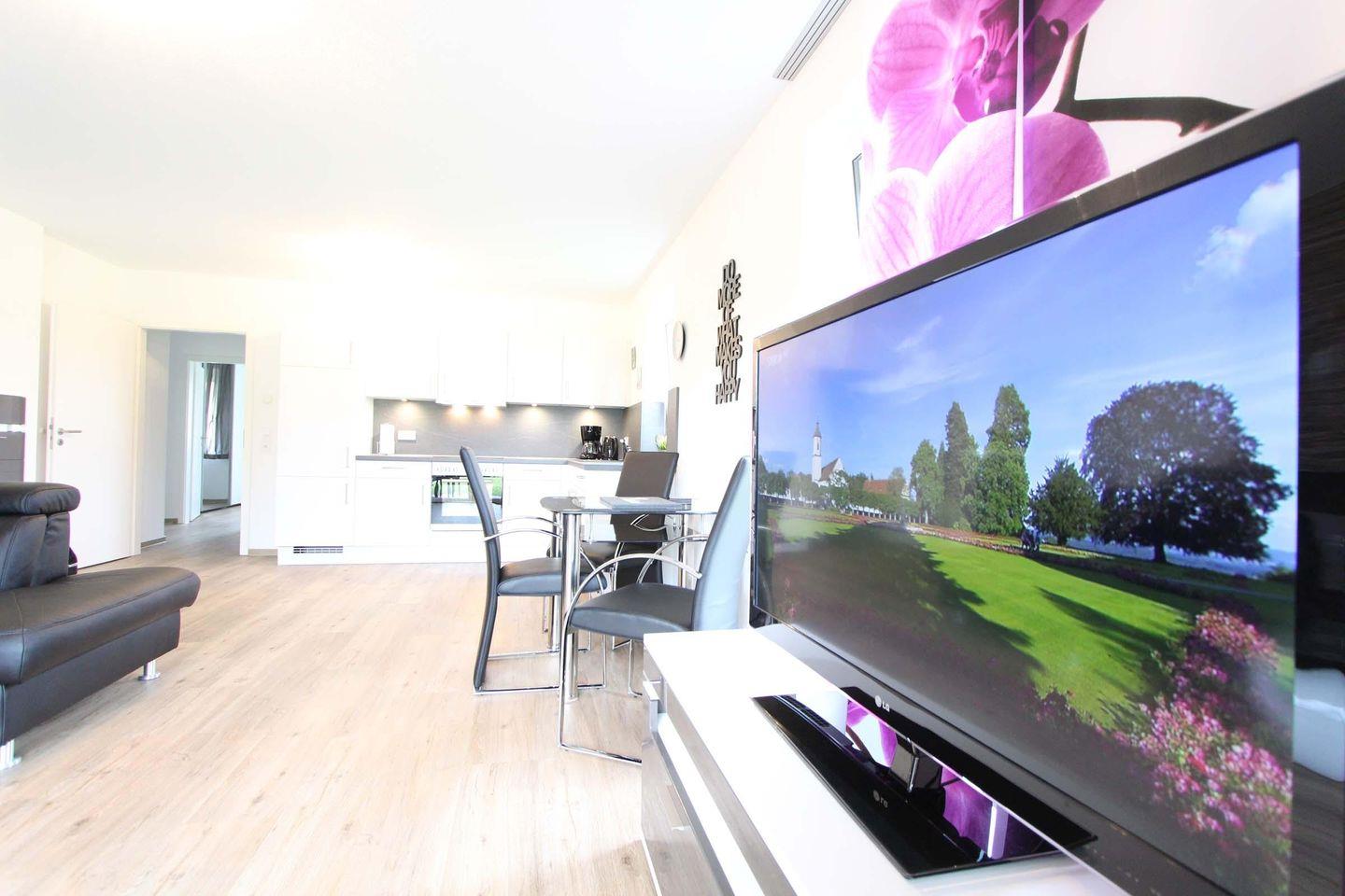 Die ca. 65 qm große Nichtraucher-Wohnung liegt im Erdgeschoss und ist für maximal 2 Erwachsene und ein Kind ausgelegt. Das Wohnzimmer ist sehr großzügig und stilvoll eingerichtet mit einer schicken Couchecke. Der Essbereich und die hochwertige und vollausgestattete Küchenzeile sind ebenfalls im Wohnbereich integriert. Das schöne, große, separate Schlafzimmer ist mit einem Doppelbett (2 Matratzen á 0,90x2,00m) und einem Kleiderschrank eingerichtet. Für Kinder bis zu 12 Jahren ist ein kleines Beistellklappbett (0,80x1,90m) verfügbar und auch eine Sitzerhöhung. Das Schlafzimmer und auch das Wohnzimmer kann mit Rollladen abgedunkelt werden. Im schönen, modernen Badezimmer findet man eine bodengleiche Dusche mit Glaskabine und ansonsten ein sehr geräumiges und schickes Ambiente. Wohlfühlfeeling kommt in der ganzen Wohnung mit Sicherheit auf. Weitere Zusatzpunkte der Wohnung sind ein Tiefgaragenstellplatz (Einfahrthöhe ca. 2,05m), ein Fahrradabstellbereich in der Tiefgarage für mitgebrachte Fahrräder, ein Aufzug im Gebäude, kostenloses WLAN und eine sonnige Süd-West-Terrasse. Der schöne Sandstrand kann ebenfalls innerhalb von nur 5 Gehminuten erreicht werden. Auch dem Urlaub mit dem Hund steht generell nichts im Wege, denn nach Rücksprache und gegen Aufpreis ist ein kleiner bis mittelgroßer Hund gestattet. Sollte das Reisegepäck so gering wie möglich ausfallen, dann ist ein Wäschepaket für den Aufenthalt in Kellenhusen gegen Gebühr einfach buchbar. Ein zweiter Hund ist auf Anfrage möglich.