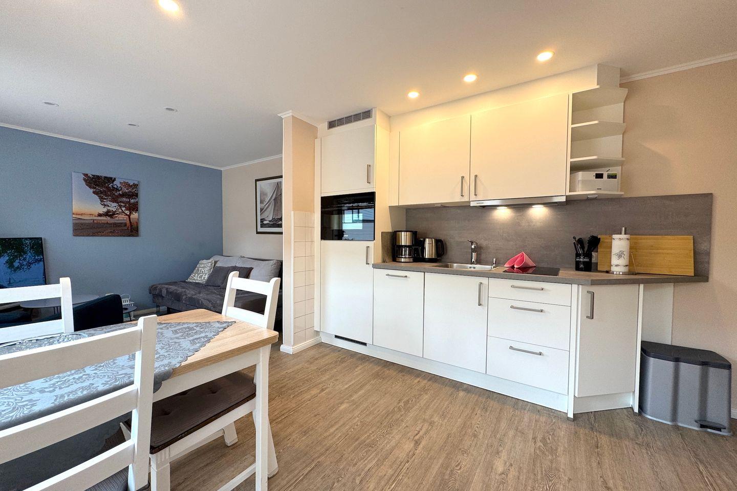 Im offenen Wohn- und Schlafbereich erwartet Sie eine gut ausgestattete Küchenzeile mit Geschirrspüler, Backofen und Mikrowelle. Ein gemütlicher Esstisch, ein Fernseher sowie ein komfortables Schlafsofa runden das wohnliche Ambiente ab. Alles ist geschmackvoll aufeinander abgestimmt und lädt zum Wohlfühlen ein.