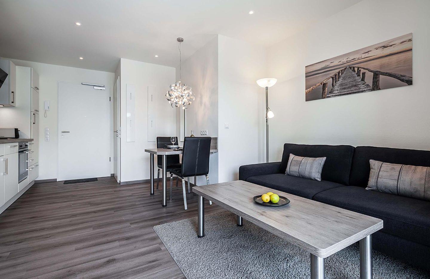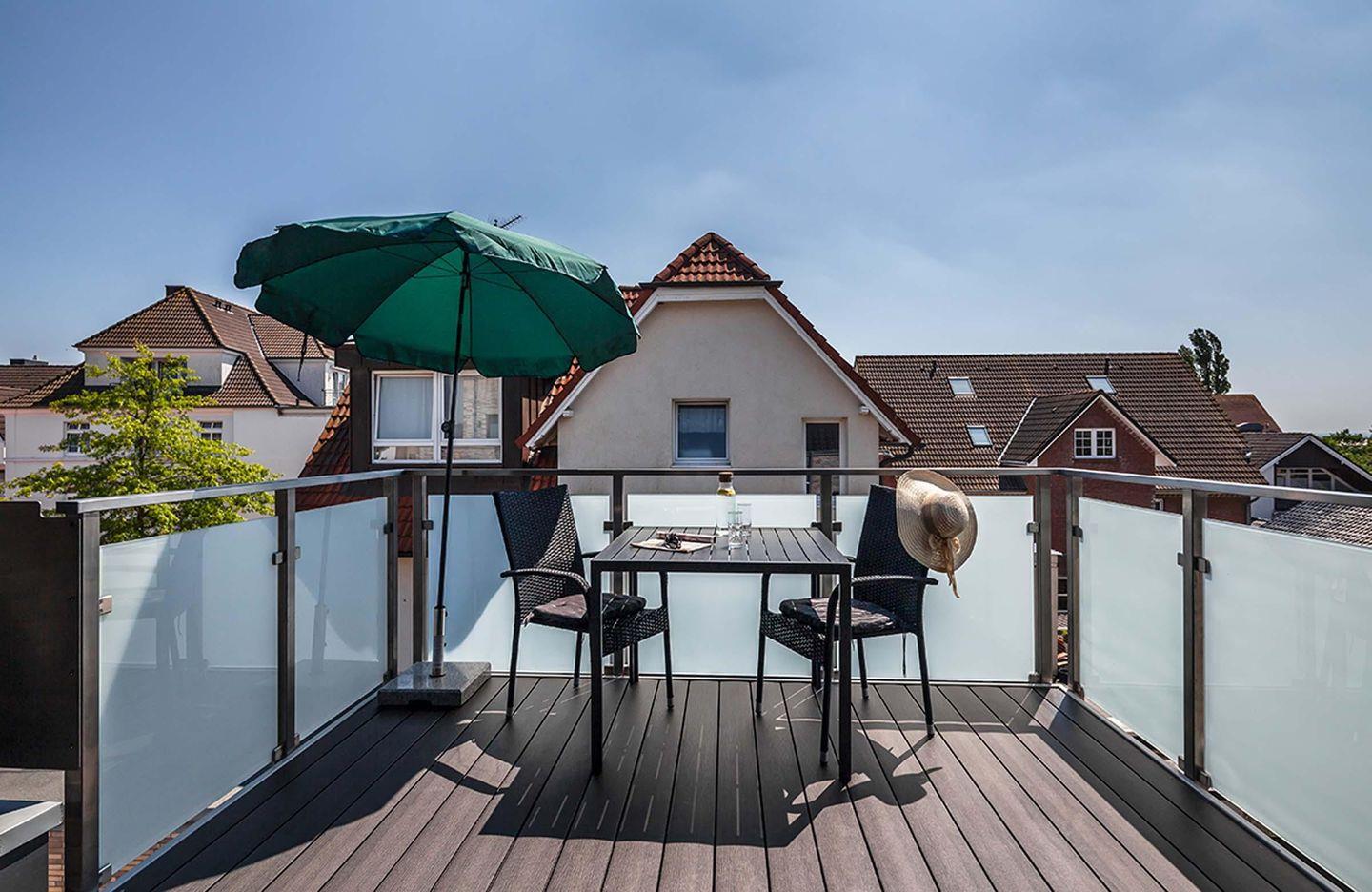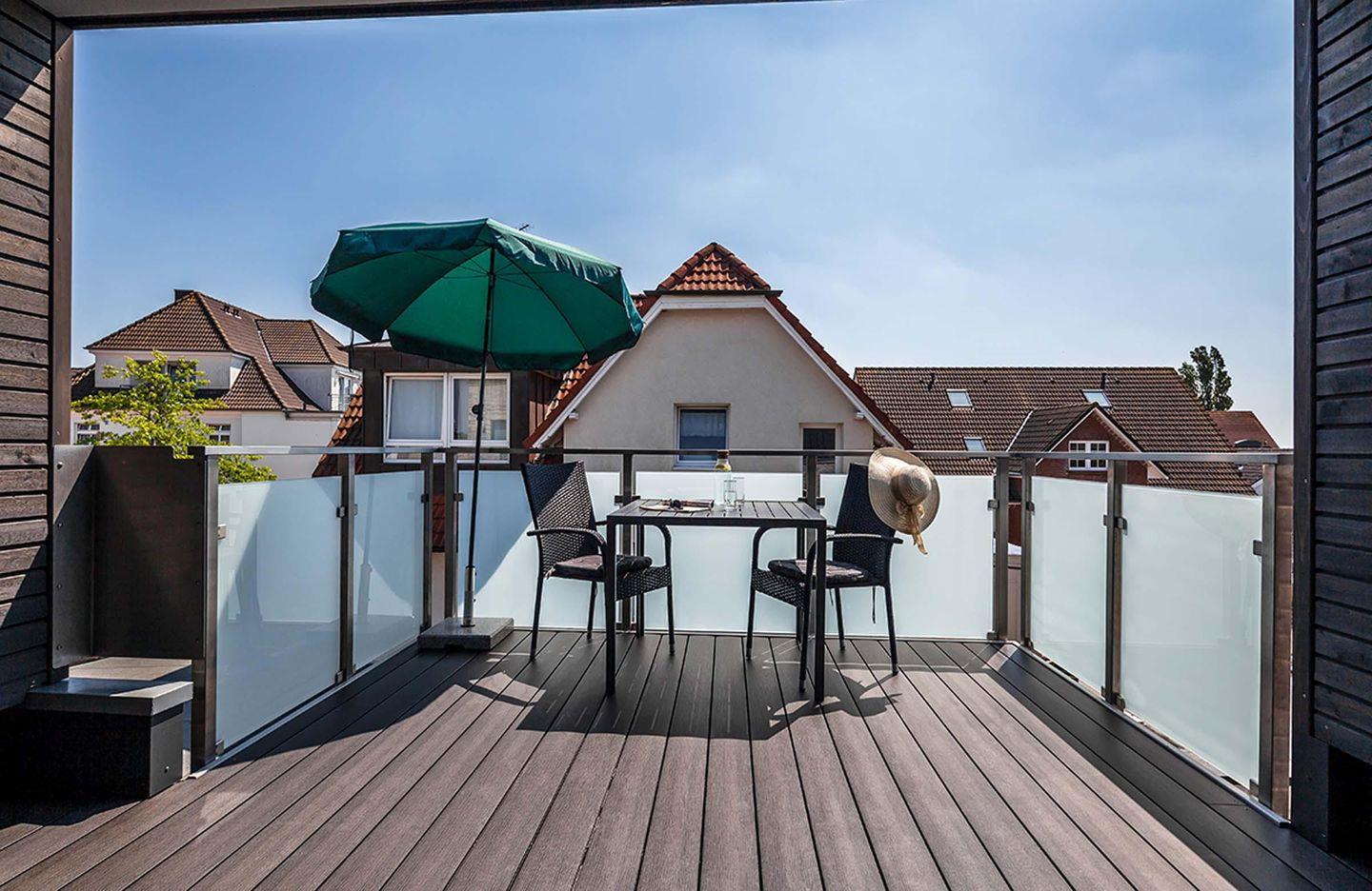 Nur einen Katzensprung von Seebrücke, Strand und Promenade entfernt liegt die im Frühjahr 2019 fertiggestellte Ferienwohnanlage „Sonnengarten“ mit insgesamt 24 Ferienwohnungen und einem Café im Erdgeschoss. Der hintere Bereich des Gebäudes ist gestalterisch sehr ansprechend begrünt und hat den Charakter eines großzügigen Gartens. Hier können die Gäste der Anlage im wahrsten Sinne des Wortes ihre „die Seele baumeln lassen“. Mitgebrachte Fahrräder können in dem großen und überdachten Fahrradstellplatz am Haus abgestellt werden. Die moderne und hochwertig eingerichtete 2-Zimmer Ferienwohnung „Oase im Sonnengarten“ befindet sich im Dachgeschoss dieser exklusiven Ferienwohnanlage. Eine großzügige Loggia mit ansprechenden dunklen Dielen ist dabei nach Süd-Westen (zum Meer) ausgerichtet und bietet den Gästen die perfekte Sonneneinstrahlung. Bei einem weitreichenden Ausblick, z. B. bei einem schönen Frühstück auf der Loggia, kann der Gast seine Blicke über die Ostsee streifen lassen. Die ca. 45 qm Ferienwohnung mit angenehmer Fußbodenheizung ist für 2 Personen ausgelegt und verfügt über ein modern und hell eingerichtetes und komfortabel Ambiente. Über das Wohnzimmer gelangt der Gast zur möblierten Ostsee-Loggia. Ein kostenloses WLAN und einen hauseigenen Tiefgaragenstellplatz (Nr. 12) gehört zum Standard dieser Wohnung. Aus der Tiefgarage bringen zwei Fahrstühle den Gast bis unmittelbar vor die Wohnungseingangstür. Das Wohnzimmer mit allergiker-freundlichen und fußwarmen Design-Vinyl-Dielen, einer vollausgestatteten/integrierten Küche, einem Ess- und Couchtisch mit einer großer schwarzen Couch und einem 40“ Flat Screen TV (SAT) bietet alles, was man zu einem Traum-Urlaub braucht. Warmweiße LED Deckenstrahler unterstreichen den hellen Charakter dieser Wohnung. Die komfortabel eingerichtete Marken-Küche umfasst einen Kühlschrank mit separatem Gefrierfach, Spülmaschine, 4-fach Ceran-Feld mit Backofen, Mikrowelle sowie eine Kaffeemaschine, Toaster, Wasser- und Eierkocher. Die Ausstattung mit Besteck, Gläsern und Geschirr sowie an hilfreichen Küchenutensilien lässt keine Wünsche offen. Das separate Schlafzimmer mit einem großen Dachgeschossfenster und einem elektrischen Rollo hat ein Doppelbett mit bequemen Matratzen, Nachtkonsolen und Leselampen. In dem beleuchteten Kleiderschrank sowie in einem Sideboard kann die mitgebrachte Kleidung gut verstaut werden. Ein weiterer 40“ Flat Screen TV (SAT) ermöglicht das Anschauen eines TV Programms bequem und stressfrei aus dem Bett heraus. Als Bodenbelag wurden die gleichen, allergiker-freundlichen und fußwarmen Design-Vinyl-Dielen (besonders angenehm, wenn man morgens barfuß aus dem Bett steigt) wie im Wohnzimmer gewählt. In dem Traum-Badezimmer mit edlen Schieferfliesen auf dem Boden und an der Wand findet der Gast eine hochwertige Sanitärausstattung mit einer großen Walk-in Raindance-Dusche. Weiter hat das Bad eine nur der Wohnung zugehörige Infrarot-Sauna für 2 Personen. Diese moderne Infrarotkabine mit eingebauter Fußbodenheizung ist für Jung und Alt gleichermaßen sehr gut geeignet (keine Nutzung bei akute Entzündungen, Herzleiden oder sehr hohem Blutdruck), da sie nicht besonders körperlich belastend ist und sich kein Erschöpfungsgefühl (wie z. B. bei einer finnischen Sauna) nach dem Besuch der Infrarot-Kabine einstellt. Diese Infrarotkabine lindert durch ihre Tiefenwärme Verspannungen und rheumatische Beschwerden, sie entschlackt, stärkt das Immunsystem und steigert das allgemeine Wohlbefinden. Selbst wenn Erkältungssymptome schon erkennbar sind, darf man diese Infrarot-Sauna aufsuchen, denn sie bekämpft diese Symptome durch ihre funktionalen Eigenschaften. Bei Bedarf kann ein Sauerstoff-Ionisierer (für Pollen-Allergiker sehr gut geeignet) dazu geschaltet werden, der die Raumluft keimfreier macht, wie nach einem Gewitterregen oder an der Meeresluft. Auch besteht die Möglichkeit Farblichter in der Kabine individuell einzustellen, um das persönliche Wohlbefinden zu steigern. Ein integrierter CD Player für entspannte Musik während des Besuchs gehört zum Standard dieser Kabine.