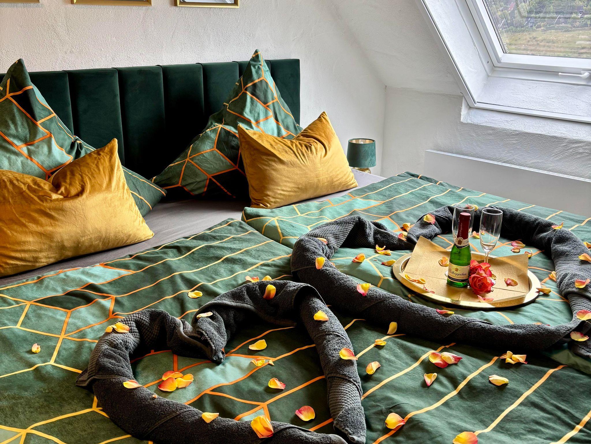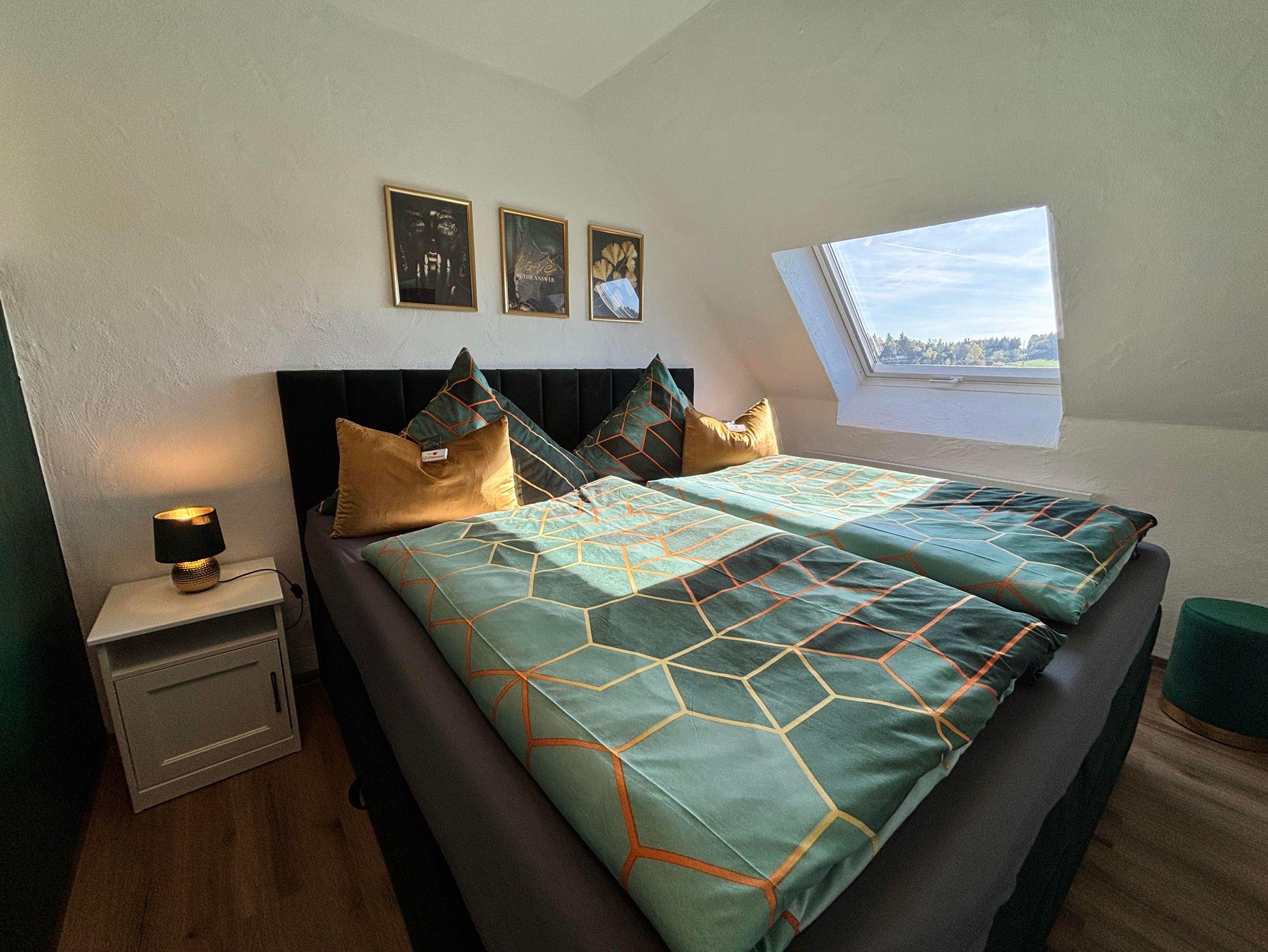 Willkommen im „Big Harmony Room“ – Ihrem privaten Rückzugsort voller Stil, Komfort und zeitloser Eleganz. Auf 16 wohlfühl Quadratmetern im Obergeschoss unserer Pension erwartet Sie ein großzügiges Boxspringbett (2 x 2 Meter), das zum Entspannen und Träumen einlädt; modernste Ausstattung mit Smart-TV sowie ein elegantes Bad mit Dusche und WC. Der Blick aus dem Fenster eröffnet jedem Gast eine ganz eigene, malerische Perspektive auf die umgebende Natur.