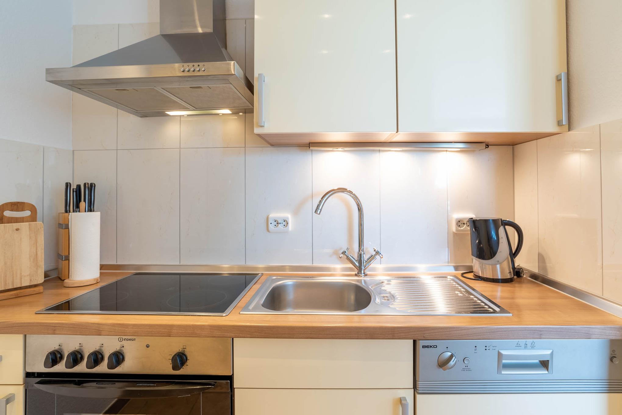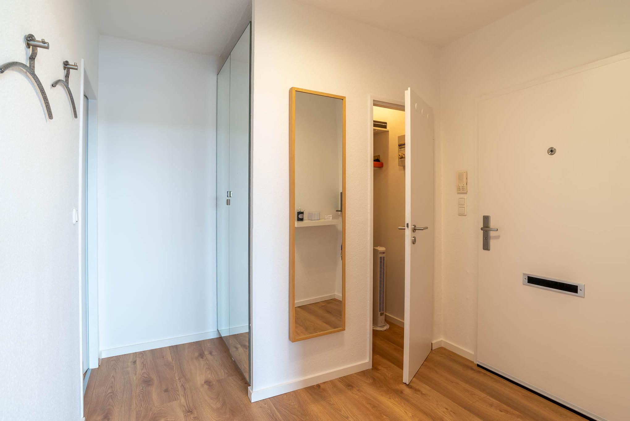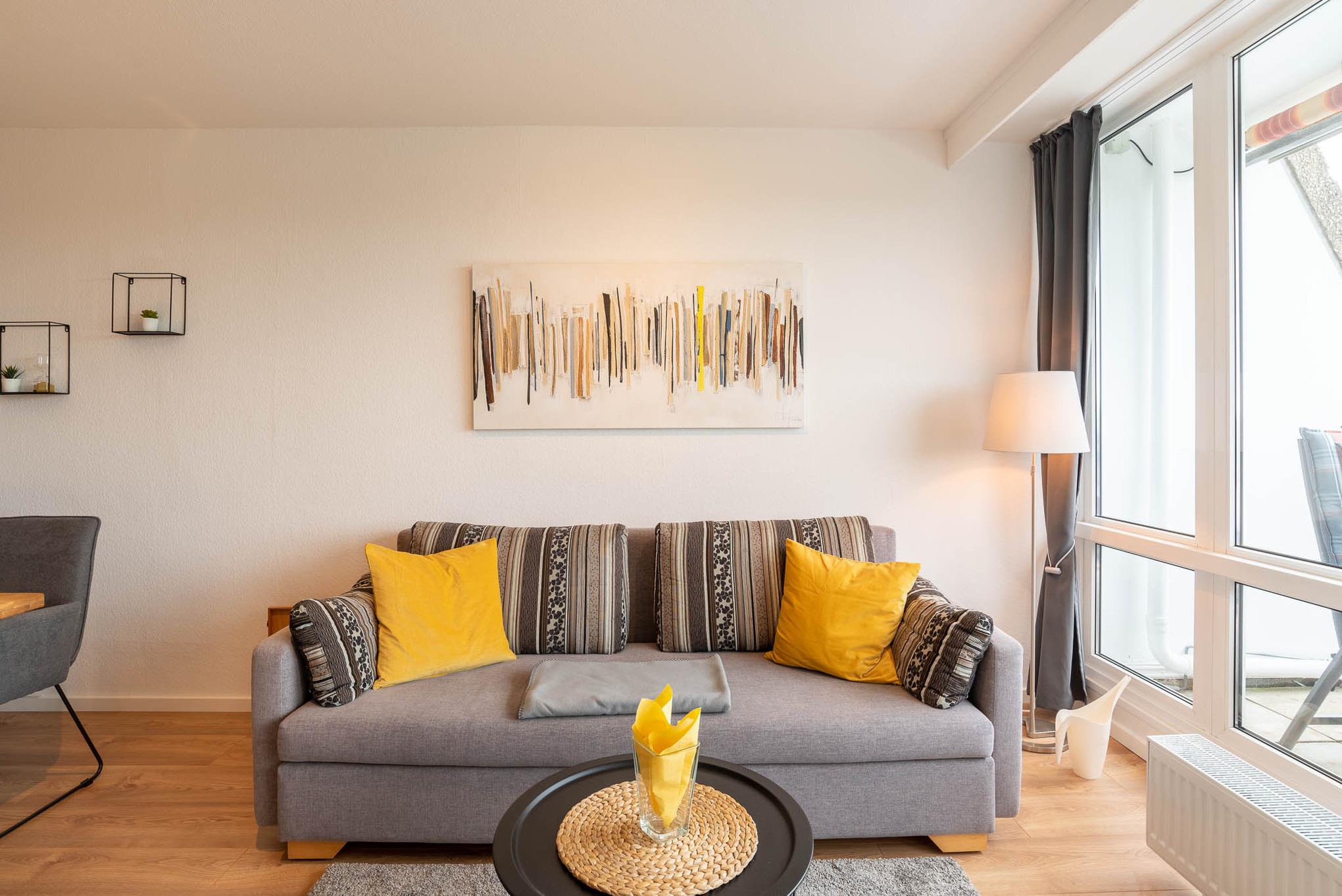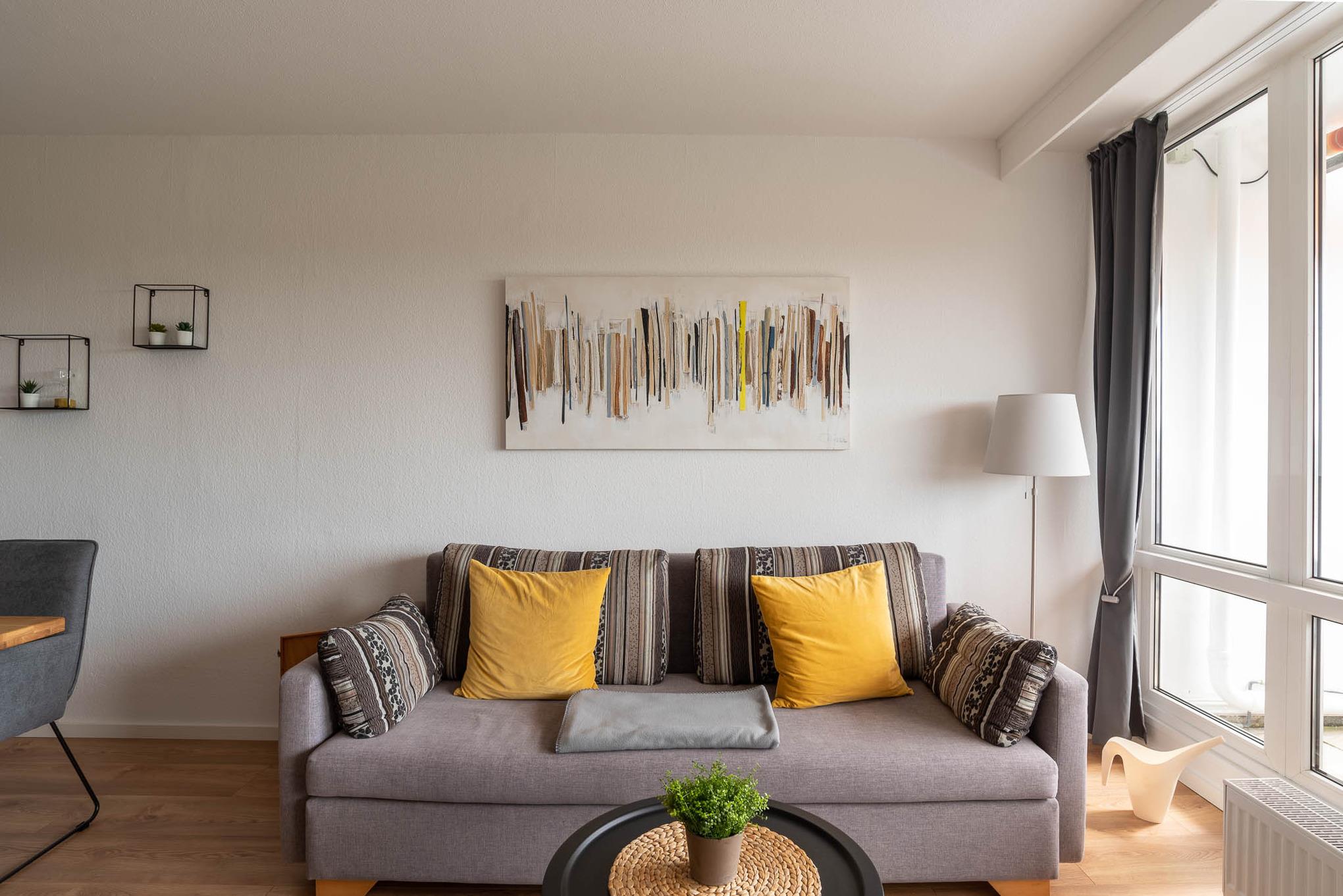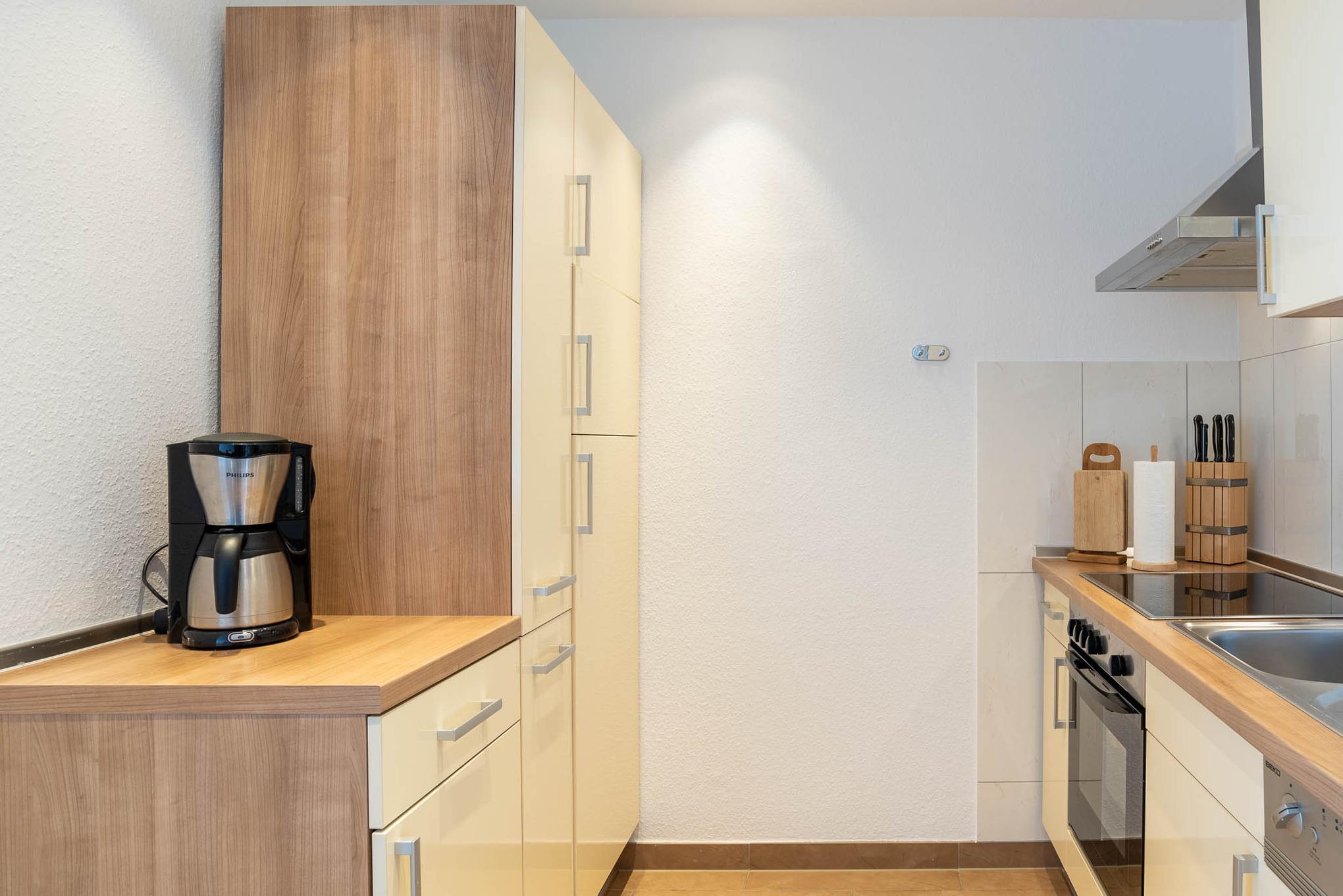 Wir haben „Captain Jack" einen neuen Look verpasst. Cool und modern mit einem Hauch Lounge-Atmosphäre bietet dieses Appartment Ihnen eine angenehme Mischung. Im Schlafzimmer finden Sie ein stylisches Doppelbett 180x200 mit einem Deckenventilator. Das Wohnzimmer verfügt mit seiner ausziehbaren und geräumigen Schlafcouch eine komfortable Schlafgelegenheit für zwei weitere Personen. Die Wohnung verfügt zudem über WLAN. Funktional präsentiert sich die offene Küche: Ceranherd, Backofen, Mikrowelle, Kaffeemaschine – hier finden Sie alles, was Sie zum Kochen brauchen. Auch das Duschbad lässt keine Wünsche offen und bietet Ihnen diverse Möglichkeiten, um stets optimal gepflegt zu sein. Genießen Sie die Walk-in Dusche! Der Flur der Ferienwohnung verfügt über eine Abstellkammer und einen Spiegelkleiderschrank.