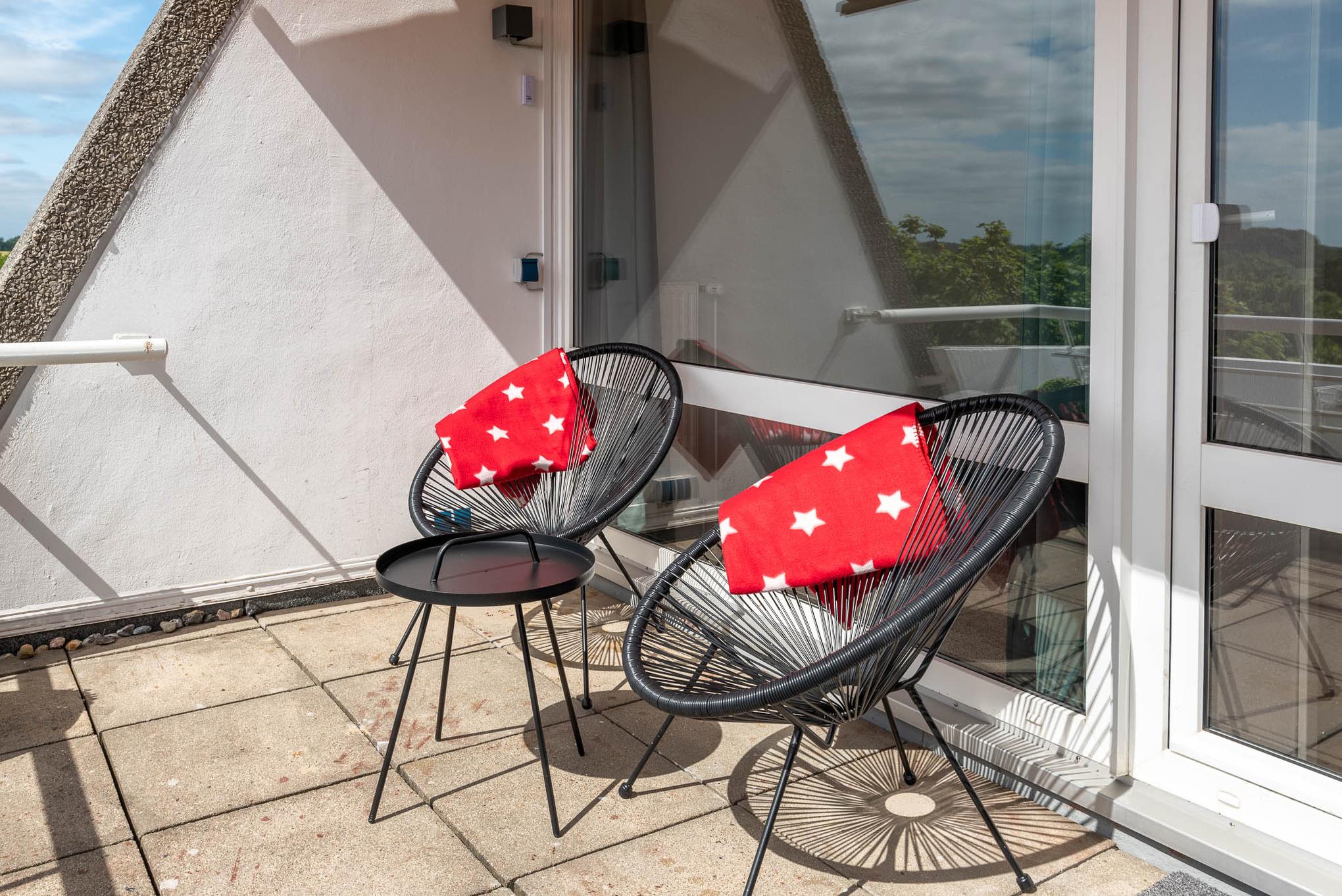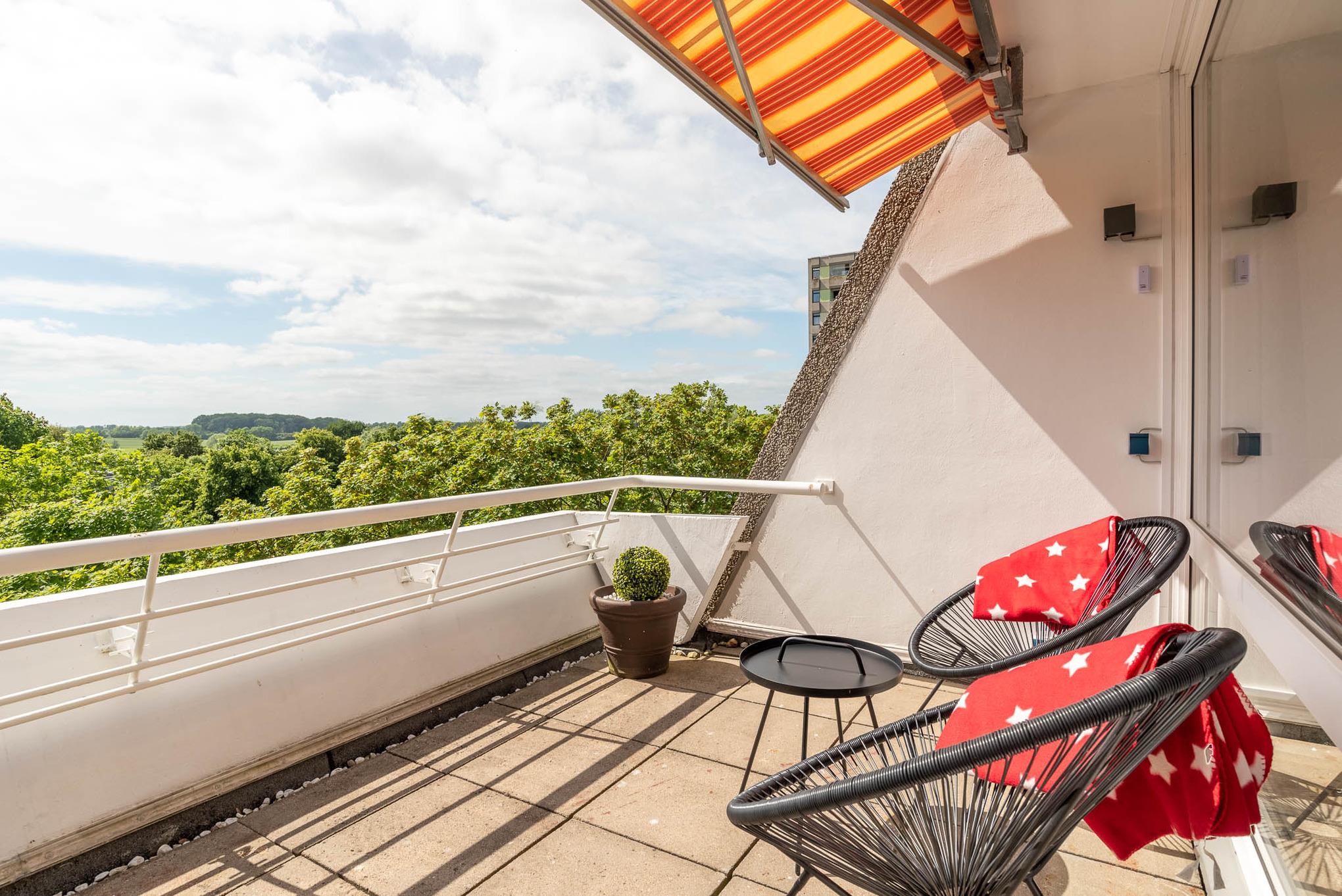 Auf dem großen 12 qm großen Balkon können Sie die Abendsonne genießen. Der Balkon ist komplett mit elektrischer Markise, Tisch und Stühlen ausgestattet. Kissenbezüge liegen in der Wohnung für Sie bereit.