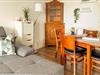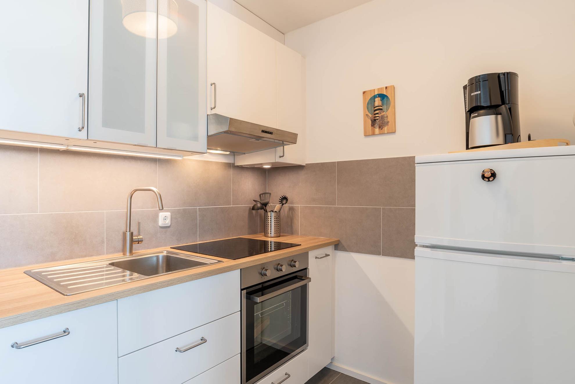 Vom Flur aus gelangen Sie in das gemütliche Wohn- und Esszimmer. Direkt am Eingang befindet sich die offene Küche. Mit ihrer umfangreichen Ausstattung werden beim Kochen keine Wünsche offengelassen. Die Einbauküche ist mit einem Backofen, Ceran-Kochfeld, Kühlschrank mit integriertem Gefrierfach sowie einer Geschirrspülmaschine ausgestattet. Gegenüber von der Küchenecke befindet sich ein schöner Esstisch mit Platz und Stühlen für 3 Personen.