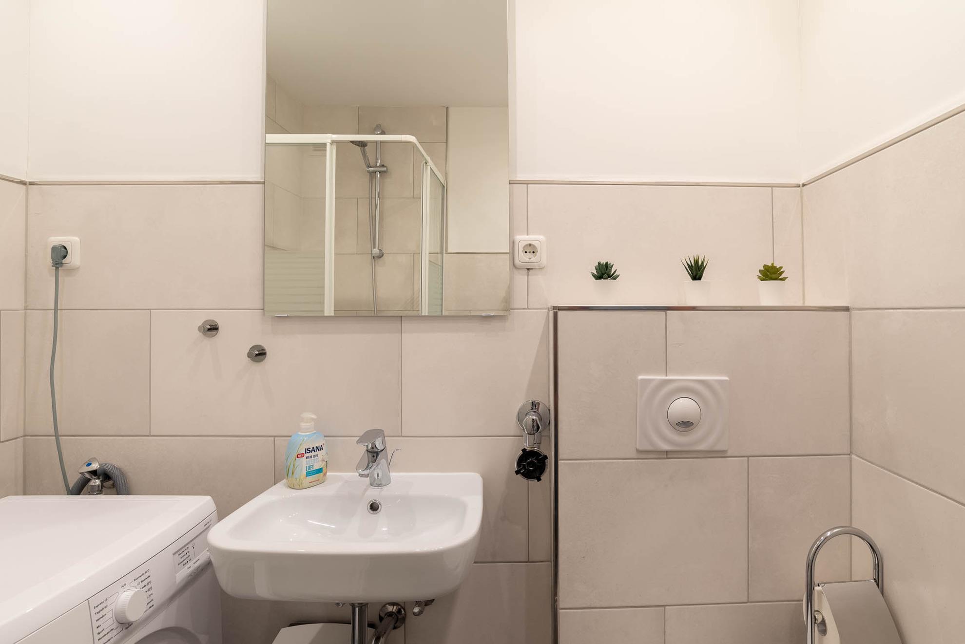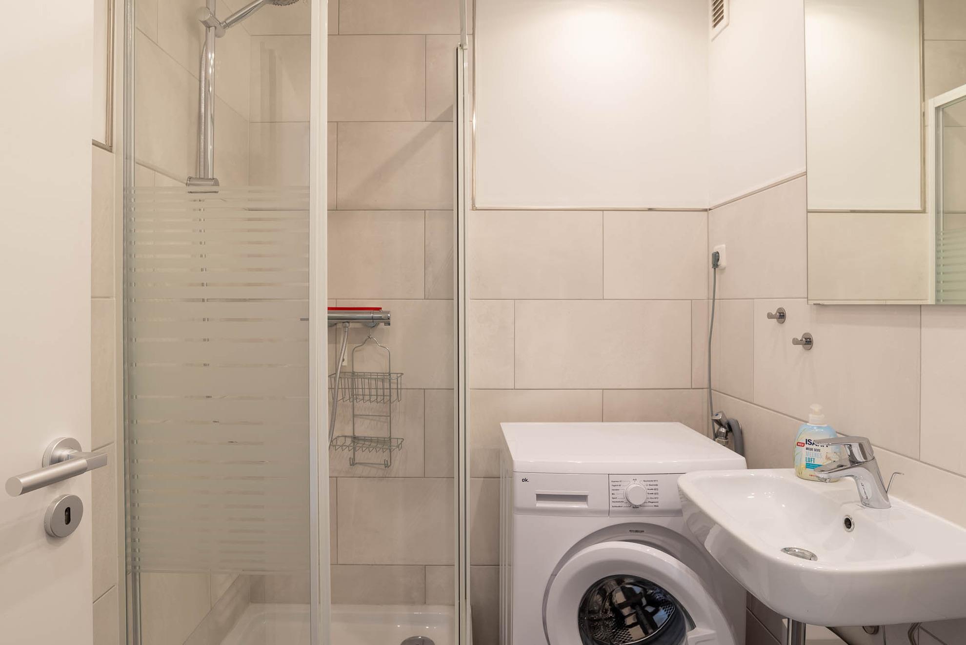 Neben einer kleinen Abstellkammer im Flur, befindet sich in der Ferienwohnung auch noch ein hochwertiges, modernes Badezimmer. Es verfügt neben einer Dusche, einem WC und Waschbecken auch über eine Handtuchheizung. Eine weitere Besonderheit in diesem Badezimmer ist die einsatzbereite Waschmaschine.