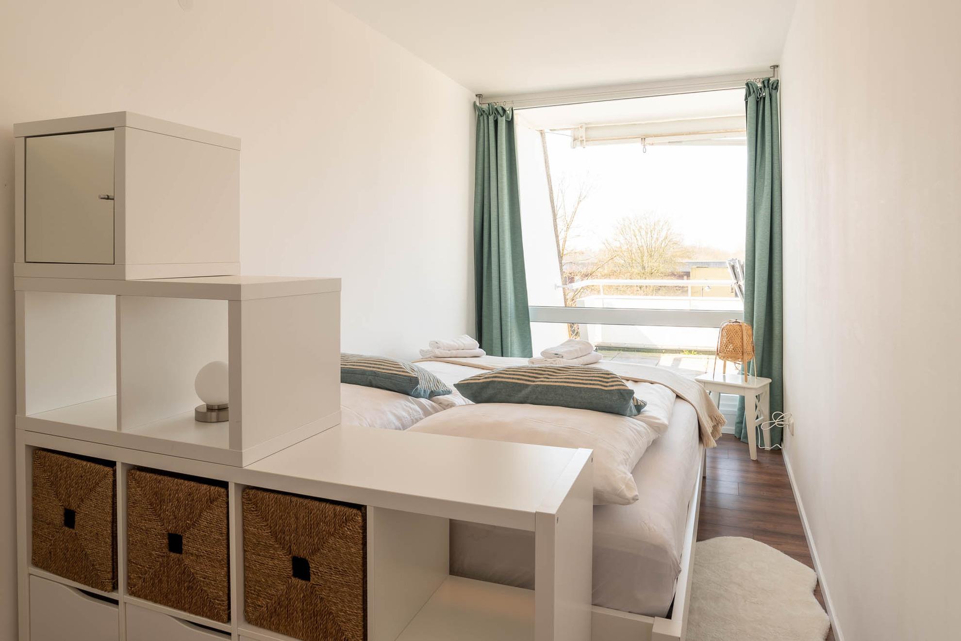 Vom Wohn- und Essbereich gelangen Sie in das Schlafzimmer. Ein halboffenes Regal bietet einen kleinen Sichtschutz auf das gemütliche Bett (Maße 160 x 200 cm) sowie genügend Stauraum für Ihr Gepäck. Auch im Schlafzimmer sind bodentiefe Fenster und Vorhänge vorhanden.