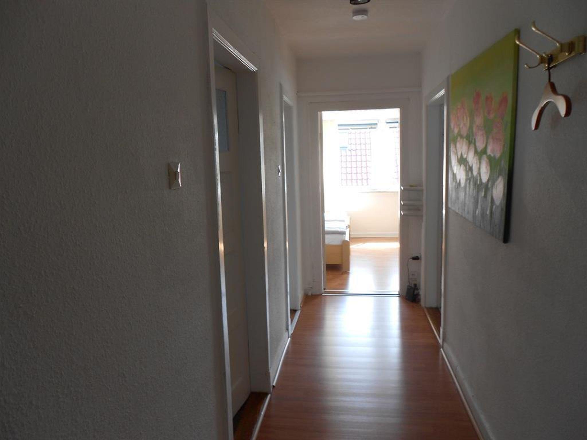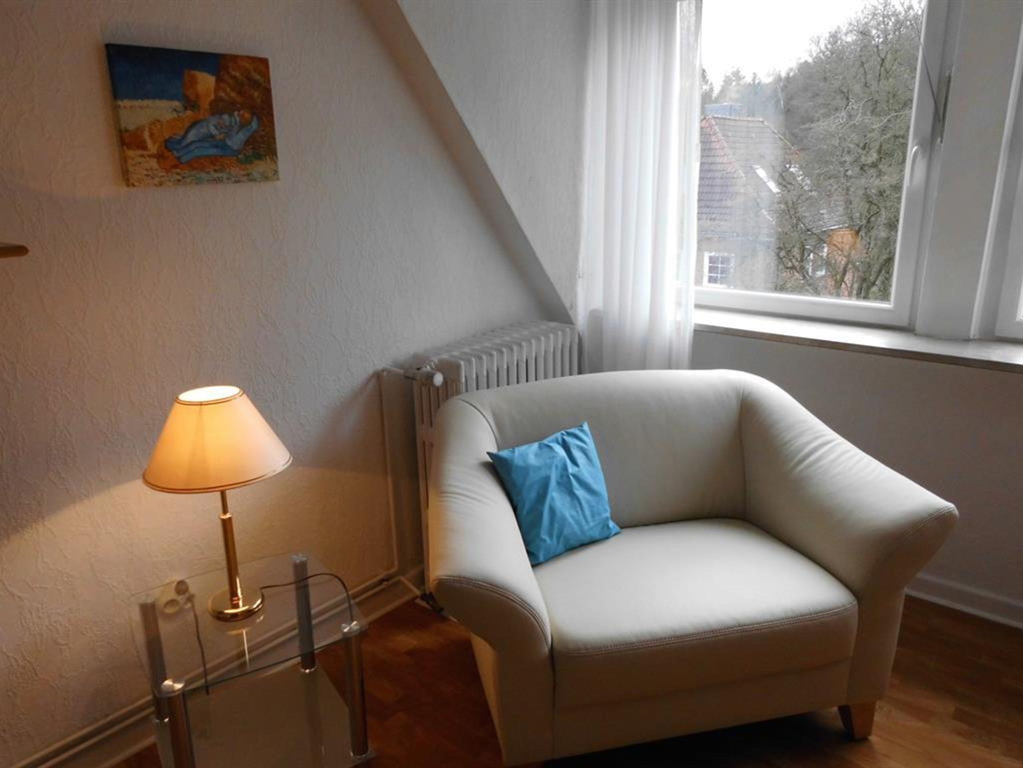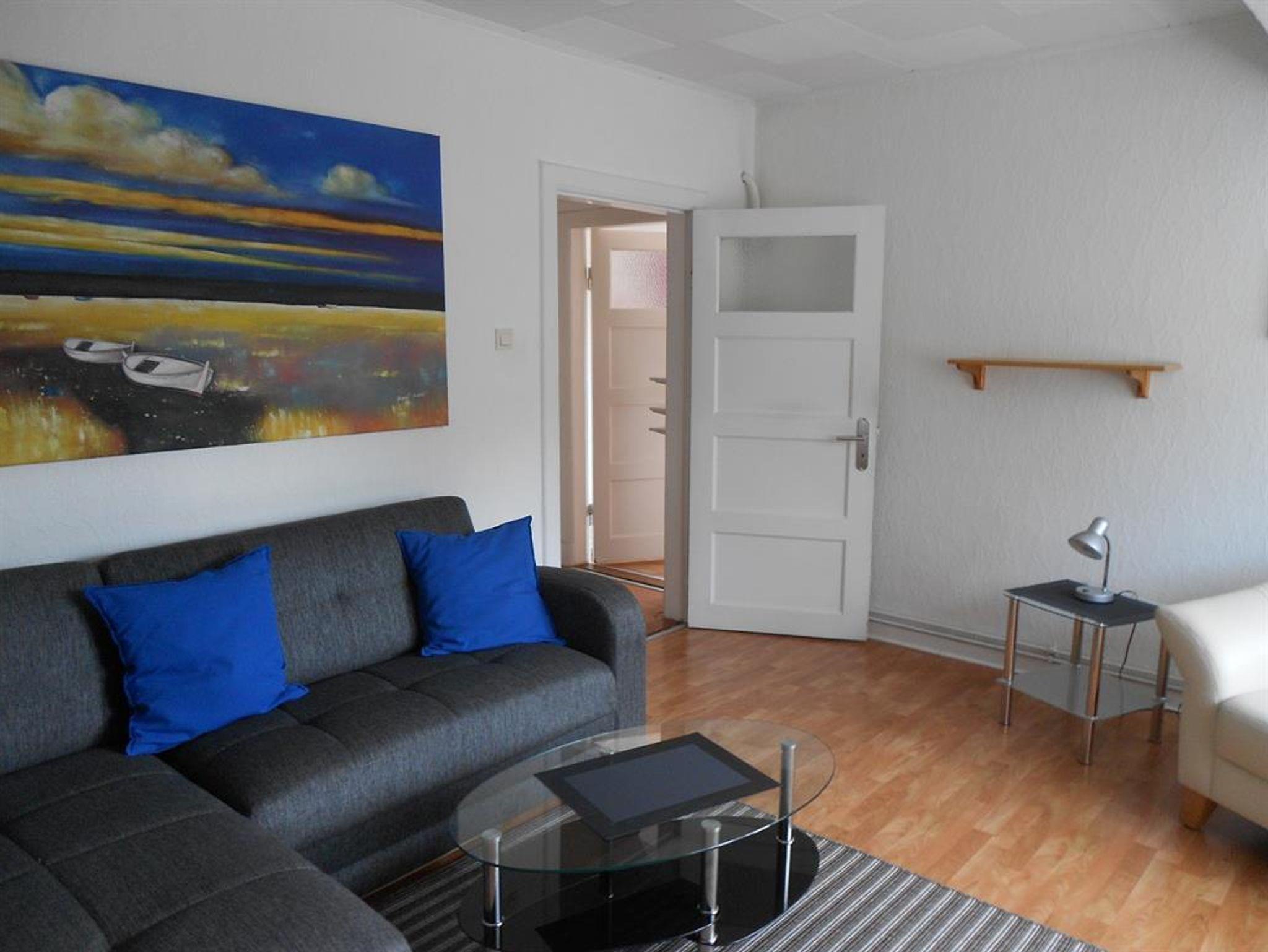 Die Ferienwohnung liegt im 2. OG eines kleinen Mehrfamilienhauses. Sowohl das Wohnzimmer, als auch das Schlafzimmer sind lichtdurchflutet. Das Schlafzimmer ist mit 2 Einzelbetten (90x200, verstellbares Lattenrost, Federkernmatratze), Nachtschränken und einem großen Kleiderschrank ausgestattet. Im Wohnzimmer befindet sich ein Ecksofa mit Schlaffunktion, Couchtisch, Anrichte, LED-Fernseher (DVB-T), Musikanlage und einem gemütlichen Sessel mit kleinem Tisch. Das Bad ist mit einer Badewanne ausgestattet. Die Küche ist ausgestattet mit einer kleinen Einbauzeile, Essplatz (Tisch mit Stühlen), Herd mit Backofen, Mikrowelle mit Grill, Kühlschrank mit Gefrierfach, Kaffeemaschine, Wasserkocher und Toaster. Das Wohnzimmer, das Schlafzimmer und der Flur sind mit Laminat ausgelegt.