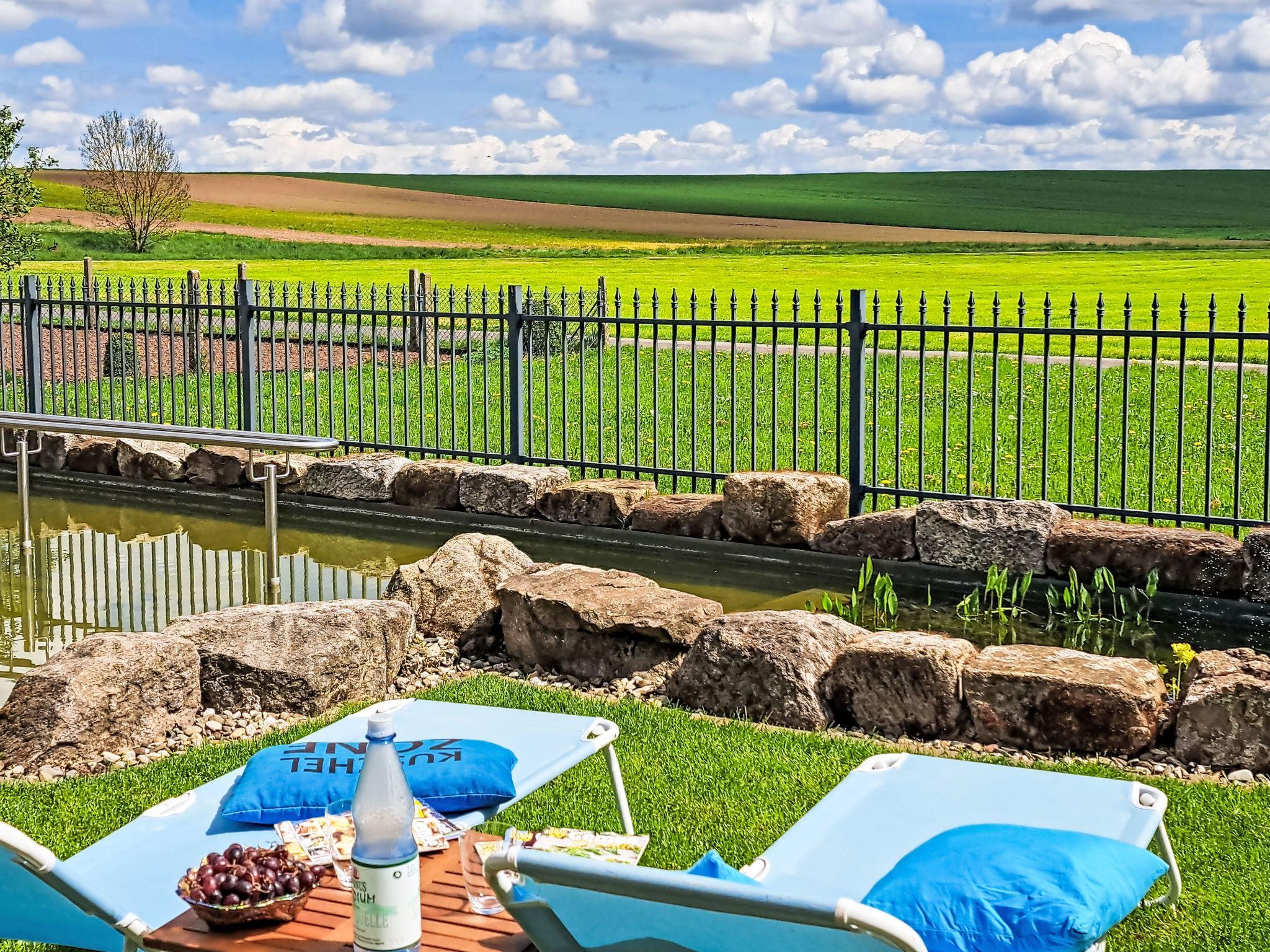 Hier haben Sie die kühle Magie der eigenen Naturpool als Kneippanlage, Kinderschwimmbecken und als Verweilort am und im Wasser in den warmen Jahreszeiten. Das Gelände mit Hof, Gebetslabyrinth, Terrasse, 2 Grills, kleine Wiesen und Kneippgarten haben Sie für sich allein. Zu jeder Jahreszeit sind Sauna, Holzofen im Wohnzimmer, Ausblicke in die Landschaft, Rad- und Wanderwege auch einen Wohltat. Kimmelsbacher Hof im Naturpark Haßberge ist am äußersten Rande des Dorfes in der Umgebung von geomantischen Kraftorten, Naturschutzgebiete, aber auch von historische Schlösse und Nutzlandschaft, aus der unsere Nahrung kommt, umgeben.