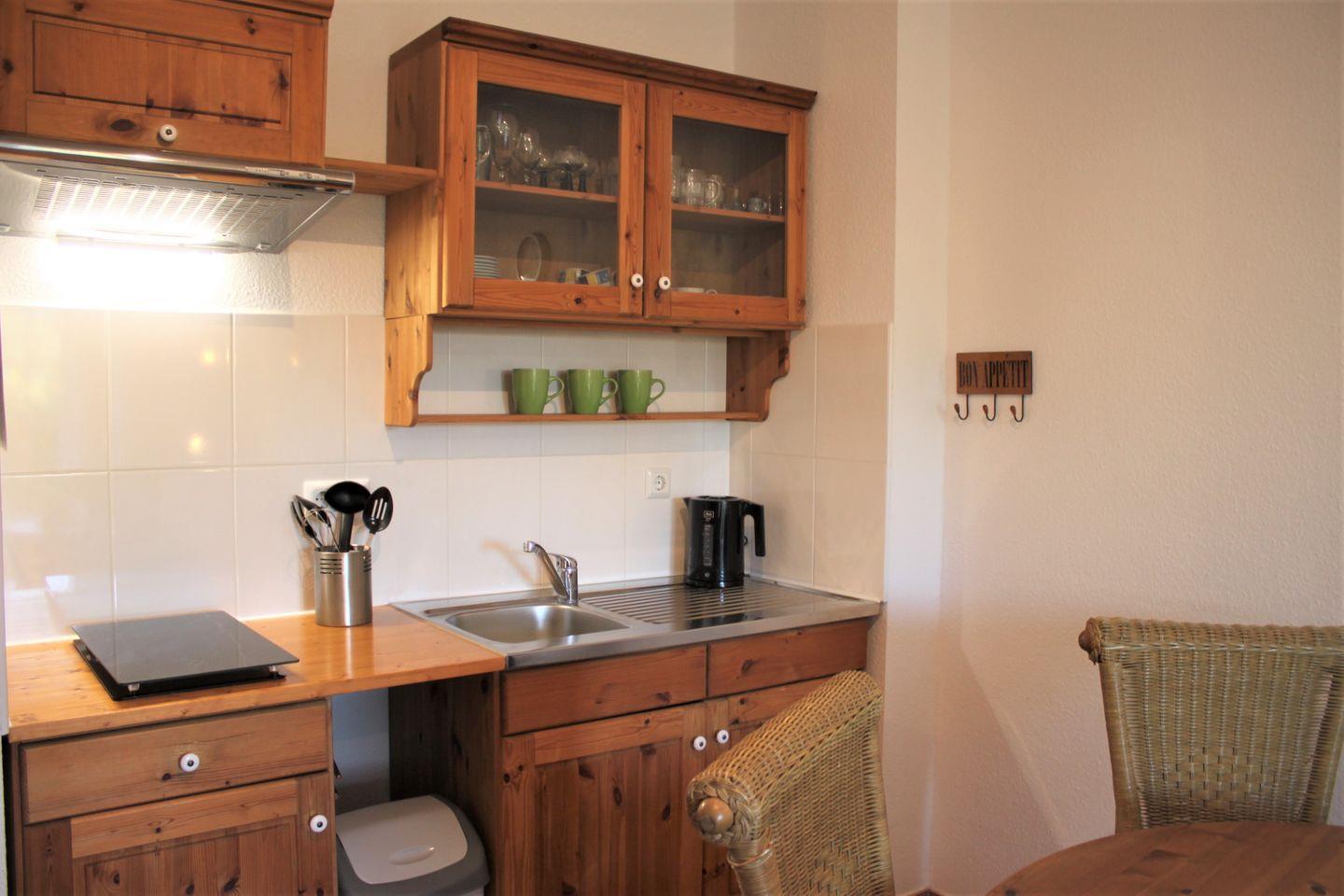 Die integrierte Küchenzeile verfügt über einen Kühlschrank mit Gefrierfach, ein kleines Kochfeld, eine Kaffeemaschine, Wasserkocher und einiges mehr.
