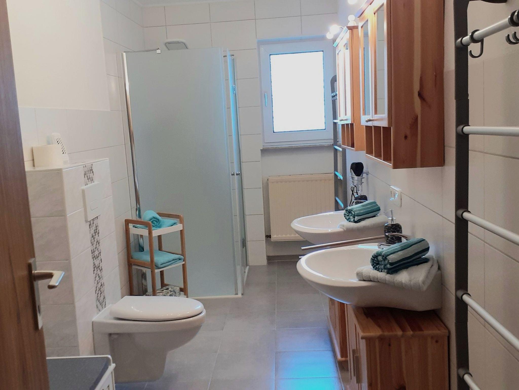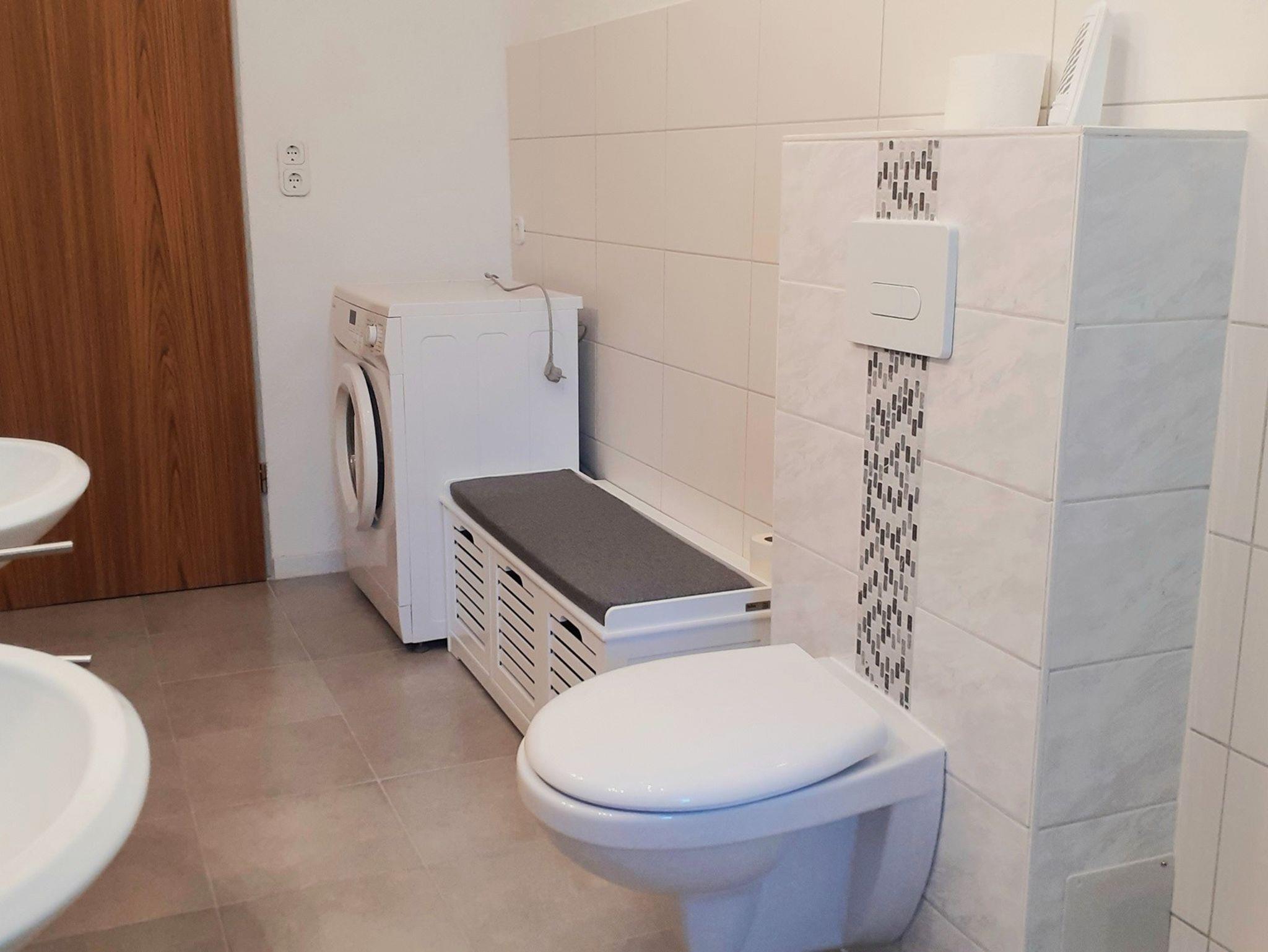 Ein Bad mit Dusche, WC, Clopapier, zwei Waschbecken, Waschmaschine und Waschpulver sind vorhanden. Ein weiteres WC befindet sich im Flur außerhalb der Wohnung.