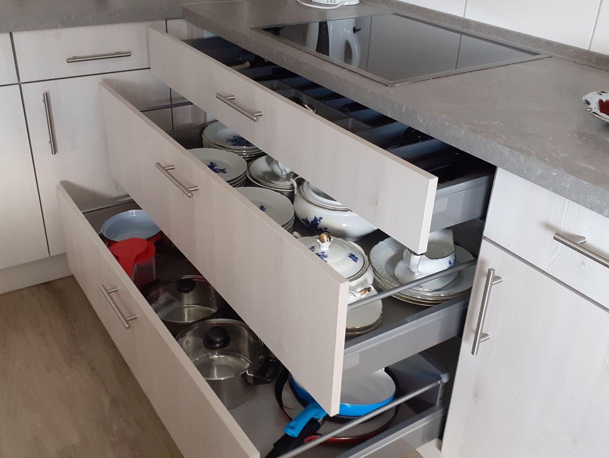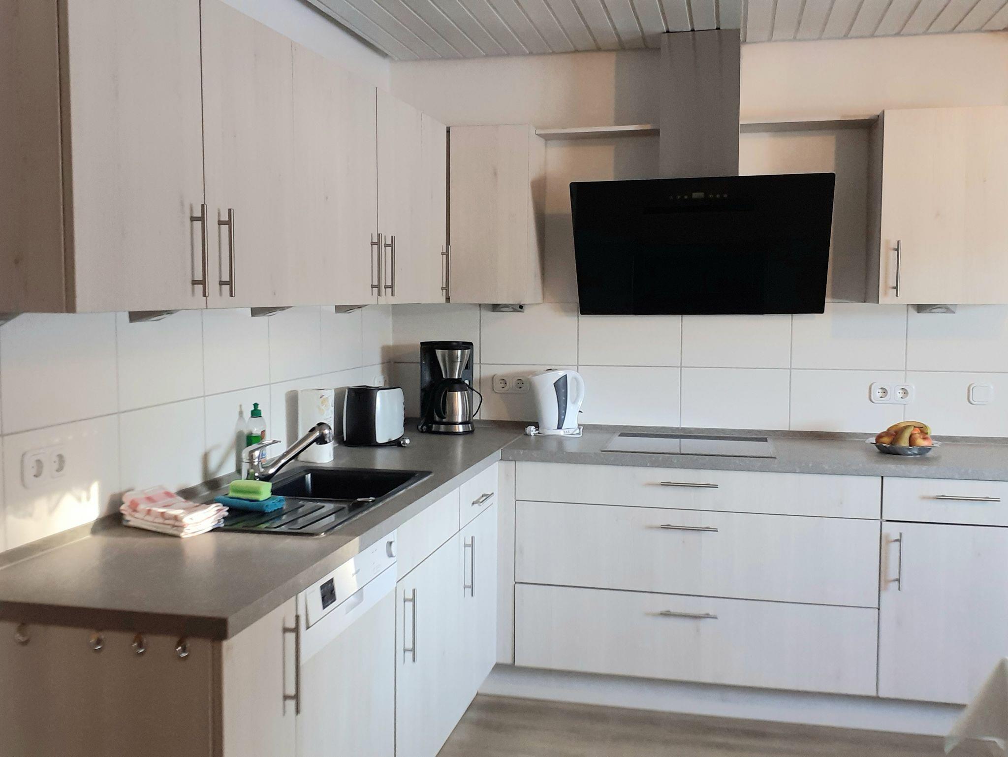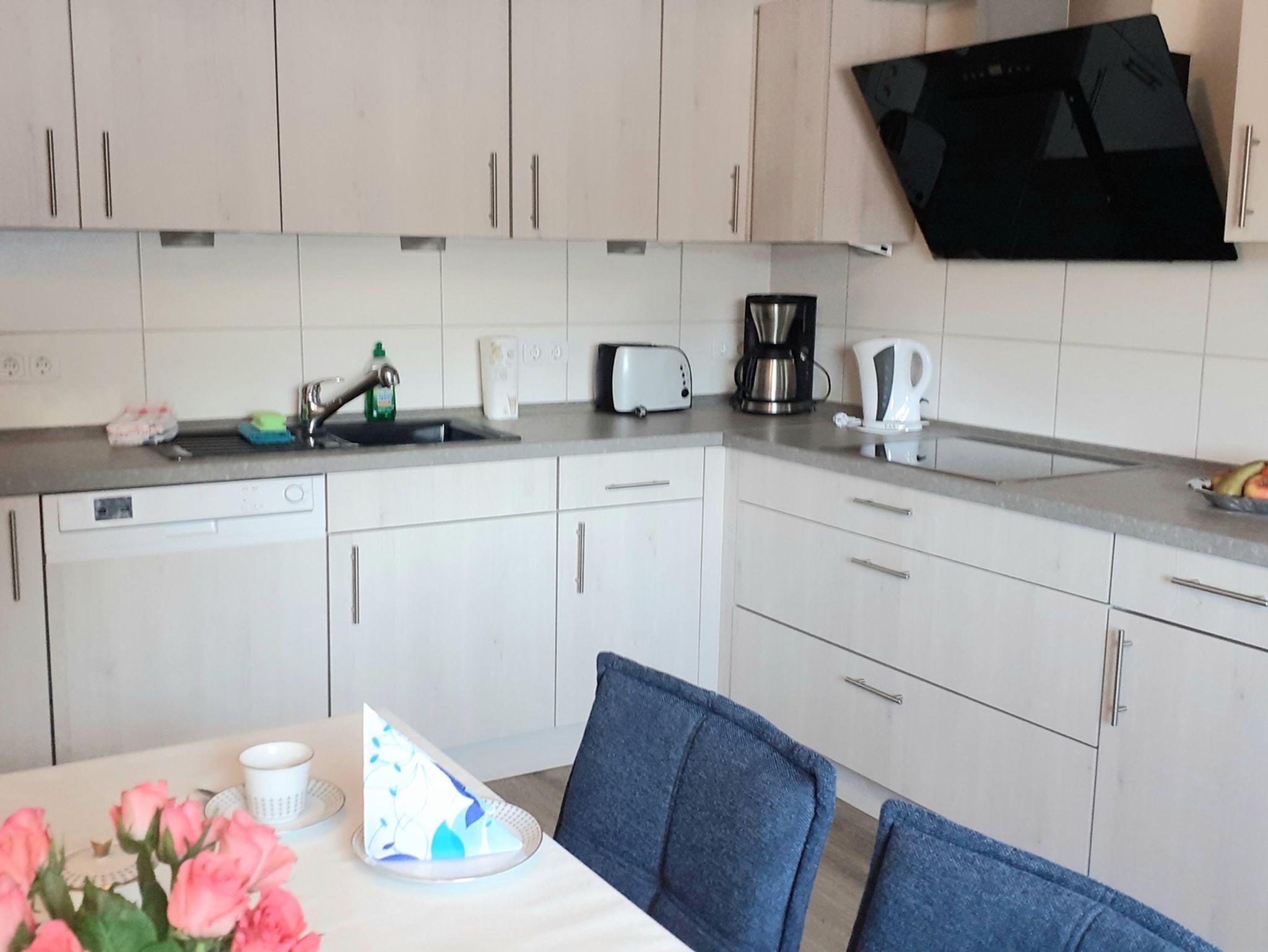 Die Küche ist mit Herd, Backofen, Mikrowelle, Wasserkocher, Kühlschrank mit Gefrierfach, Kaffeemaschine, Geschirrspüler, ausreichend Geschirr, Töpfe, Besteck und alles was man zum Kochen benötigt ausgestattet. Spülmittel und Geschirrtücher werden gestellt.