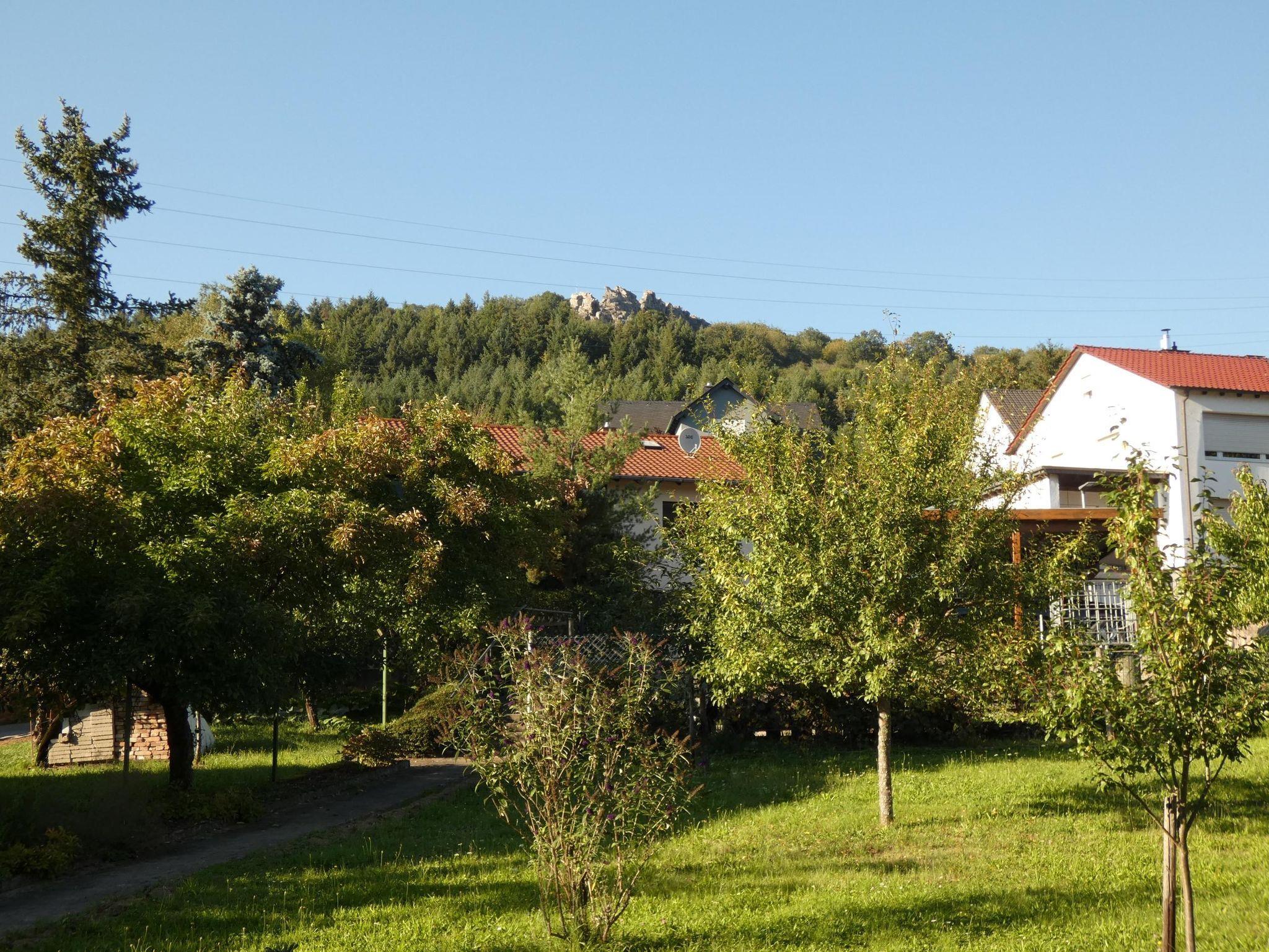 Gartenmöbel sind für die Terrasse und den Balkon vorhanden. Im Garten gibt es je nach Jahreszeit verschiedene Obstsorten wie Himbeeren, Brombeeren, Äpfel, Mirabellen und Kirschen. Blick auf die Kirner Dolomiten und die Kyrburg.